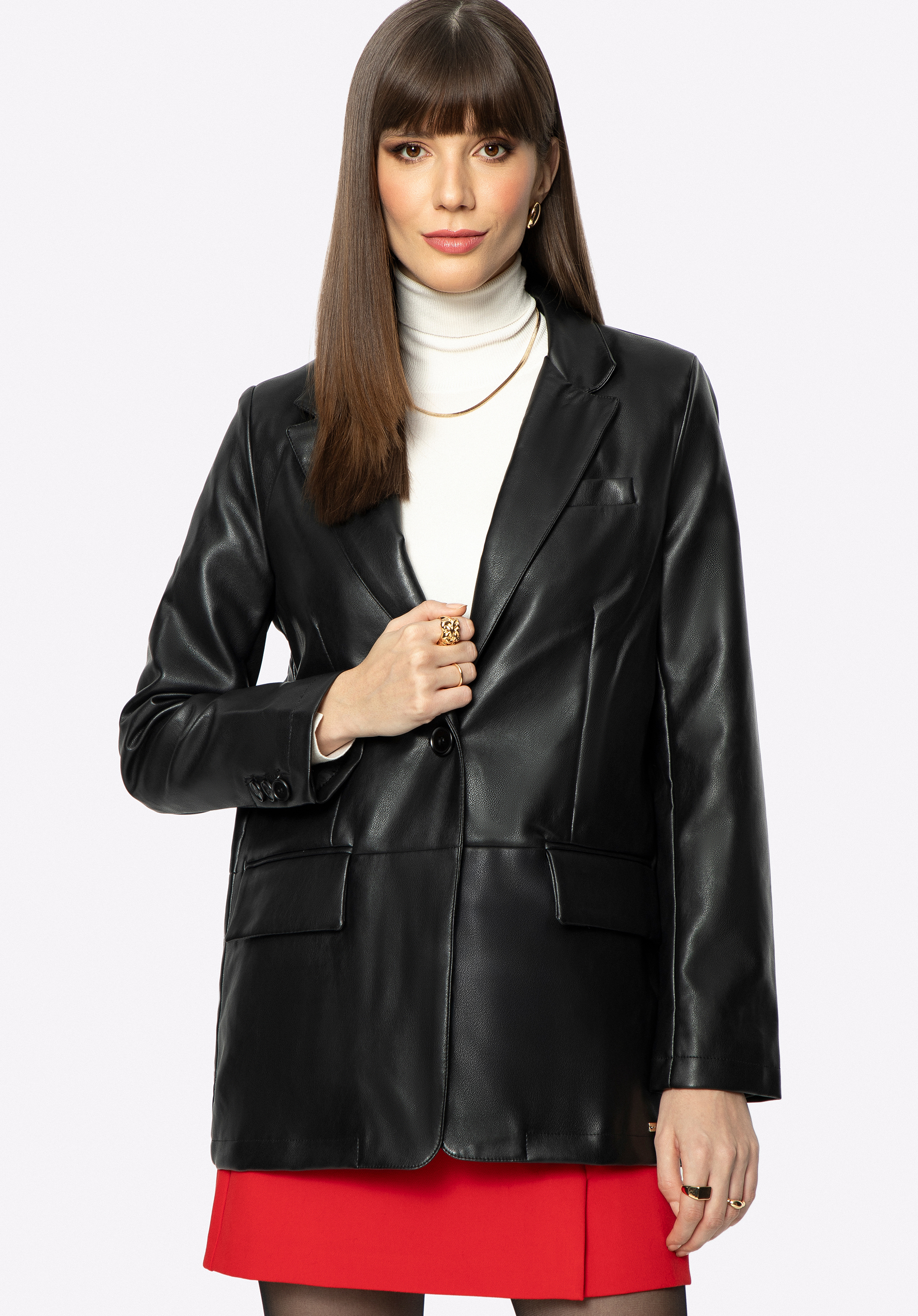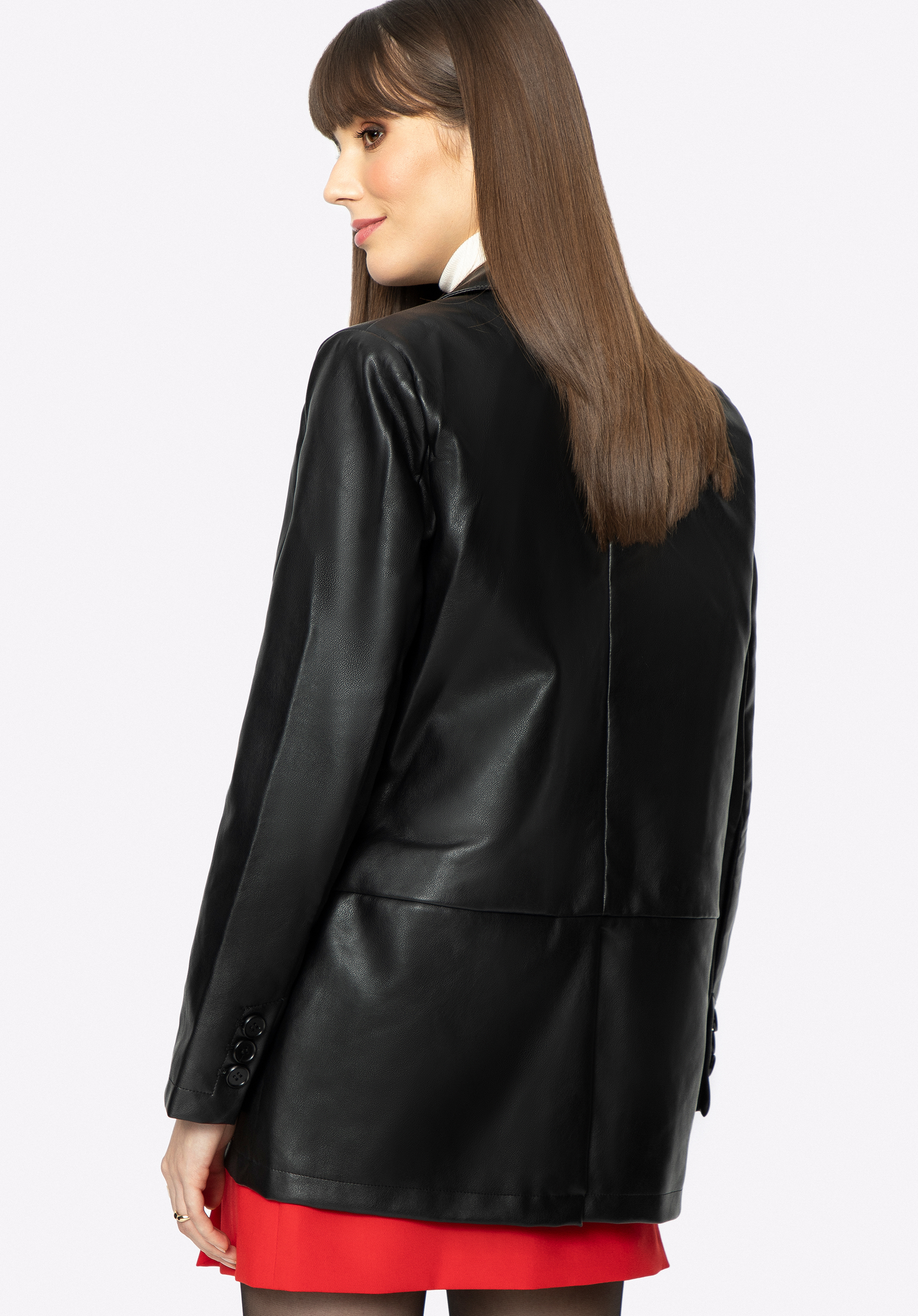 Prosty fason z ozdobnie rozciętym tyłem urozmaici każdą Twoją stylizację, zarówno ulubione dżinsy, jak i skórzaną mini. Prosta damska marynarka z ekoskóry to ponadczasowy dodatek, który możesz nosić przez wiele sezonów.