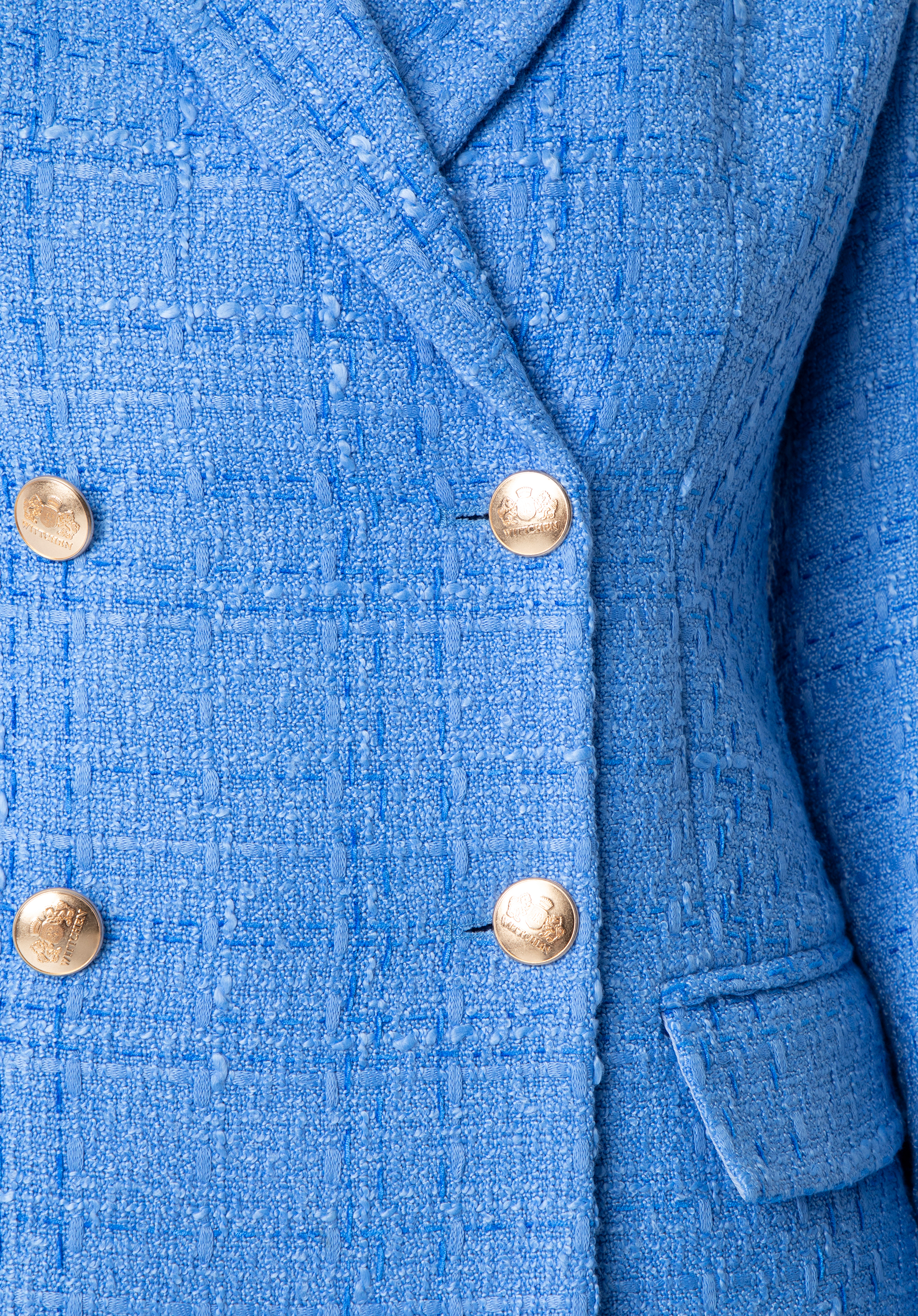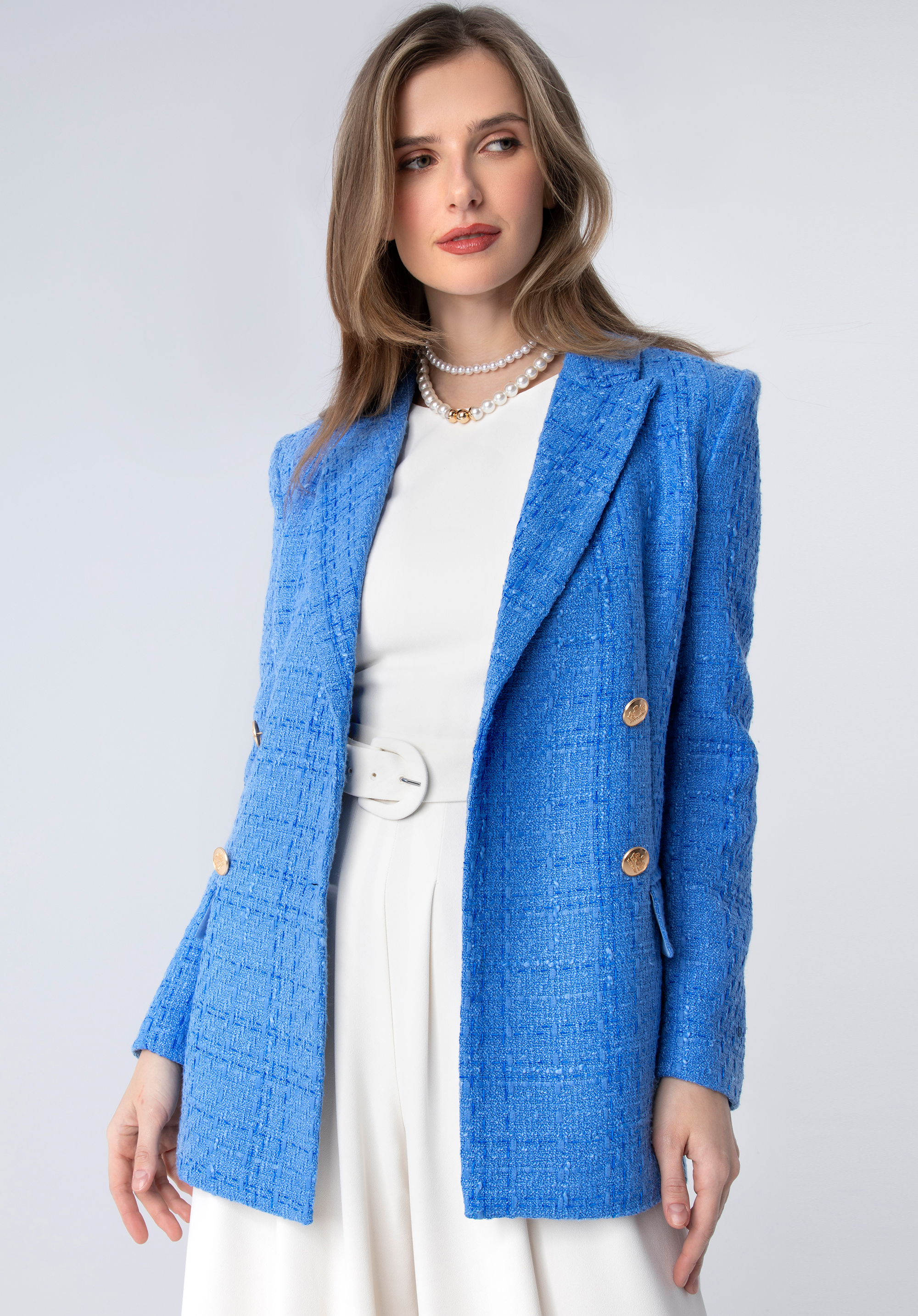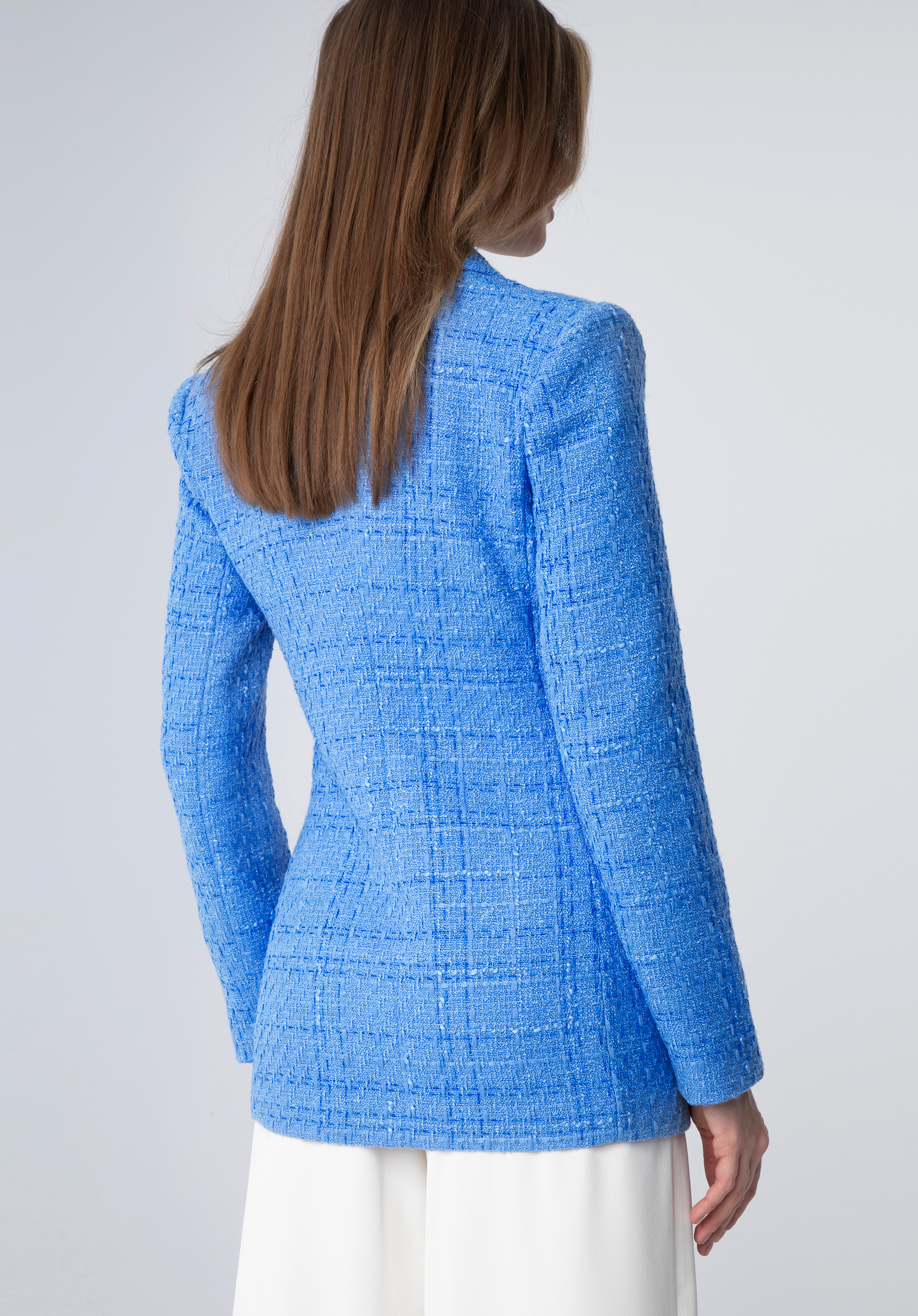 ozdobny splot boucle, który wspaniale prezentuje się w zestawieniu z gładkimi, monochromatycznymi stylizacjami. Dłuższy przód i krótszy tył oraz taliowanie w pasie to cechy, które dodatkowo podkreślają sylwetkę. Mając w szafie taką klasyczną perełkę, zapomnisz o porannym dylemacie z doborem stroju.