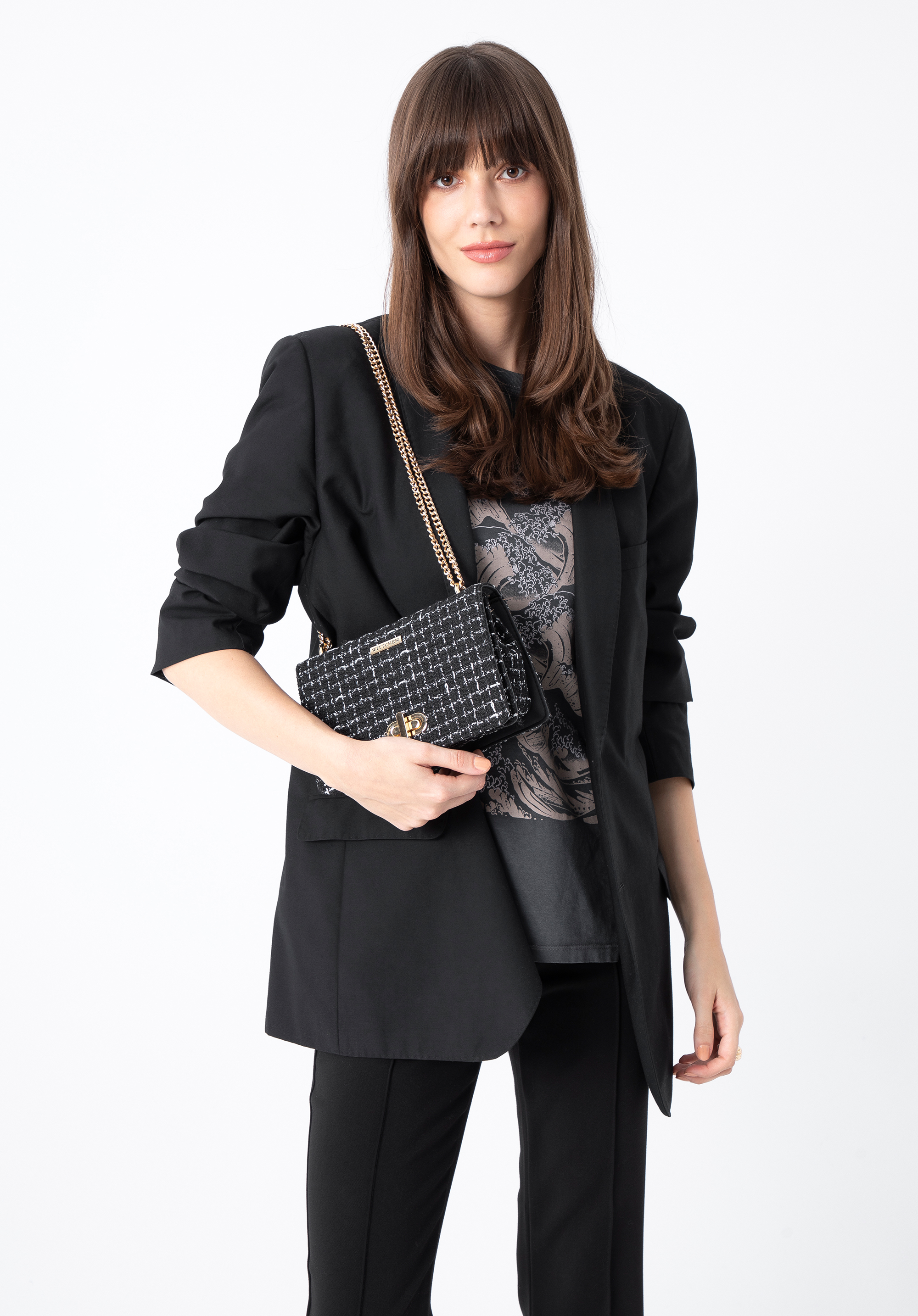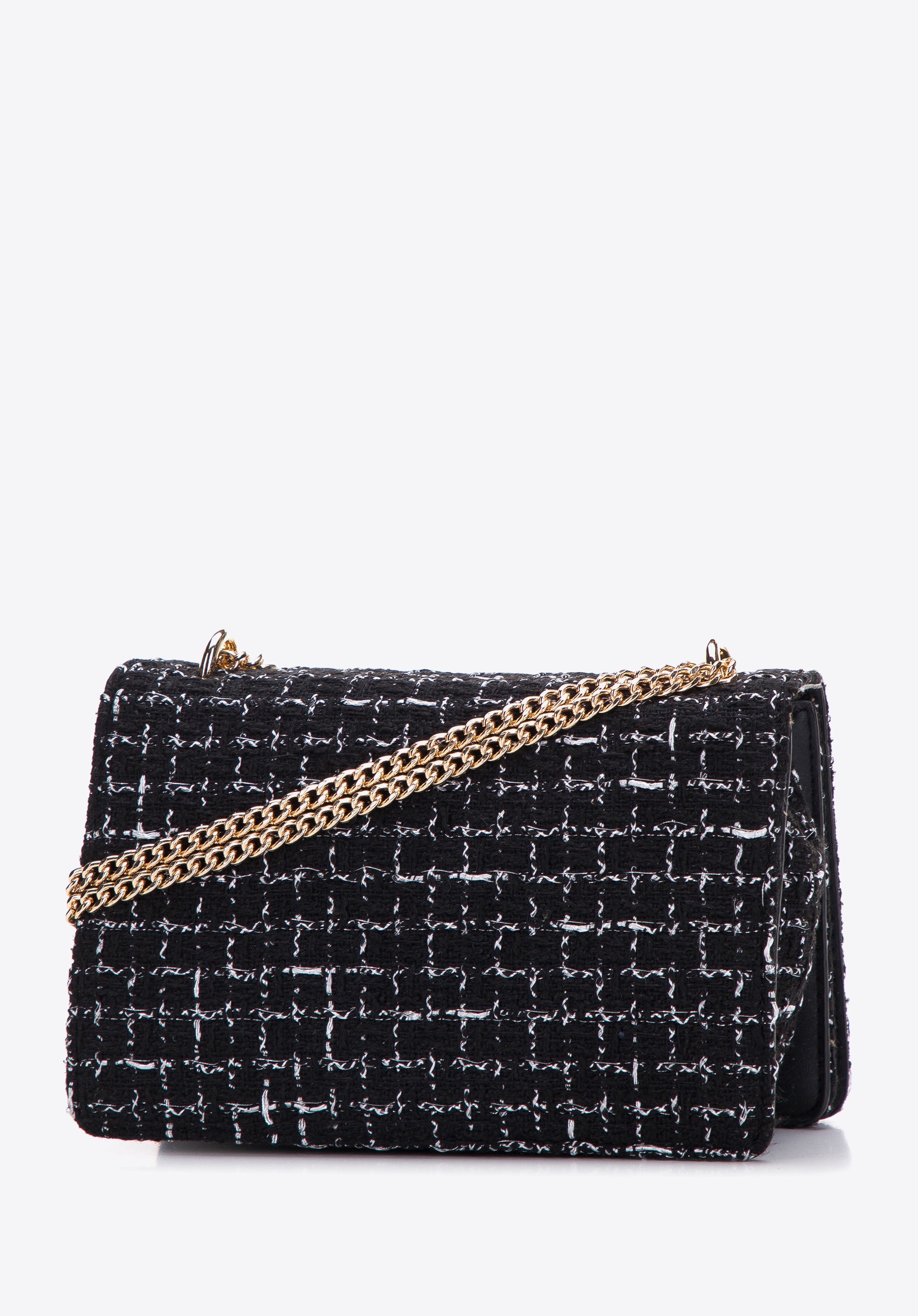 błyszcząca, przekręcana klamra. W środku zmieścisz portfel, telefon, kilka kosmetyków i chusteczki – w sam raz na eleganckie przyjęcie, do teatru lub na kawę z przyjaciółką. Noś ją do gładkich stylizacji i wyeksponuj wzór lub połącz z ulubionymi dżinsami i koszulą. Damska minitorebka ze wstawką z tkaniny bouclé to ponadczasowy dodatek, który wprowadzi nowy styl do Twojej szafy.