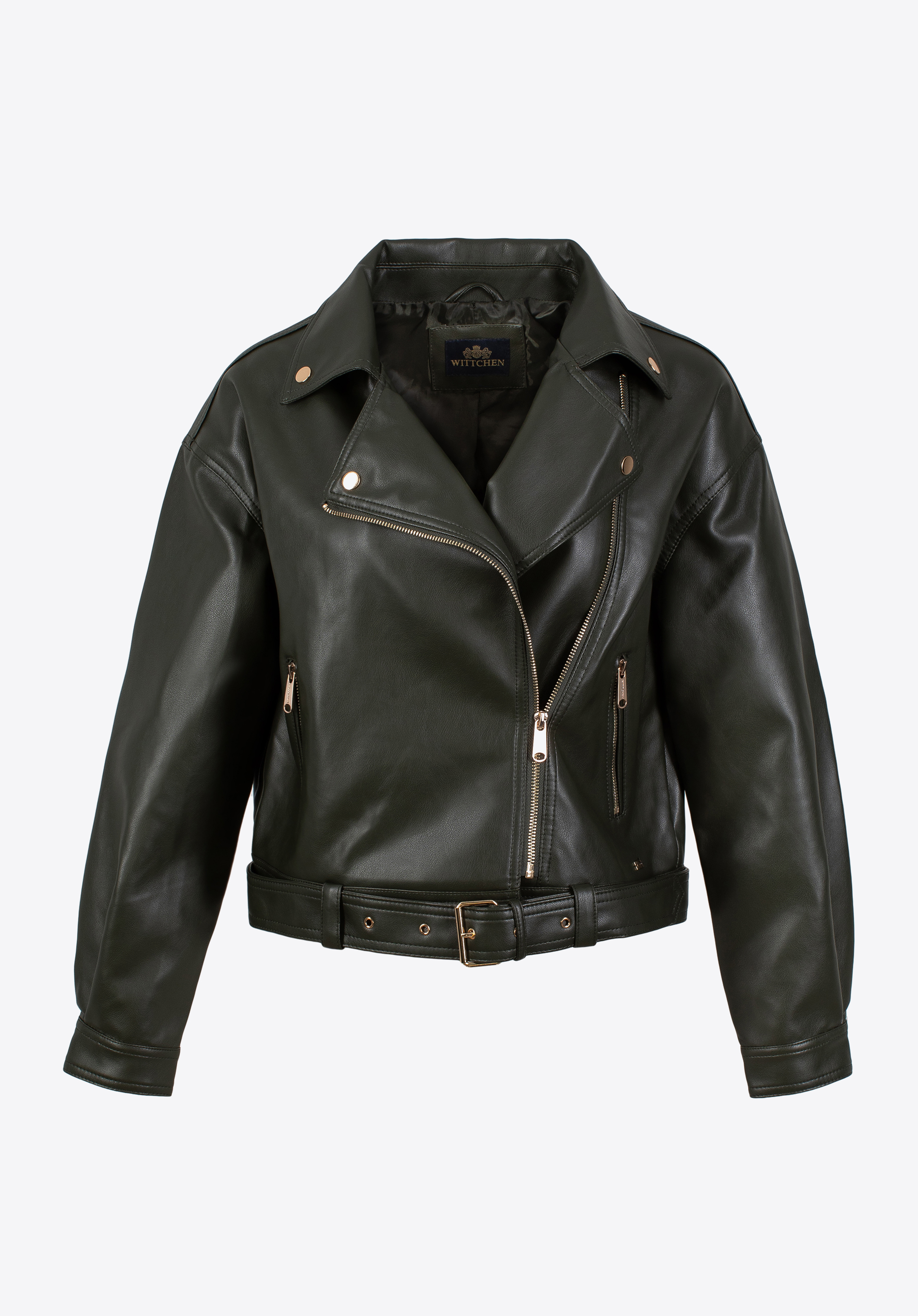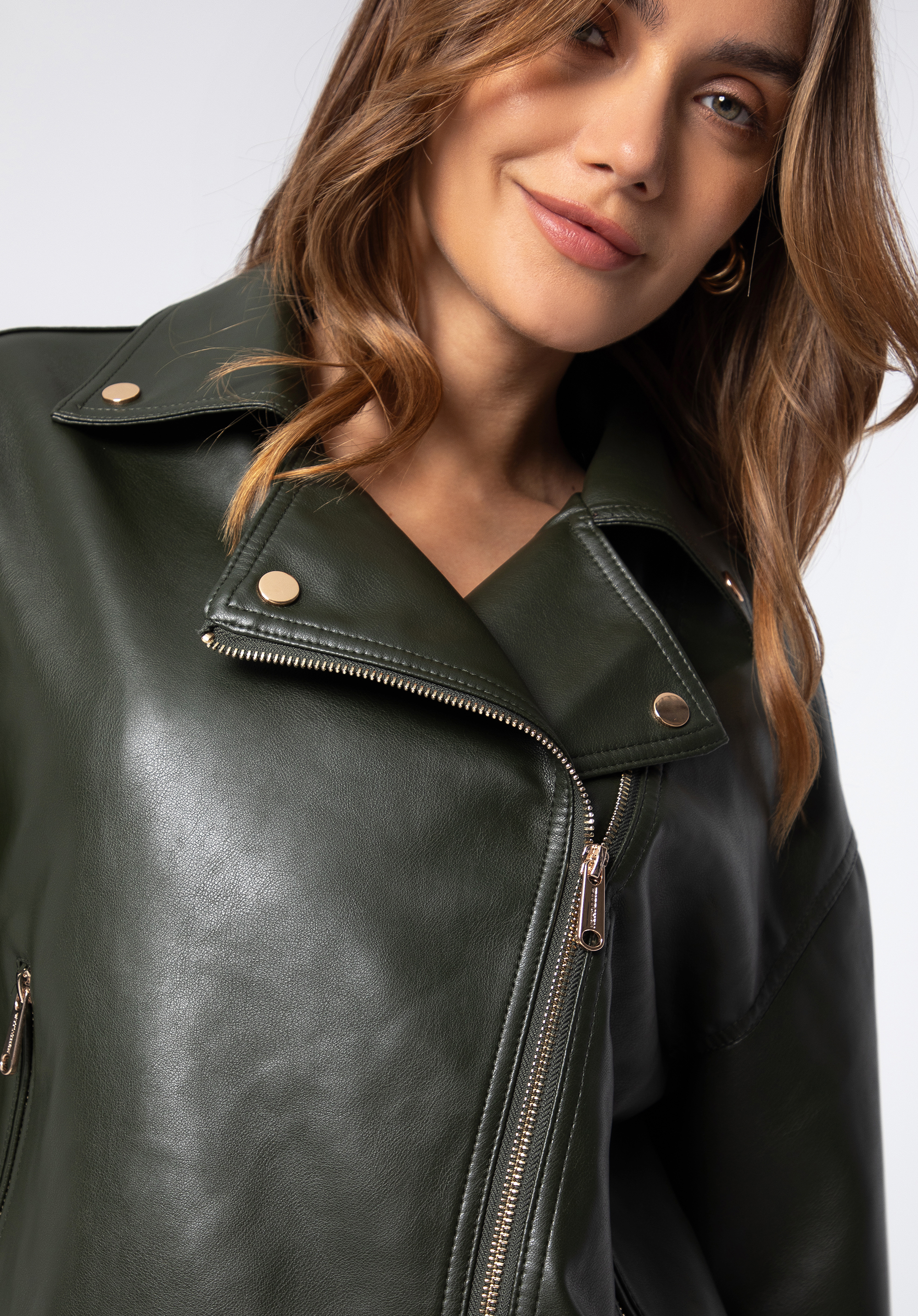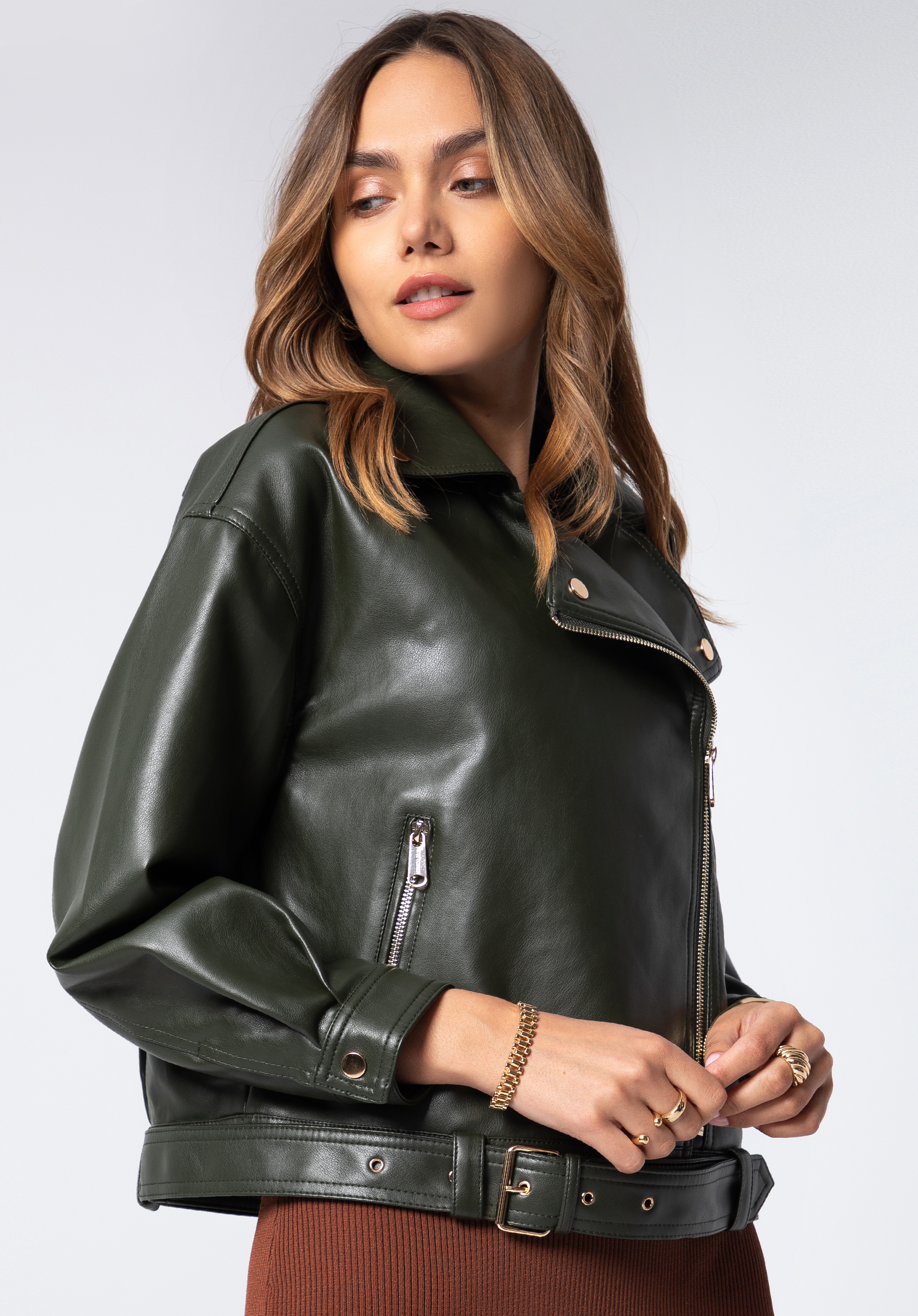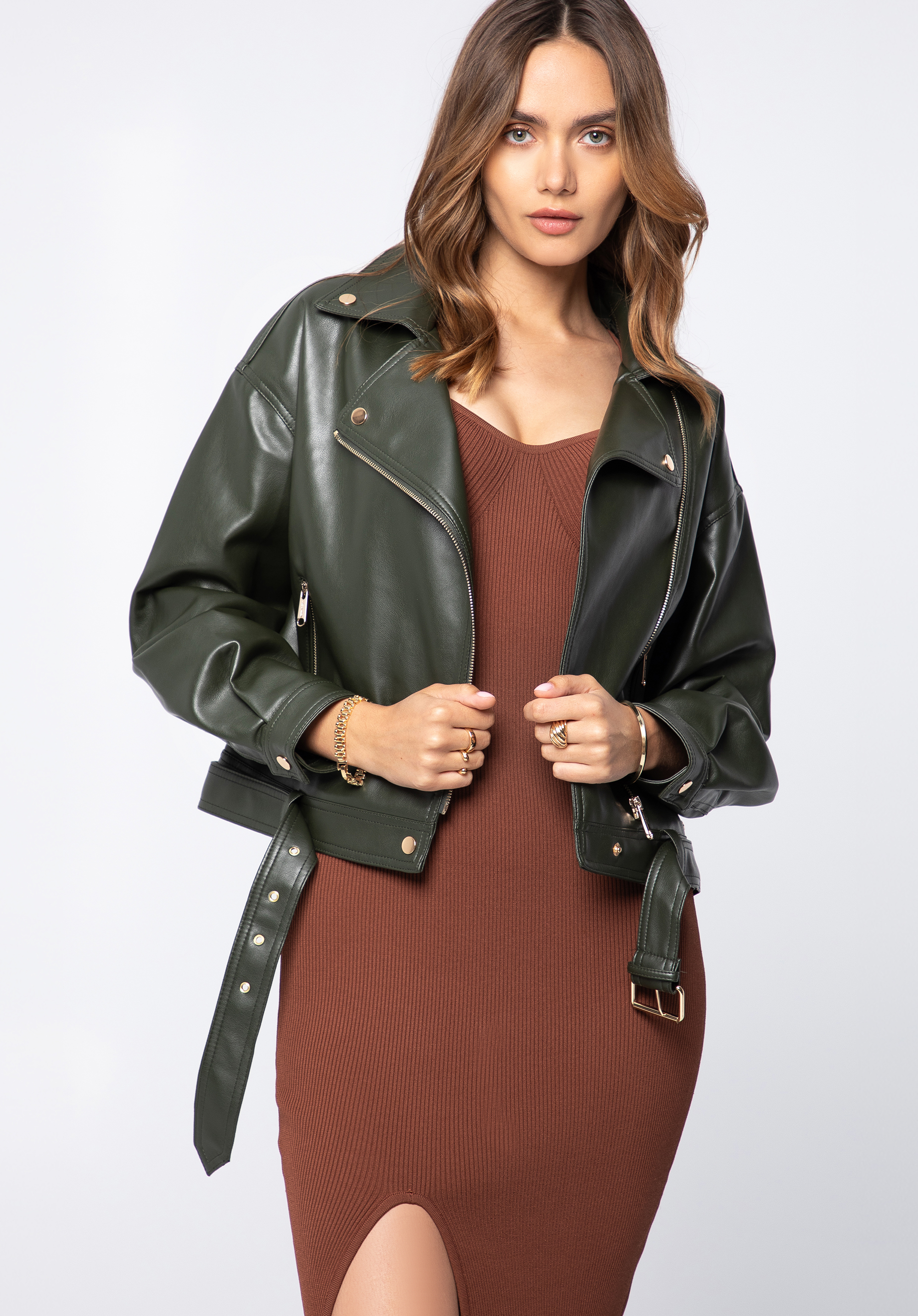 Damska ramoneska oversize z ekoskóry z paskiem przyda Ci się zarówno na wyjście ze znajomymi, jak również do kina lub weekendowe zwiedzanie.
