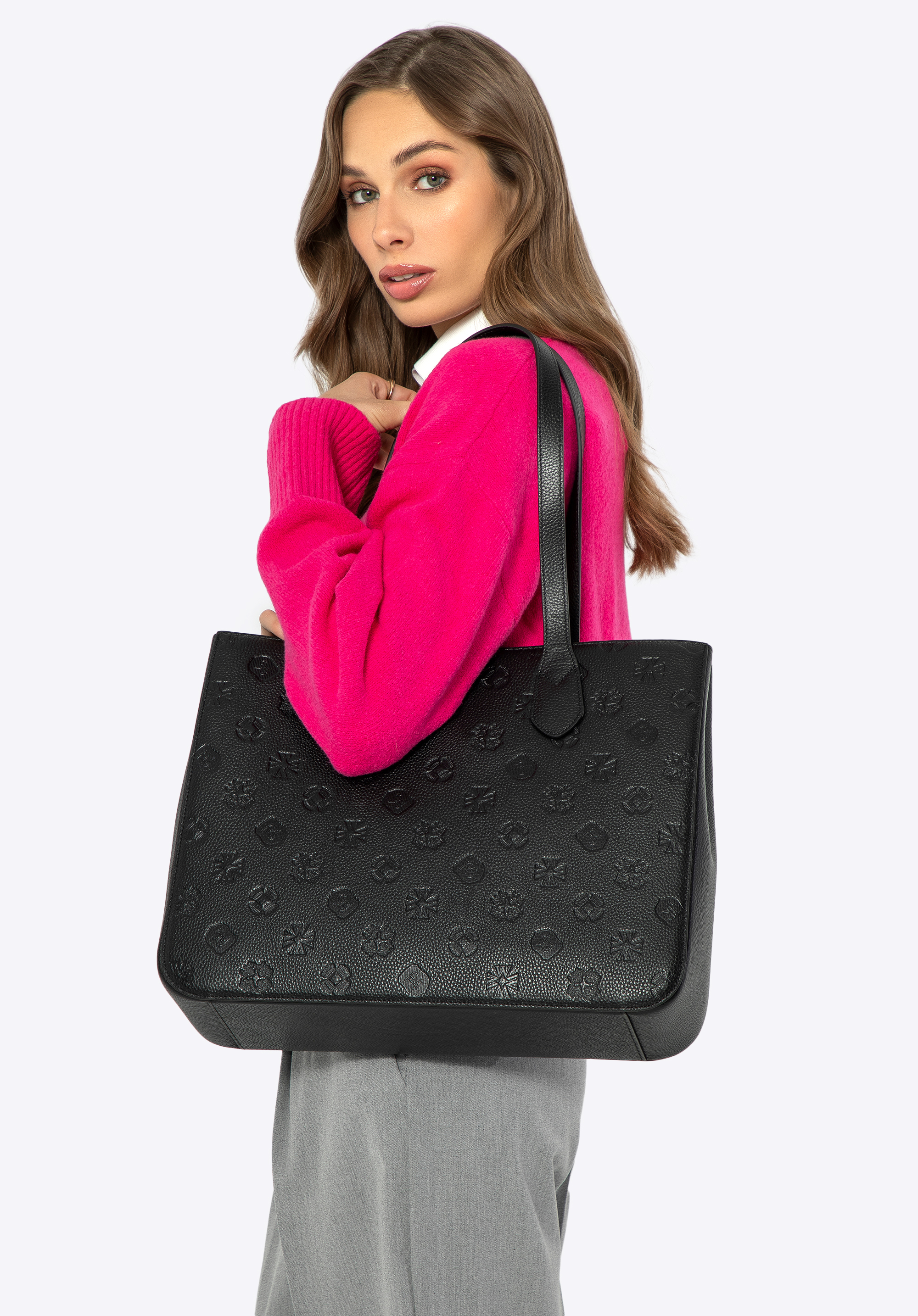 Damska shopperka skórzana z monogramem sprawdzi się w pracy, na uczelni i w intensywnym dniu w mieście, gdy potrzebujesz elegancji w dużym, praktycznym formacie. Naturalna skóra z tłoczonym monogramem, pojemność A4 oraz uporządkowane wnętrze z kilkoma kieszeniami zapewniają komfort noszenia i świetną organizację.