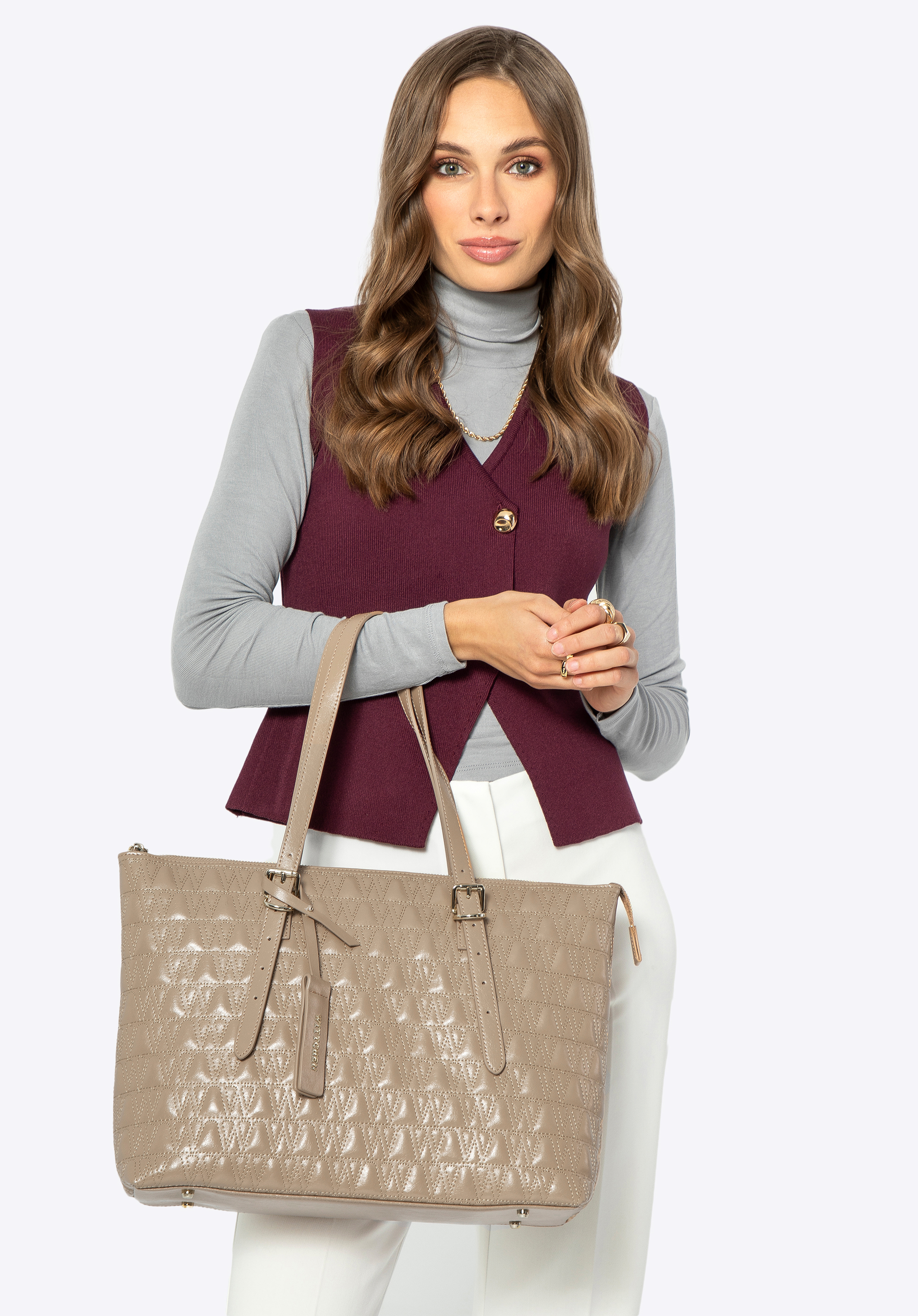 Dodaj elegancji i stylu do swojej codzienności z tą wyjątkową shopperką z naturalnej skóry. Ta torebka, ozdobiona szyciem o wzorze "W", łączy w sobie luksusowy wygląd i praktyczne rozwiązania, idealne dla nowoczesnej kobiety.
