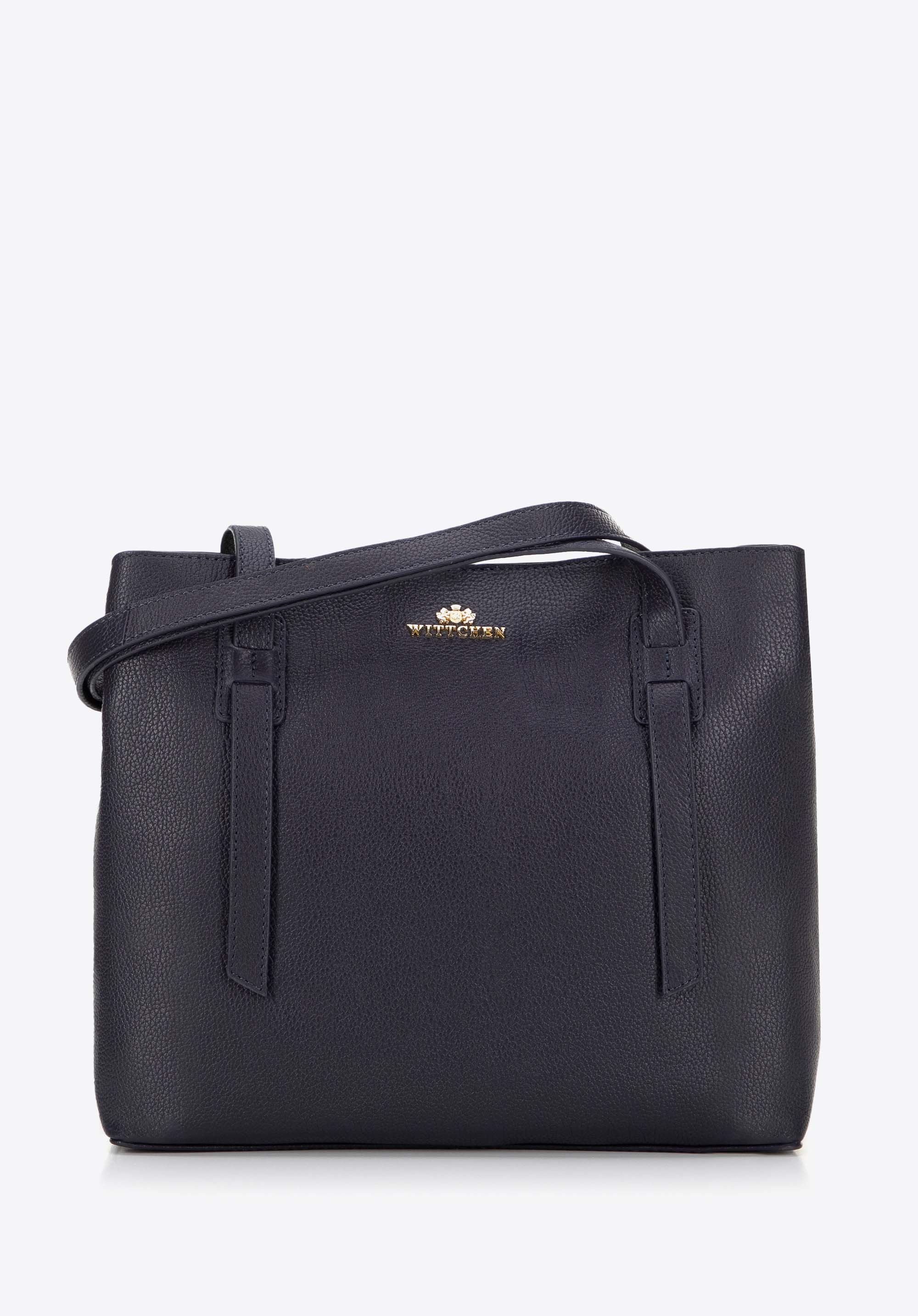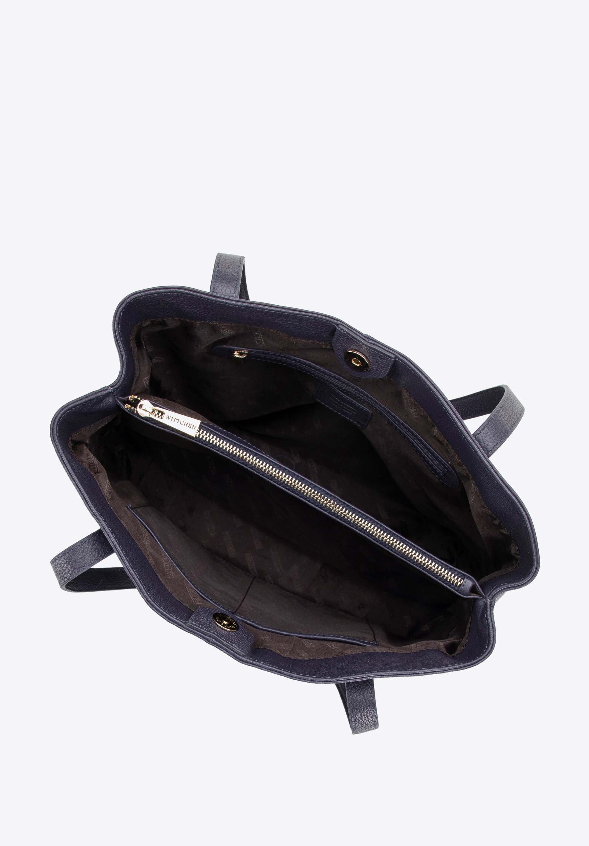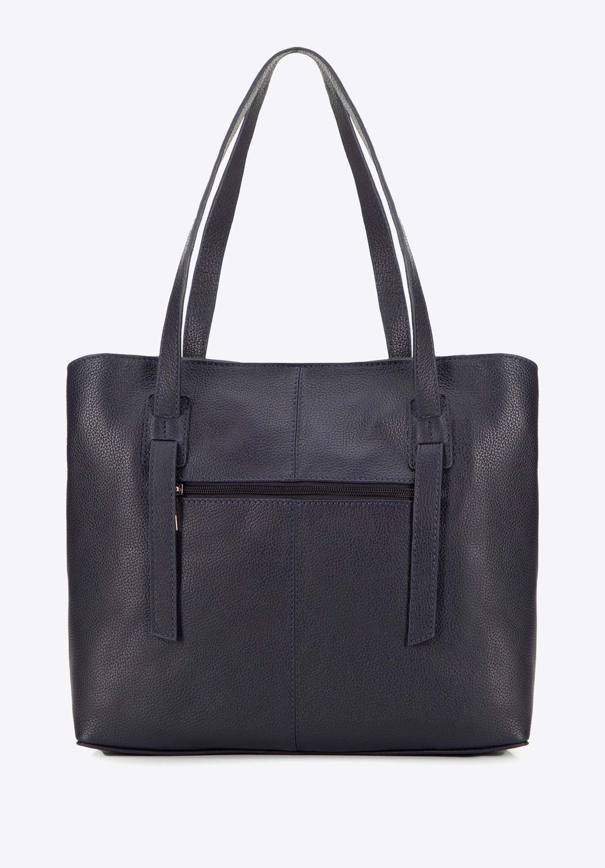 - Dwukomorowa konstrukcja: Wnętrze podzielone na dwie komory ułatwia organizację, a torebka bez trudu pomieści dokumenty w formacie A4.