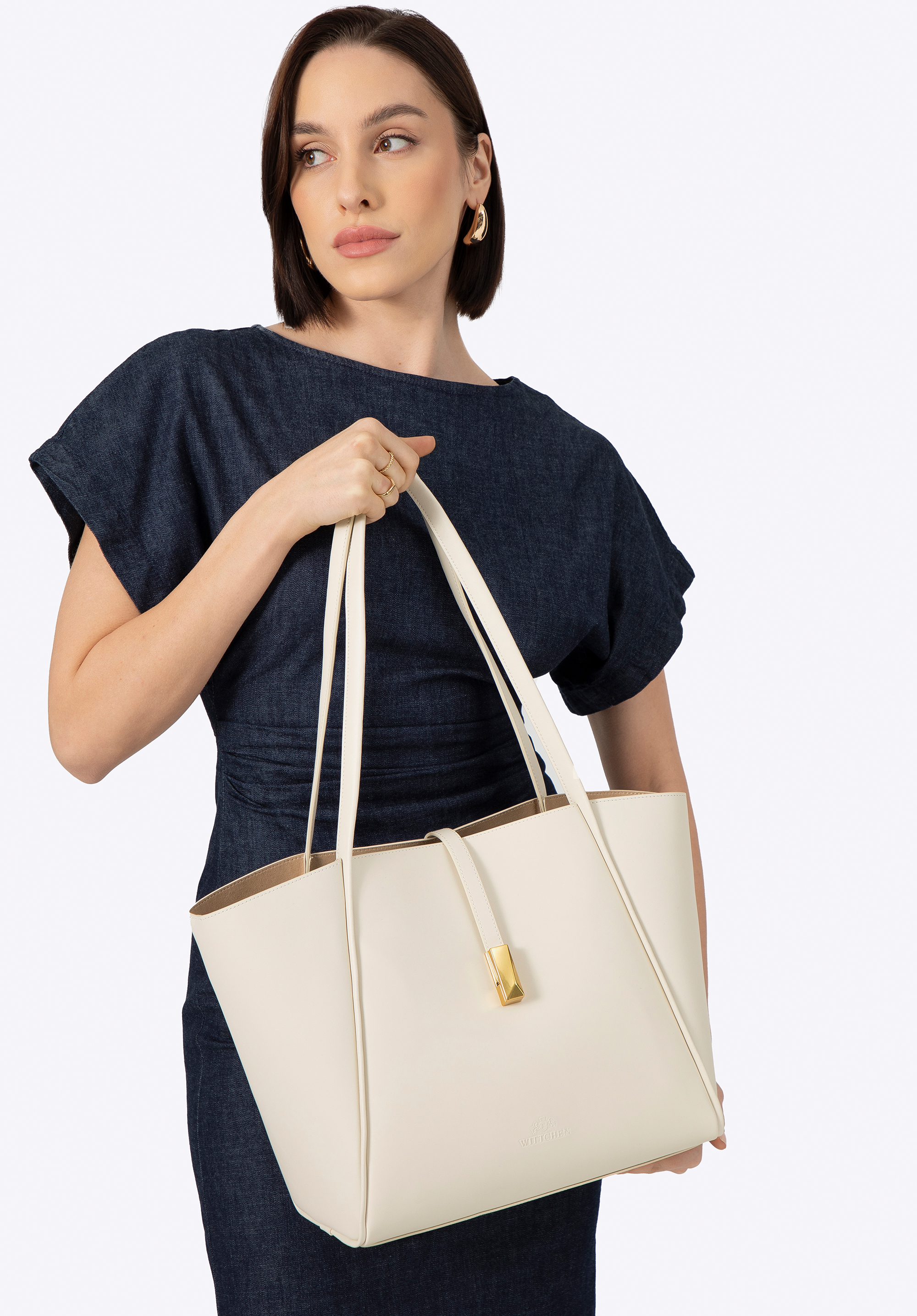 - Bezpieczne zapięcie: Pasek z klamrą chroni zawartość shopperki, niezależnie od sytuacji.