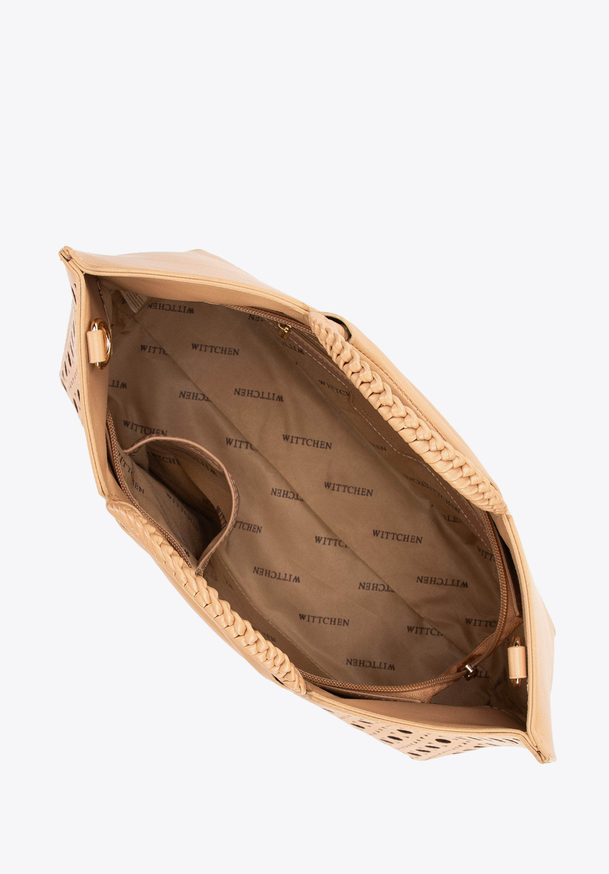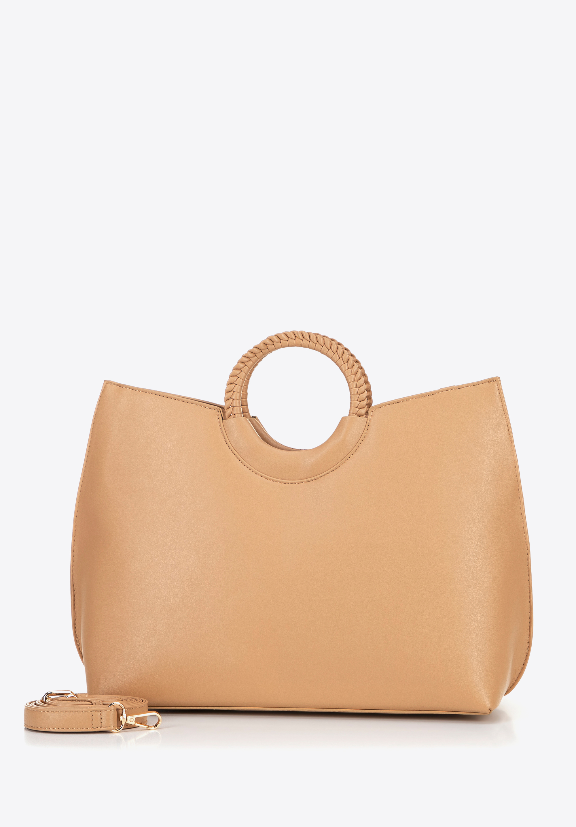 - Okrągłe rączki w formie plecionki: Wyrazisty detal, który nadaje torbie kreatywnego charakteru i zapewnia wygodę noszenia w ręce.