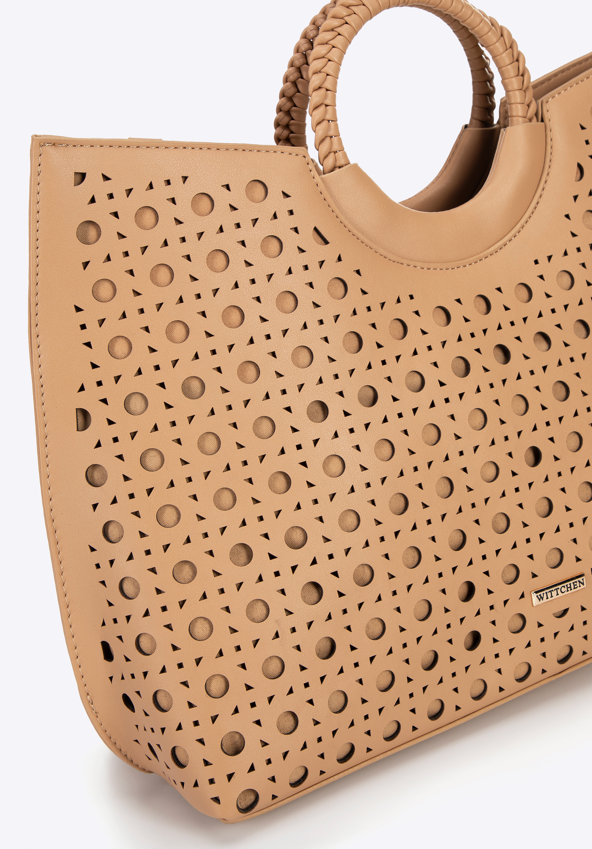 Pełna charakteru, oryginalna i absolutnie wyjątkowa – nasza damska shopperka wyróżnia się na tle innych toreb. Stworzona z myślą o kobietach, które cenią połączenie stylu i funkcjonalności. Wykonana ze skóry ekologicznej, przyciąga wzrok okrągłymi, plecionymi rączkami oraz subtelnym, lecz wyrazistym geometrycznym wzorem. To torba, która nie boi się wyróżniać, zachowując przy tym elegancję i ponadczasowy design.