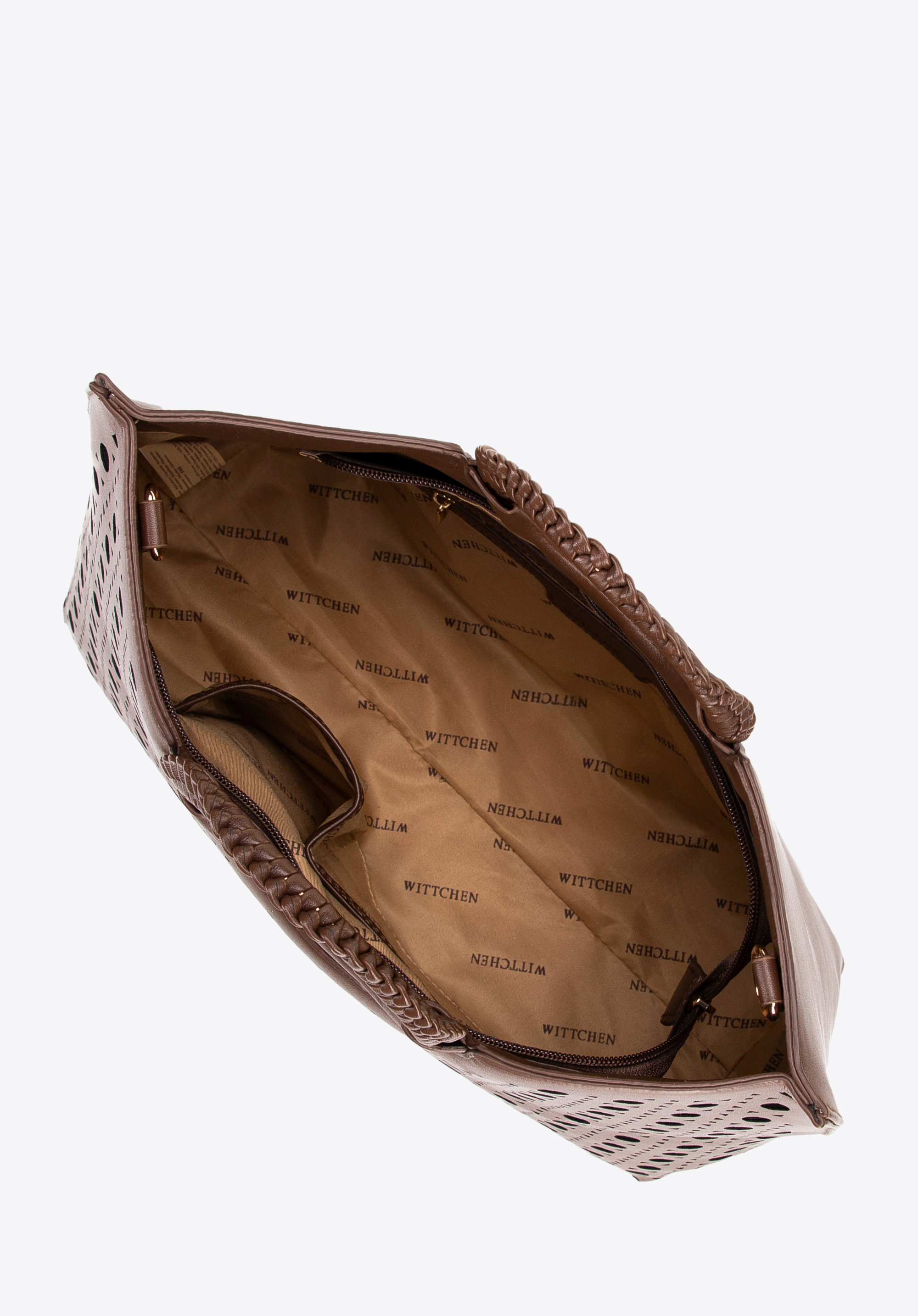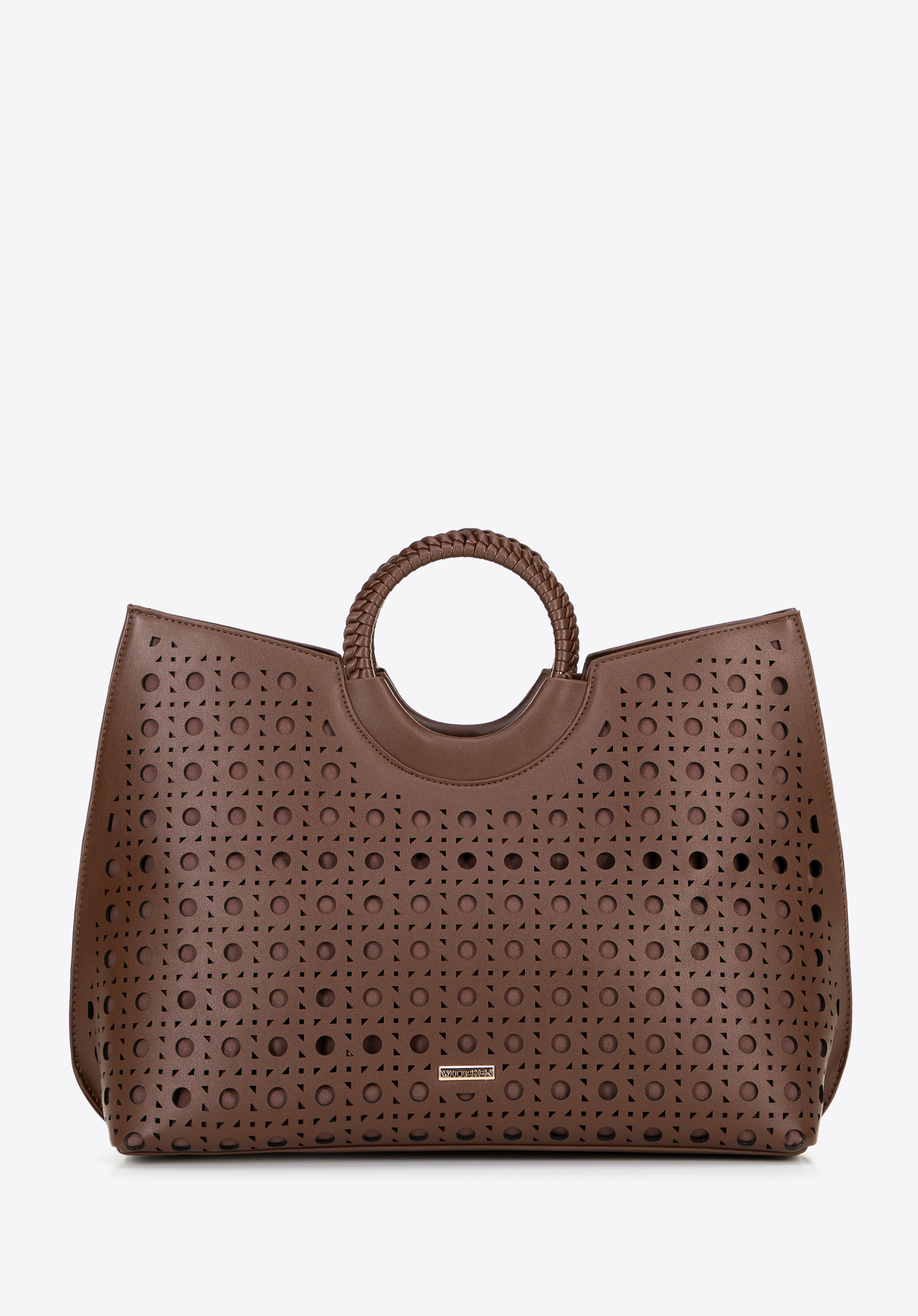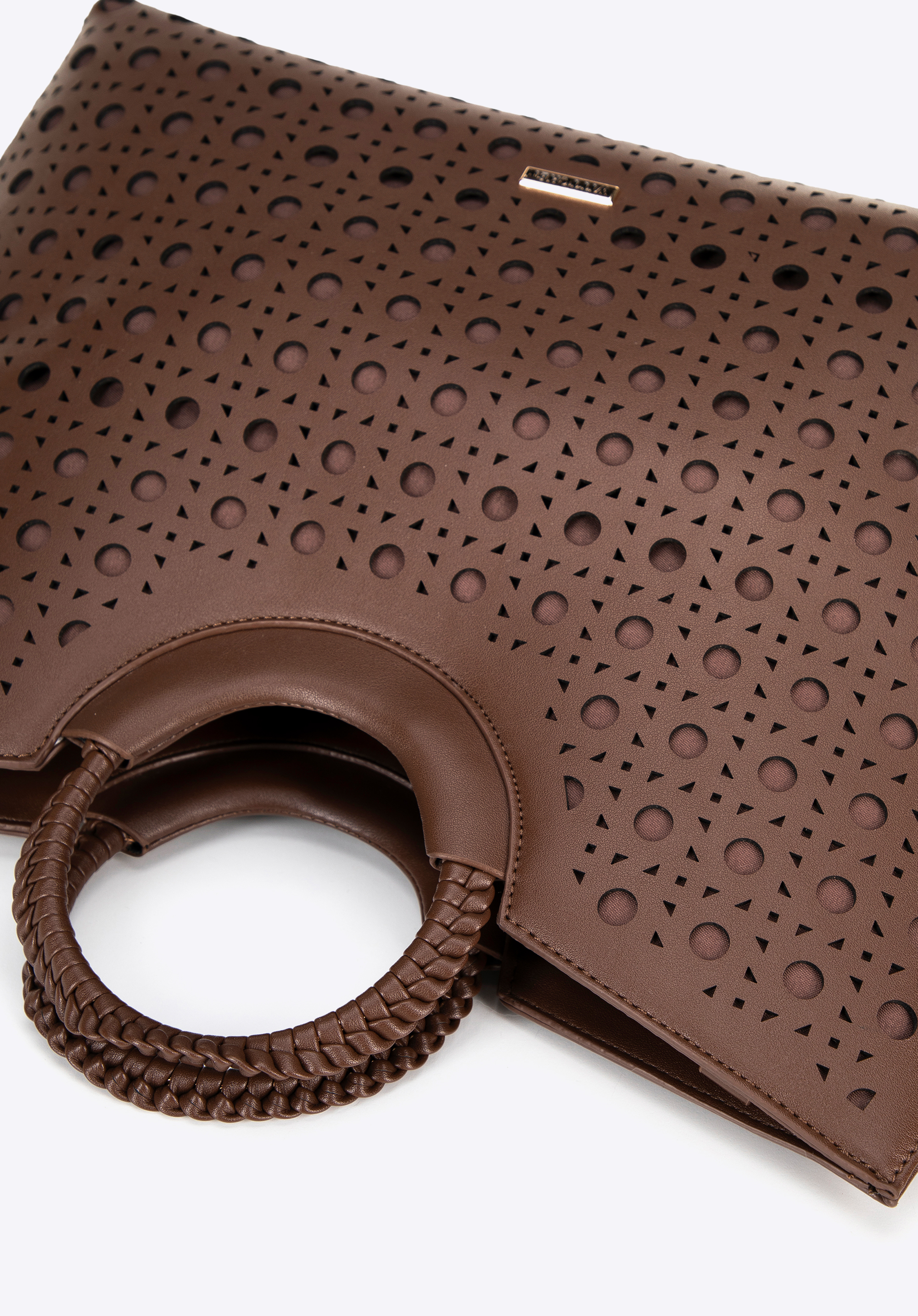 Pełna charakteru, oryginalna i absolutnie wyjątkowa – nasza damska shopperka wyróżnia się na tle innych toreb. Stworzona z myślą o kobietach, które cenią połączenie stylu i funkcjonalności. Wykonana ze skóry ekologicznej, przyciąga wzrok okrągłymi, plecionymi rączkami oraz subtelnym, lecz wyrazistym geometrycznym wzorem. To torba, która nie boi się wyróżniać, zachowując przy tym elegancję i ponadczasowy design.