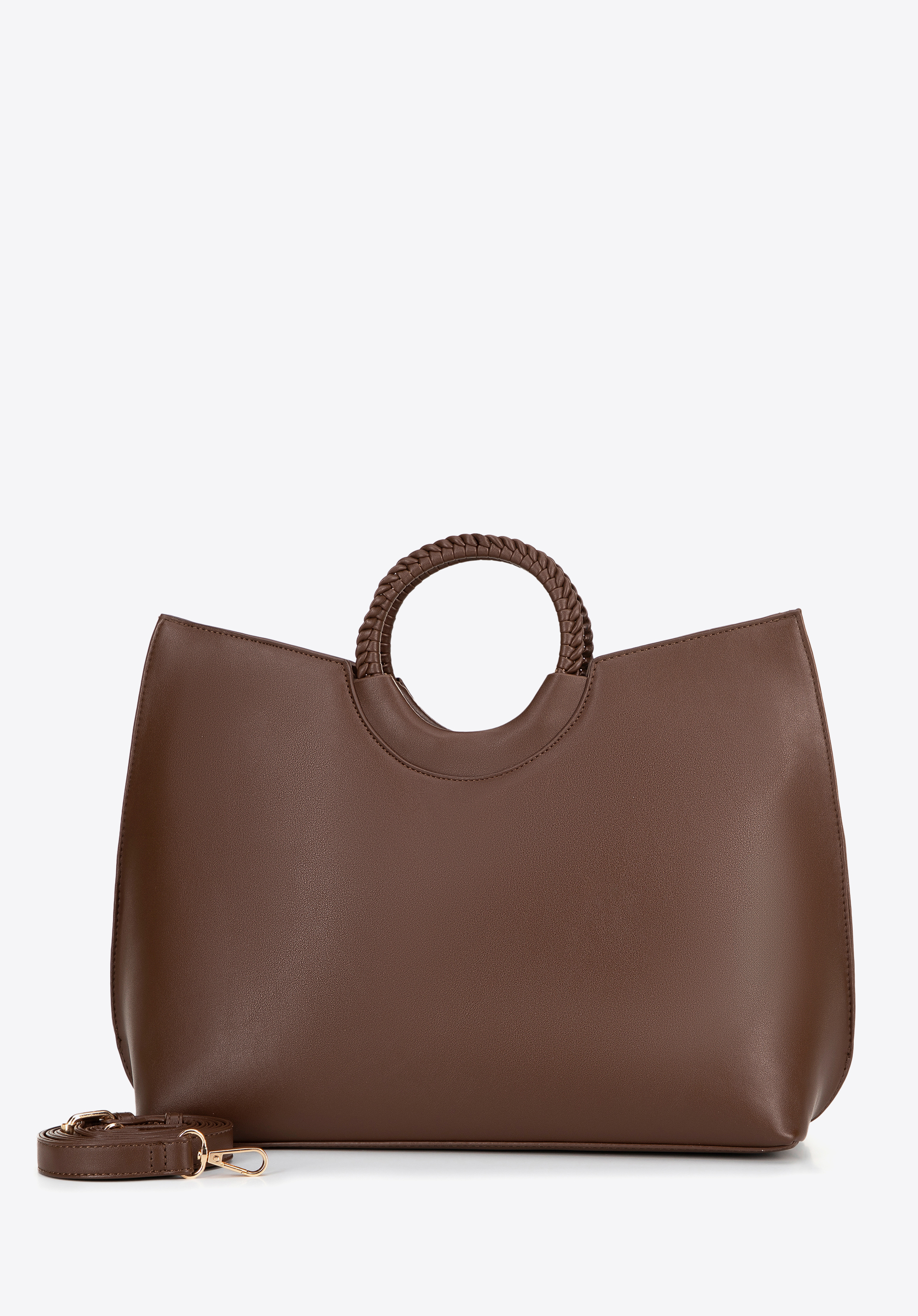 - Okrągłe rączki w formie plecionki: Wyrazisty detal, który nadaje torbie kreatywnego charakteru i zapewnia wygodę noszenia w ręce.