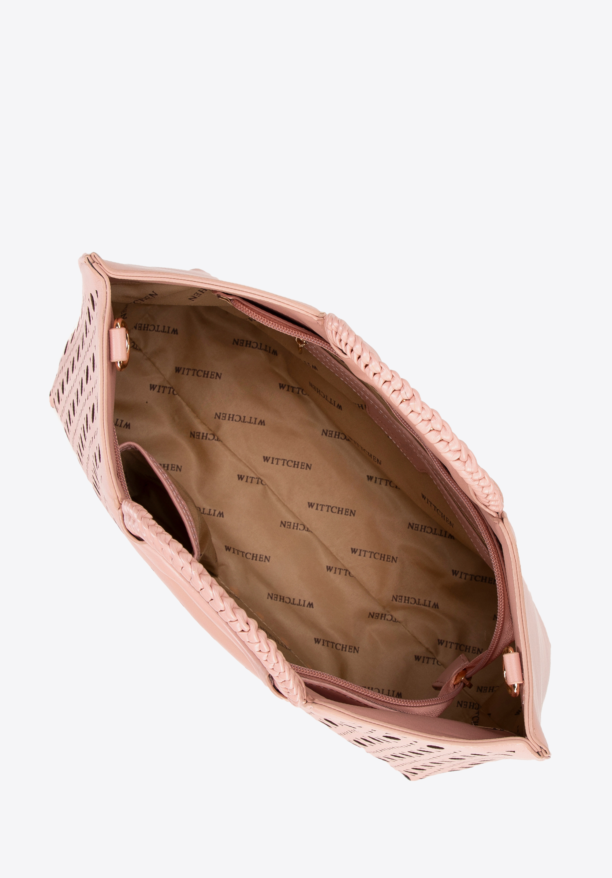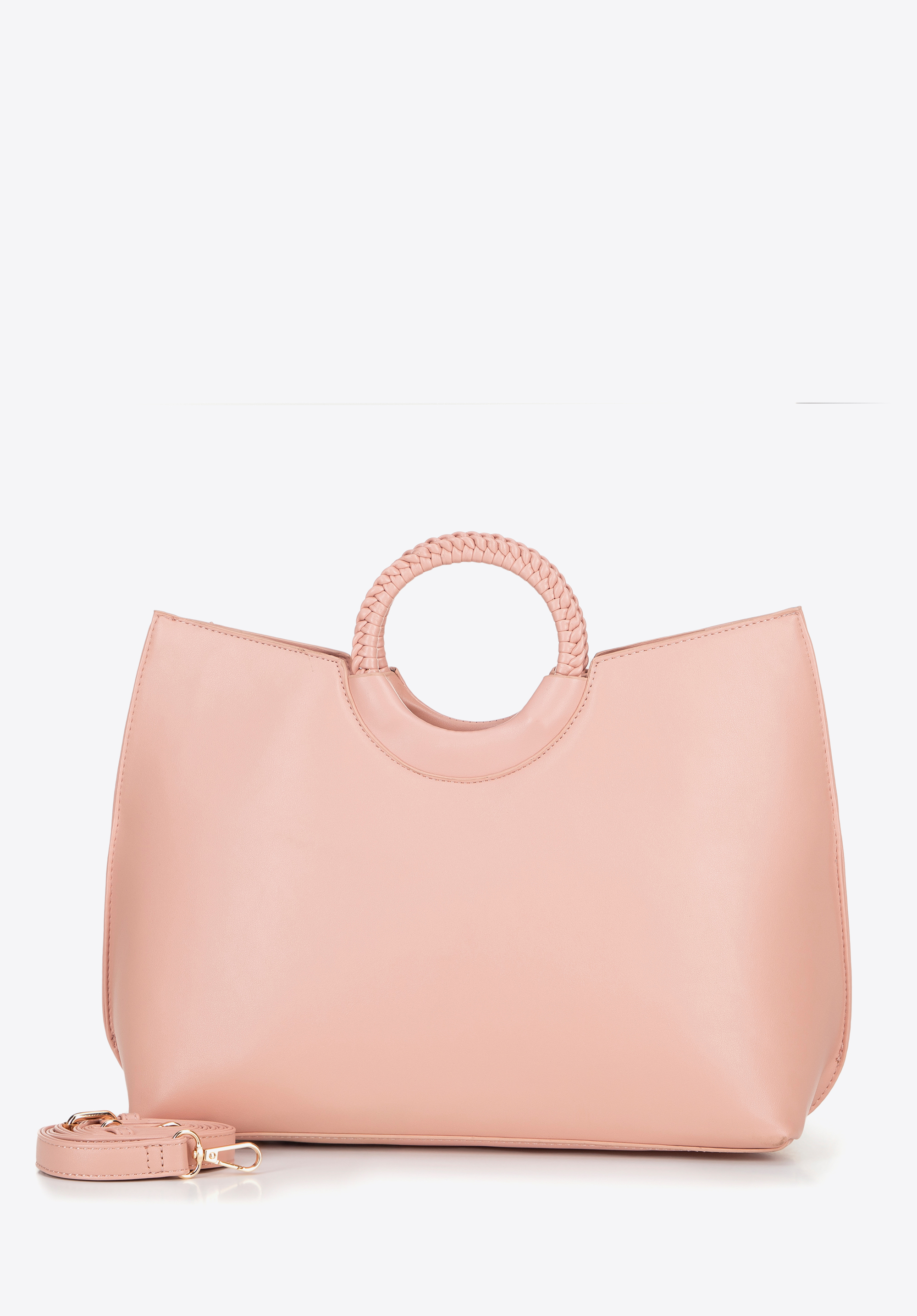 - Okrągłe rączki w formie plecionki: Wyrazisty detal, który nadaje torbie kreatywnego charakteru i zapewnia wygodę noszenia w ręce.