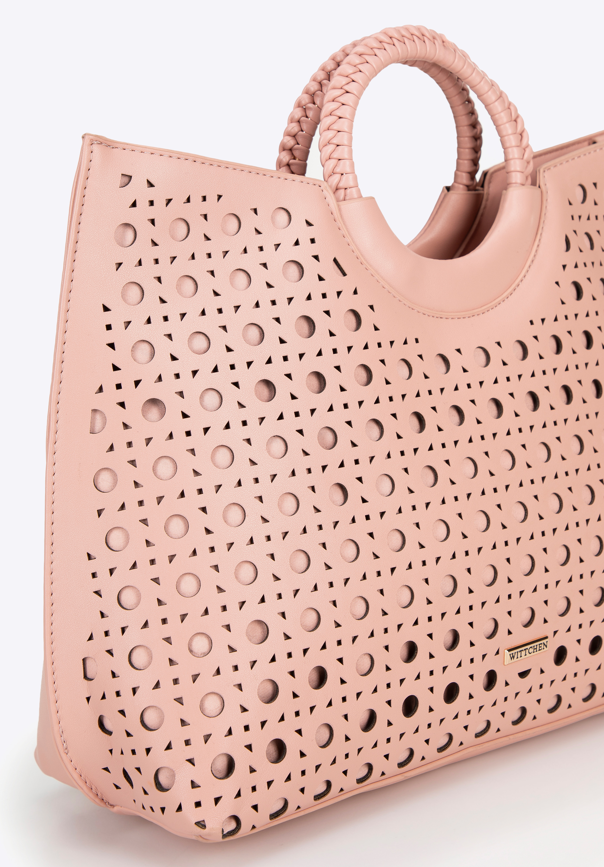 Pełna charakteru, oryginalna i absolutnie wyjątkowa – nasza damska shopperka wyróżnia się na tle innych toreb. Stworzona z myślą o kobietach, które cenią połączenie stylu i funkcjonalności. Wykonana ze skóry ekologicznej, przyciąga wzrok okrągłymi, plecionymi rączkami oraz subtelnym, lecz wyrazistym geometrycznym wzorem. To torba, która nie boi się wyróżniać, zachowując przy tym elegancję i ponadczasowy design.