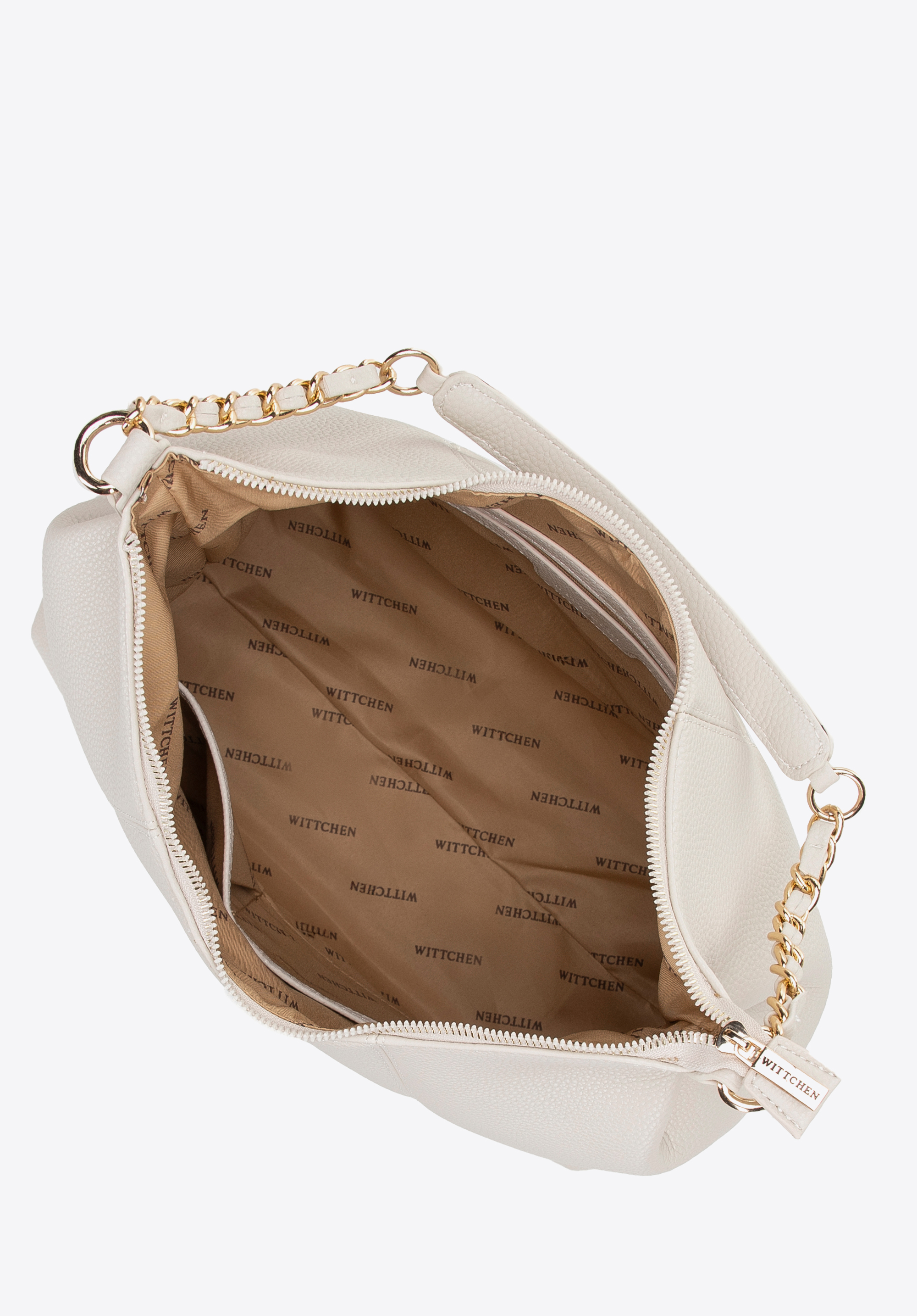 Stylowa shopperka z ekoskóry to doskonały wybór na co dzień. Duży monogram WITTCHEN na froncie oraz łańcuszek z naramiennikiem nadają jej wyjątkowego charakteru. Torba zamykana na zamek błyskawiczny zapewnia bezpieczeństwo, a trzy kieszenie wewnętrzne, w tym jedna na zamek, pomagają utrzymać porządek. Cztery nóżki na spodzie chronią torbę przed zarysowaniami, a przestronne wnętrze pomieści format A4 – to doskonały wybór do pracy i na zakupy.