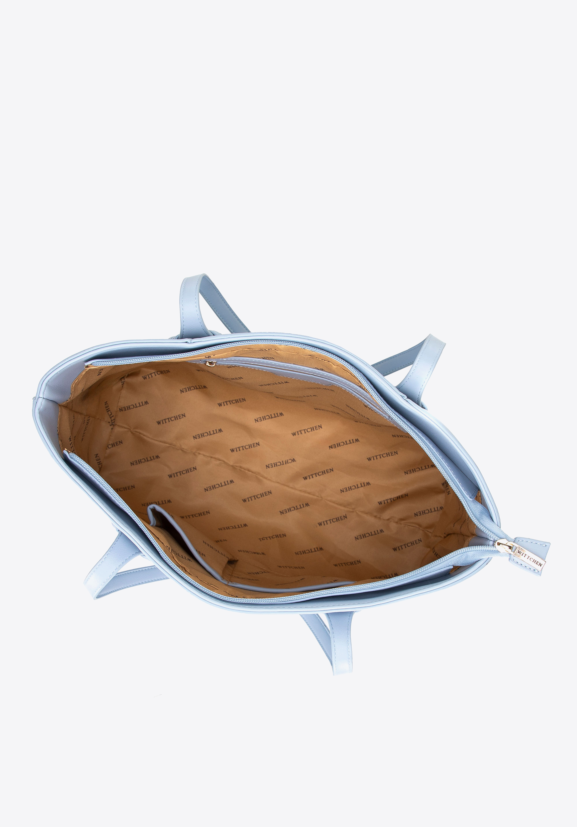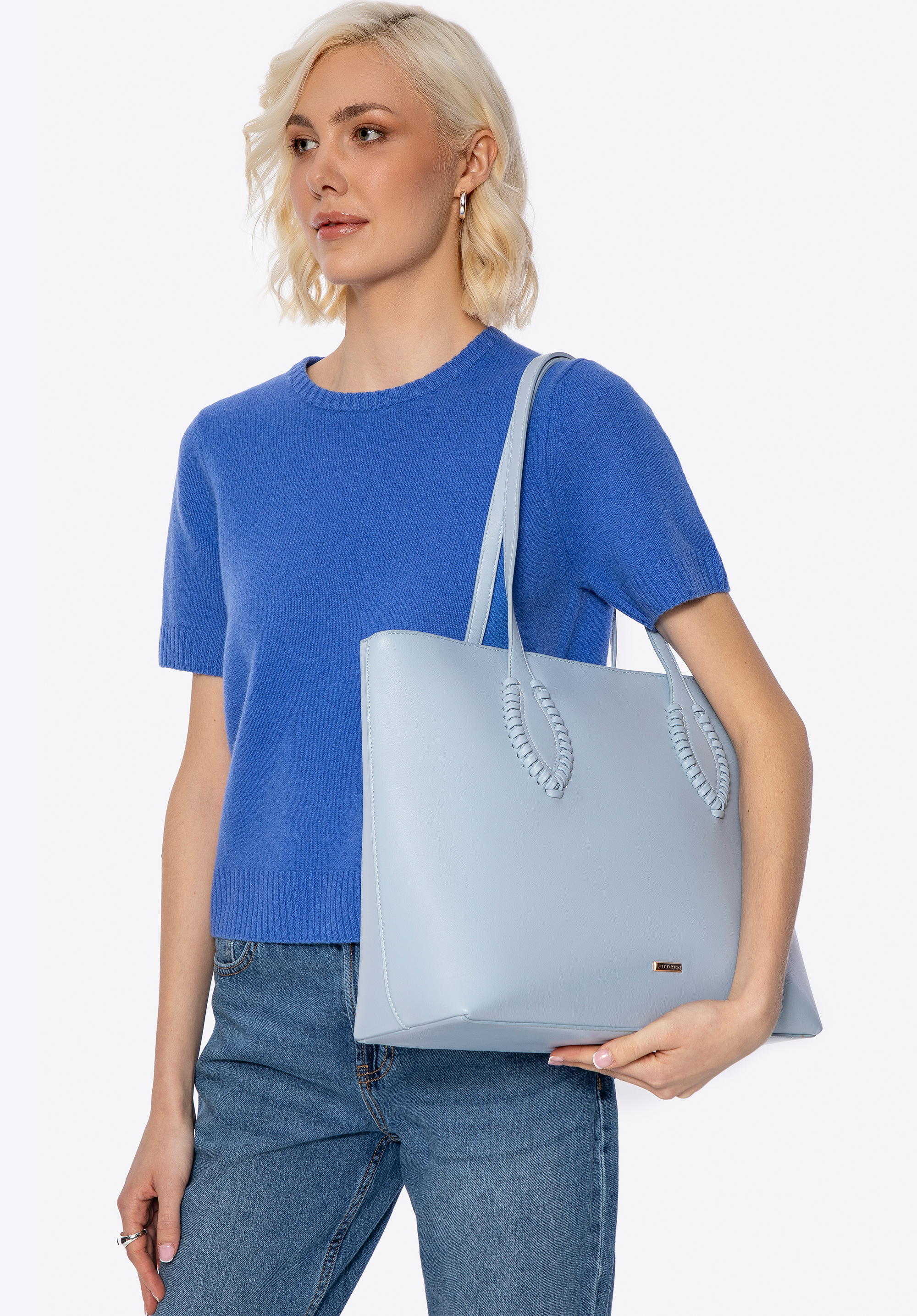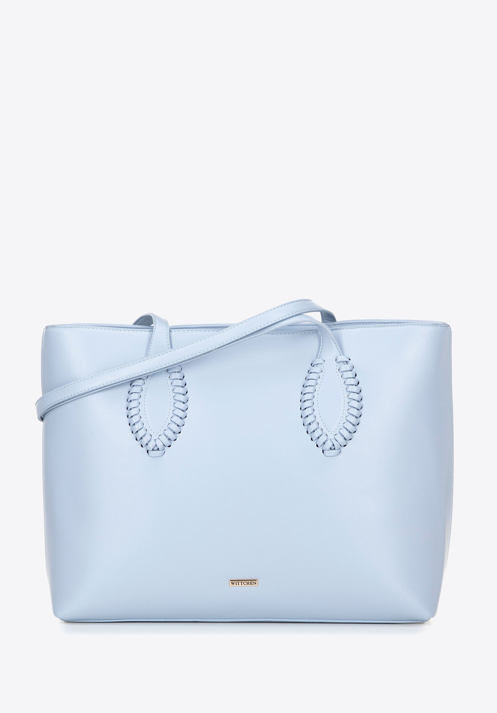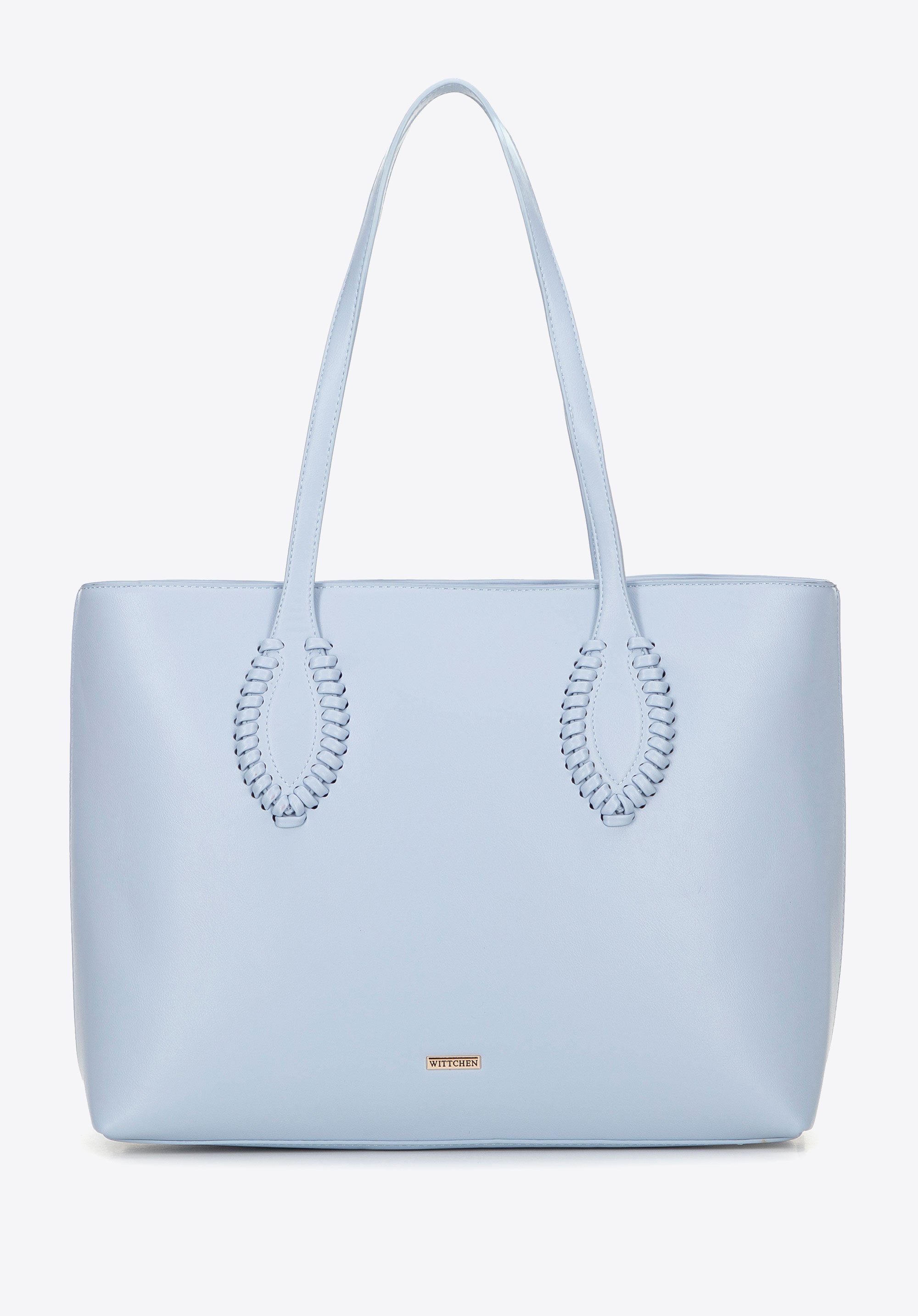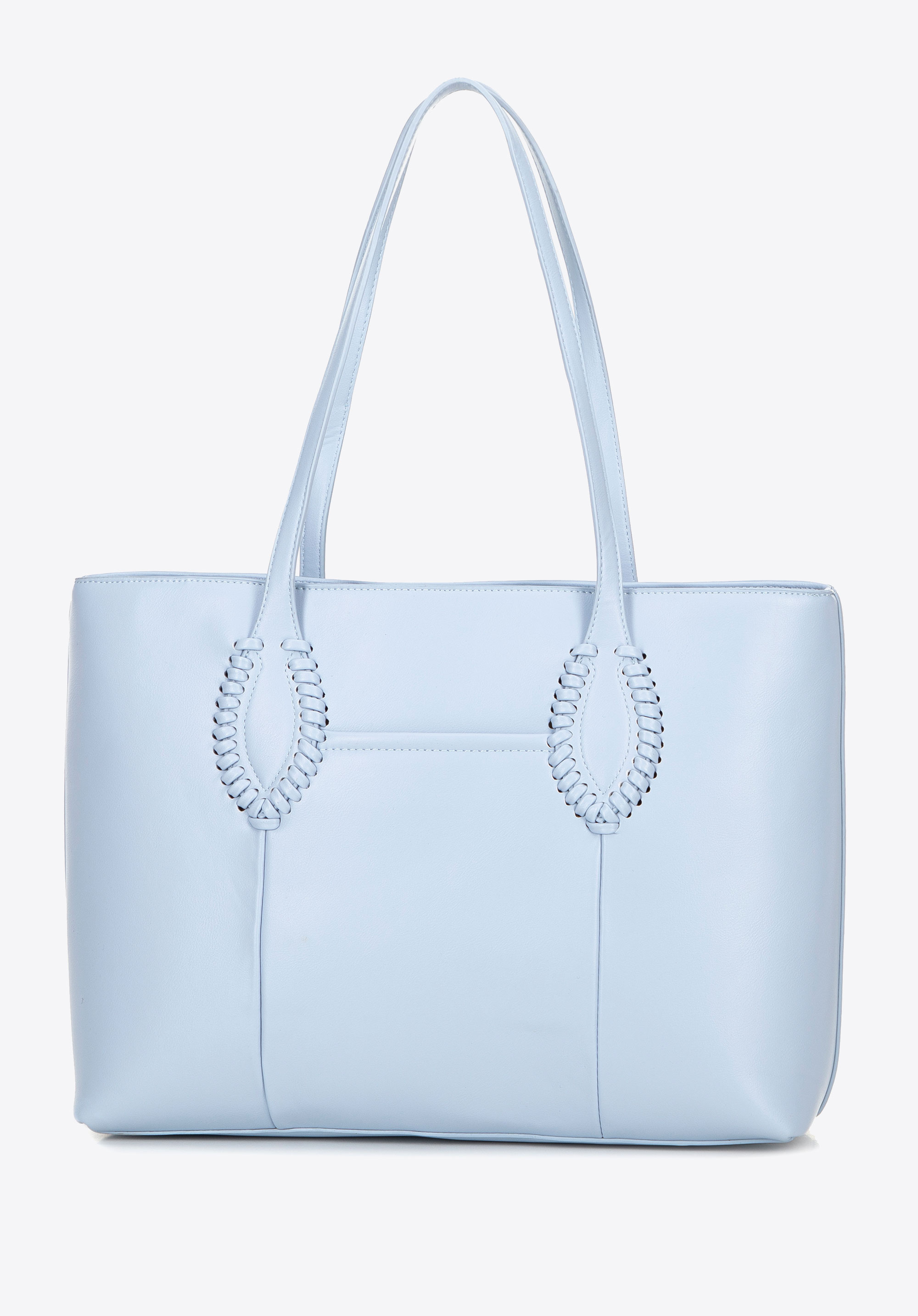 Damska shopperka ze skóry ekologicznej z plecionymi akcentami niebieska