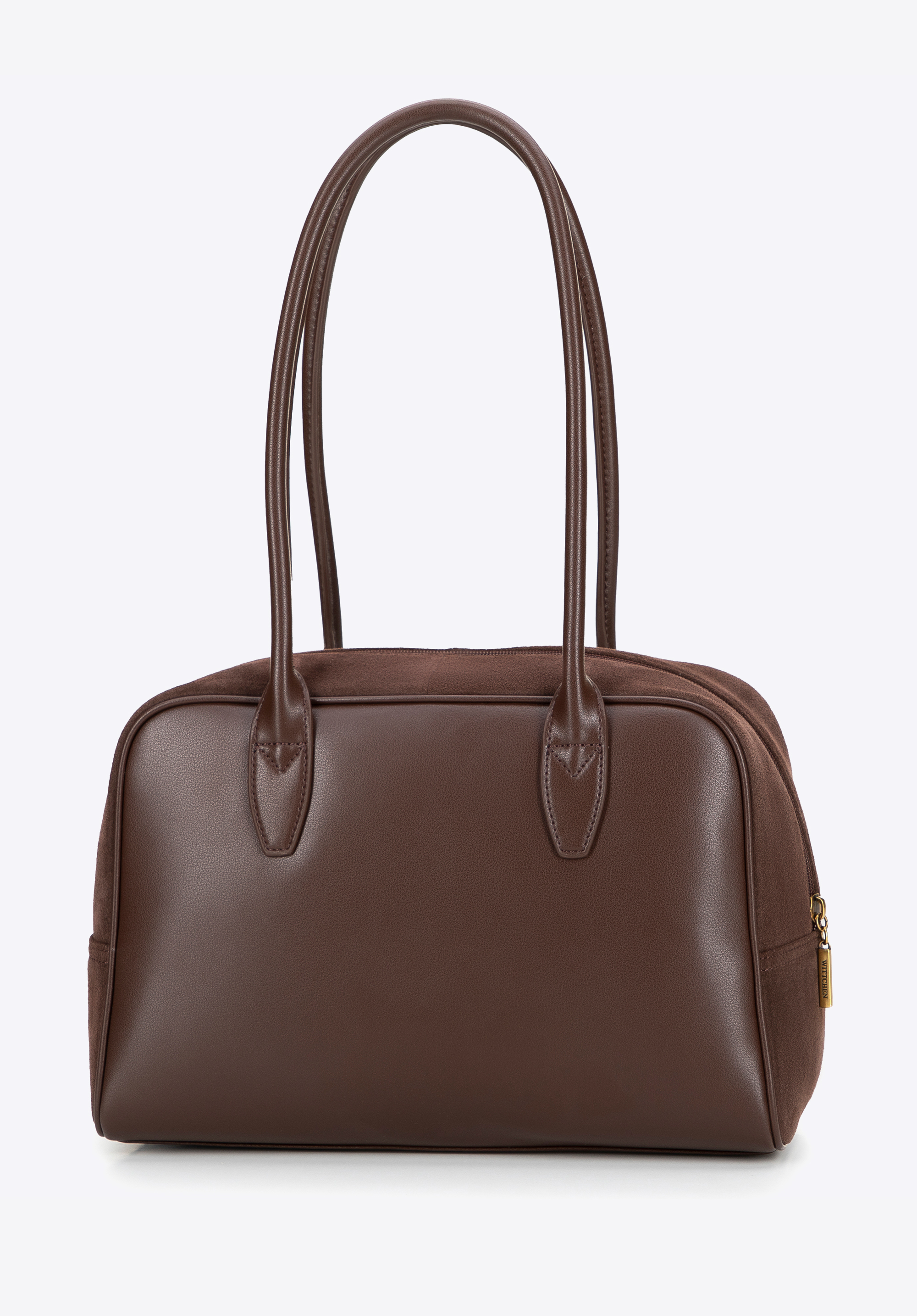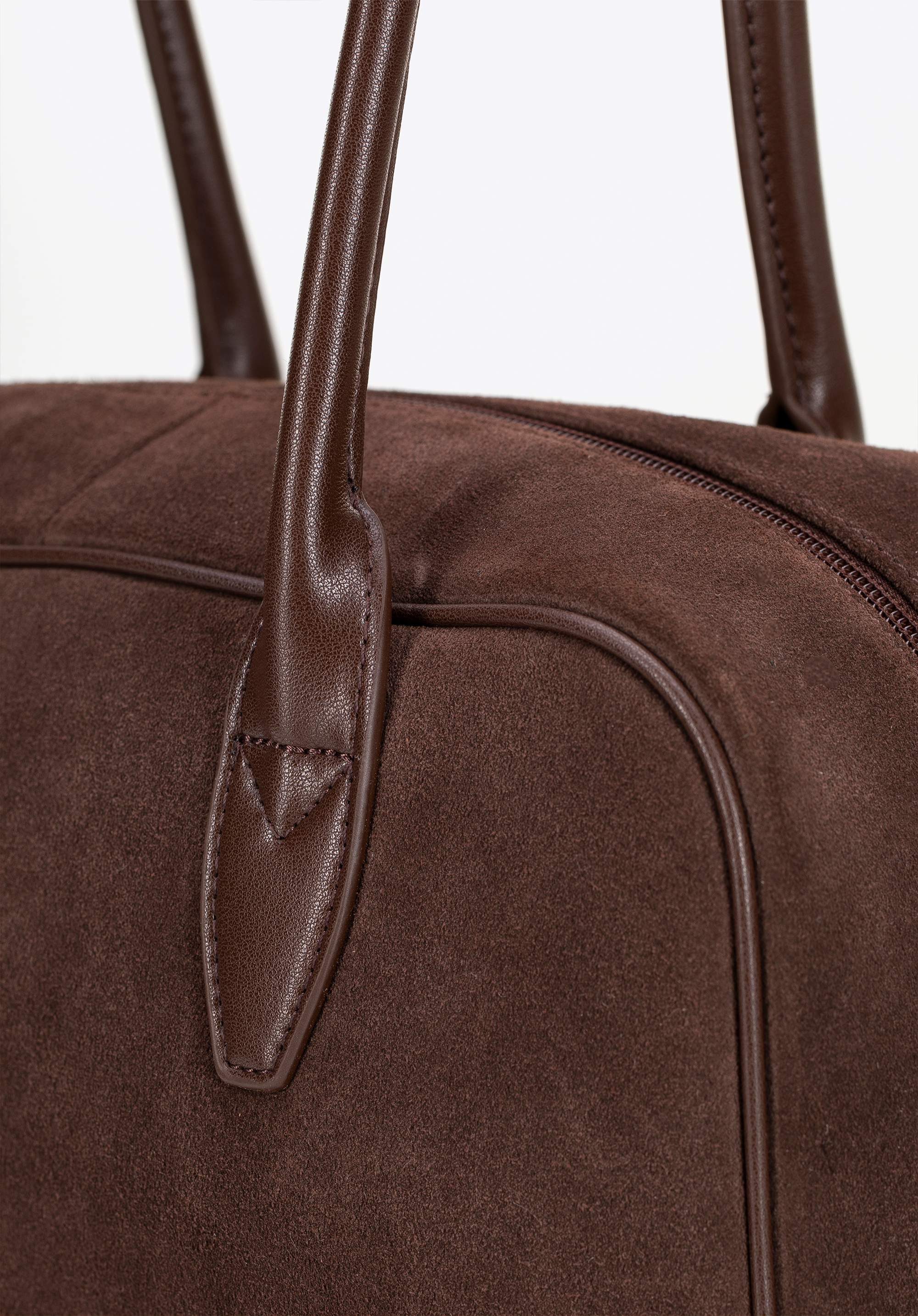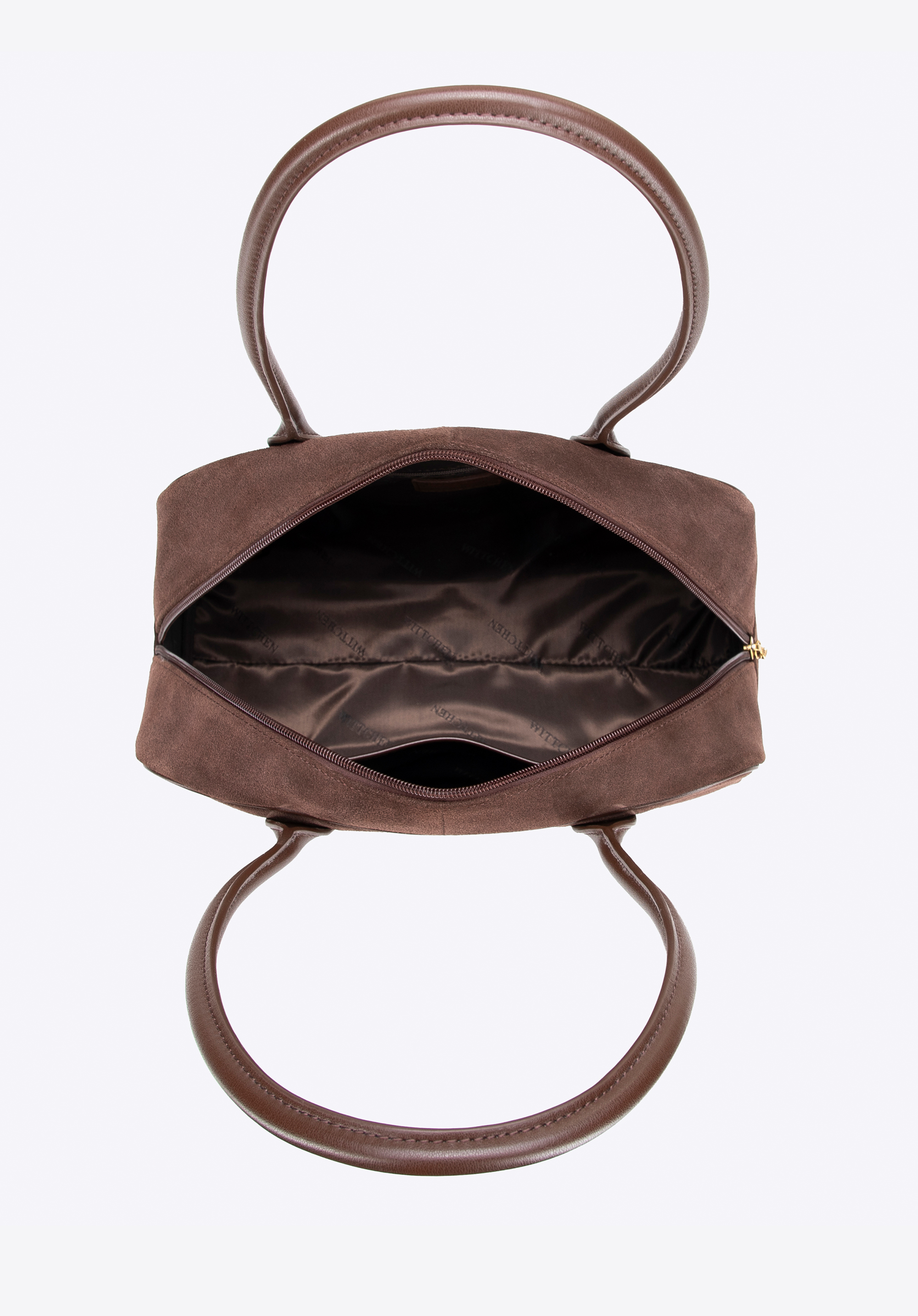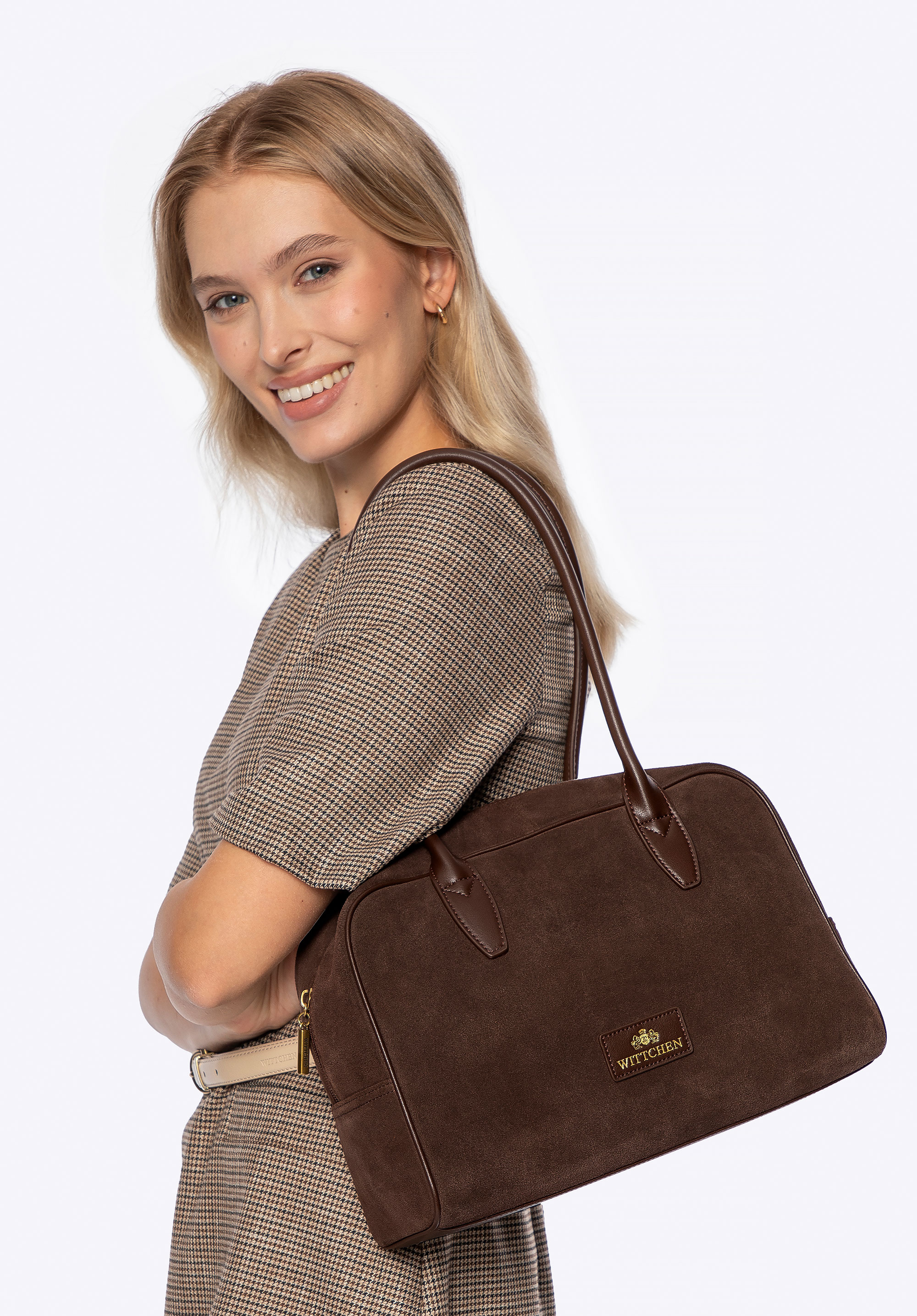 - Materiał: Skóra naturalna w dwóch fakturach – zamszowej na przodzie i gładkiej od strony ciała – uzupełniona solidnymi rączkami i detali wewnętrznymi z imitacji skóry łączy elegancję z komfortem codziennego noszenia.