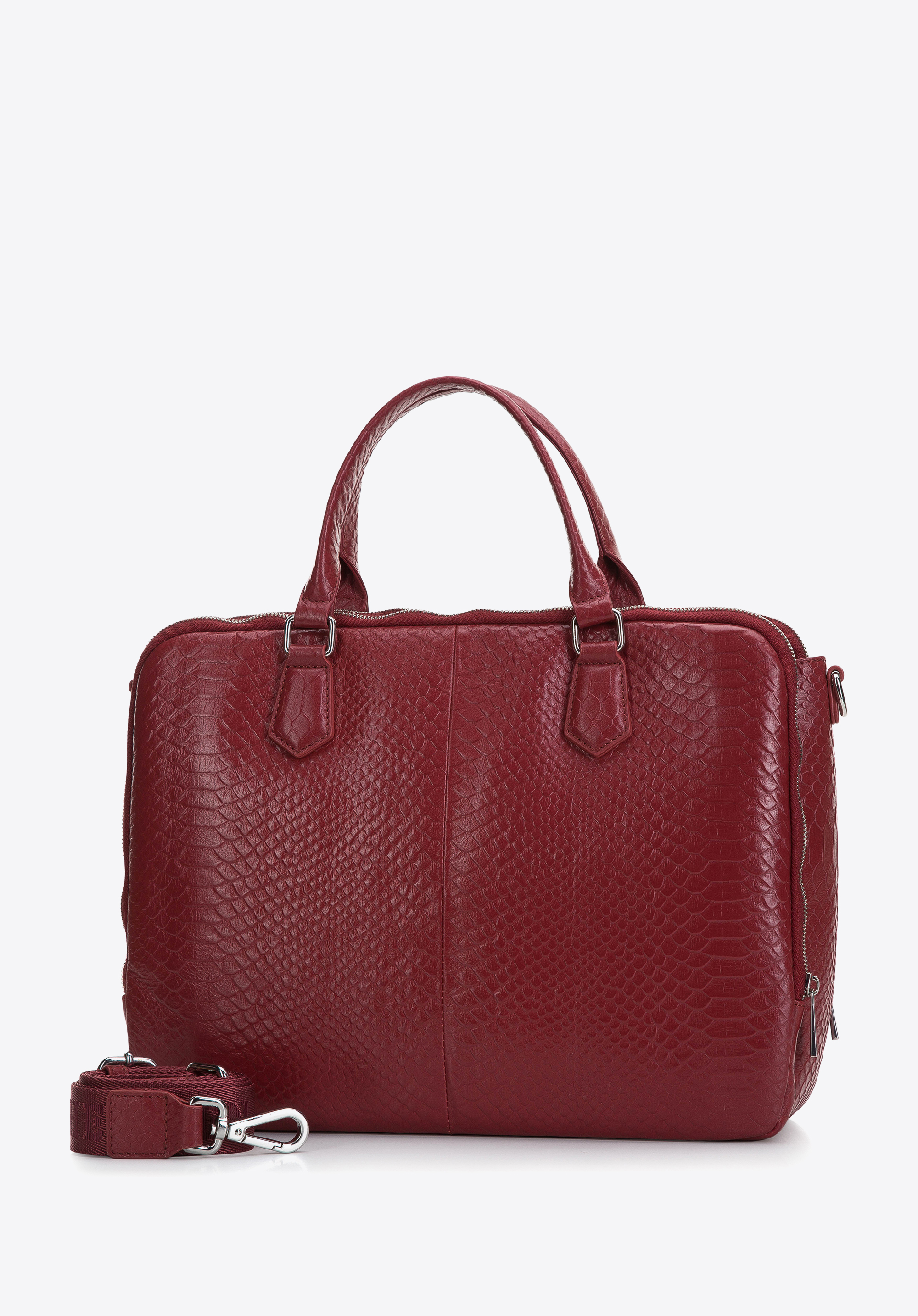 Skórzana torba na laptopa to niezbędnik każdej nowoczesnej businesswoman. Solidna i ponadczasowa, spodoba się paniom, które cenią funkcjonalne dodatki z nutką glamour. Szczególnie model wykonany ze skóry croco, imitującej tłoczenie we wzór krokodyla, które dodatkowo wpisuje się w najnowsze trendy modowe. Dzięki sporym rozmiarom, bez problemu zmieścisz z niej nie tylko przenośny komputer o maksymalnych wymiarach 25 × 34 cm, ale także dokumenty A4, notes, przybory do pisania oraz inne przedmioty niezbędne w codziennej pracy. Prezentowana torba na laptopa posiada wygodne rączki do noszenia w ręku oraz solidny, doczepiany pasek na ramię. Wnętrze zostało podzielone na trzy komory – dwie zamykane na zamek błyskawiczny oraz jedną zapinaną na magnes, w której znajdziesz dodatkowo dwie mniejsze kieszenie, idealne do przechowywania telefonu, portfela, kluczy czy etui na karty kredytowe. Damska torba na laptopa 13” ze skóry croco jest wyjątkowa – z nią na pewno zawojujesz świat!