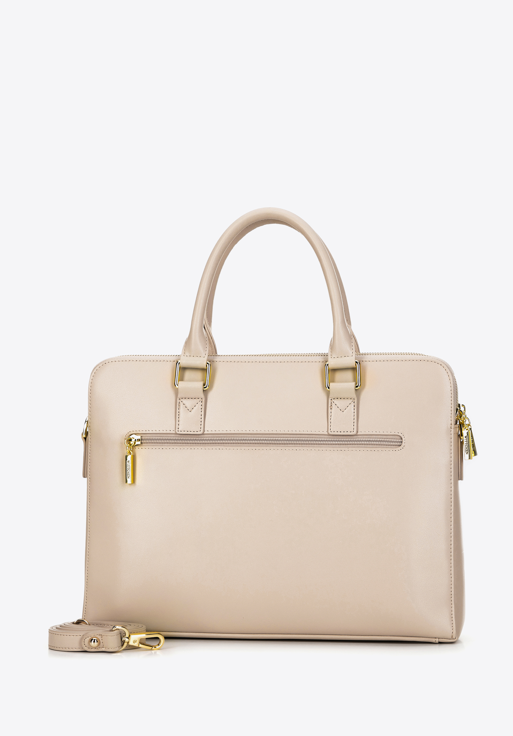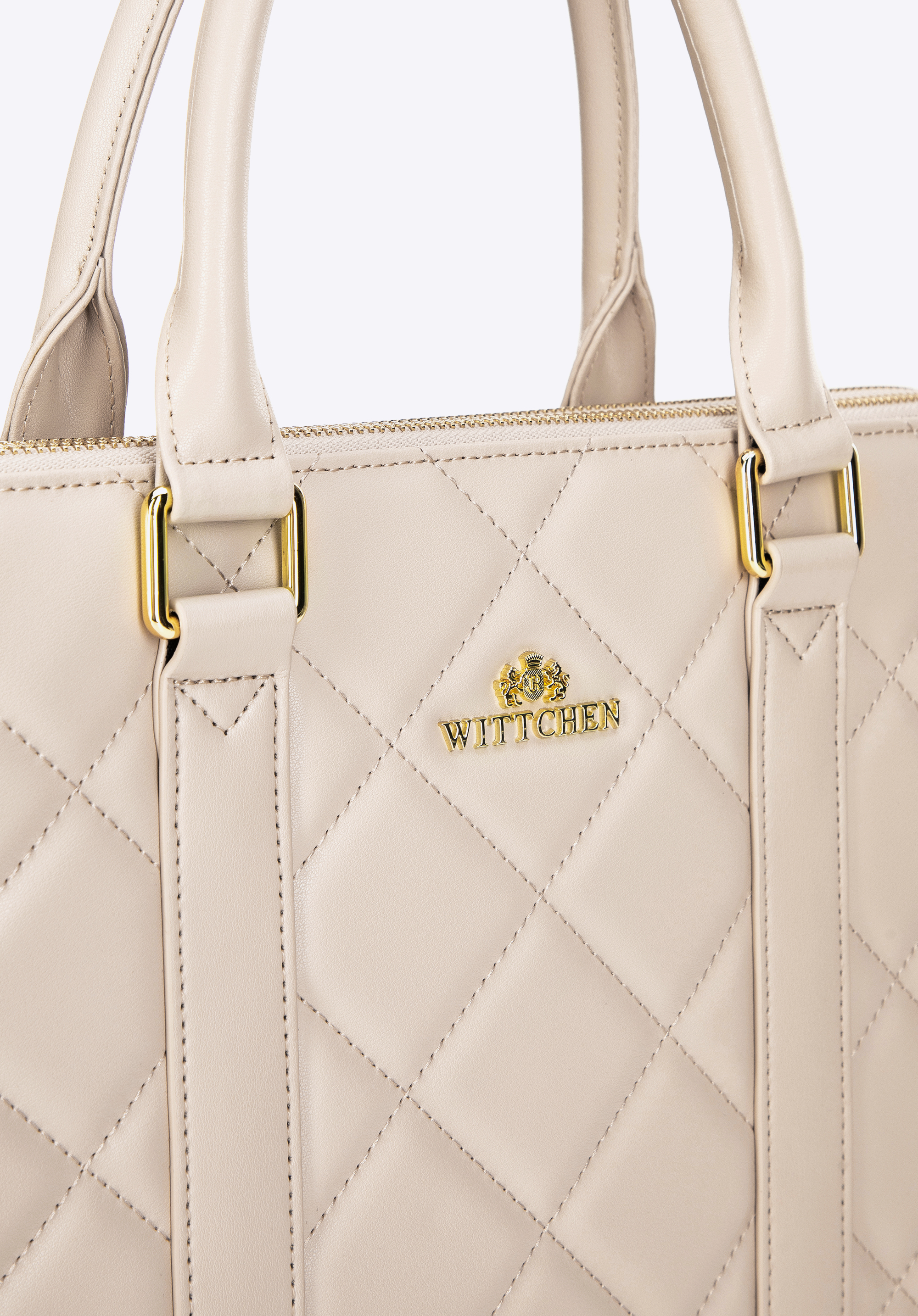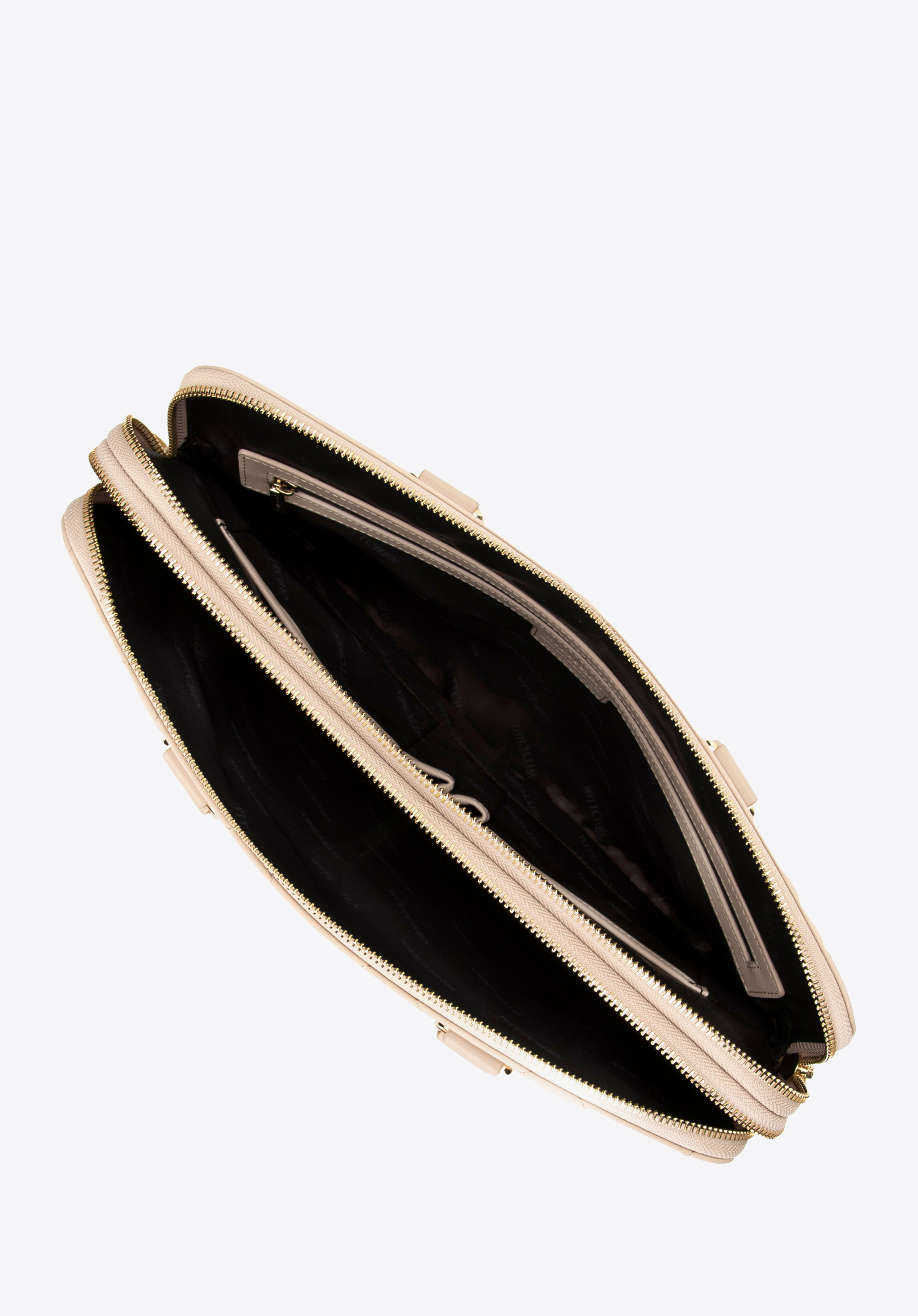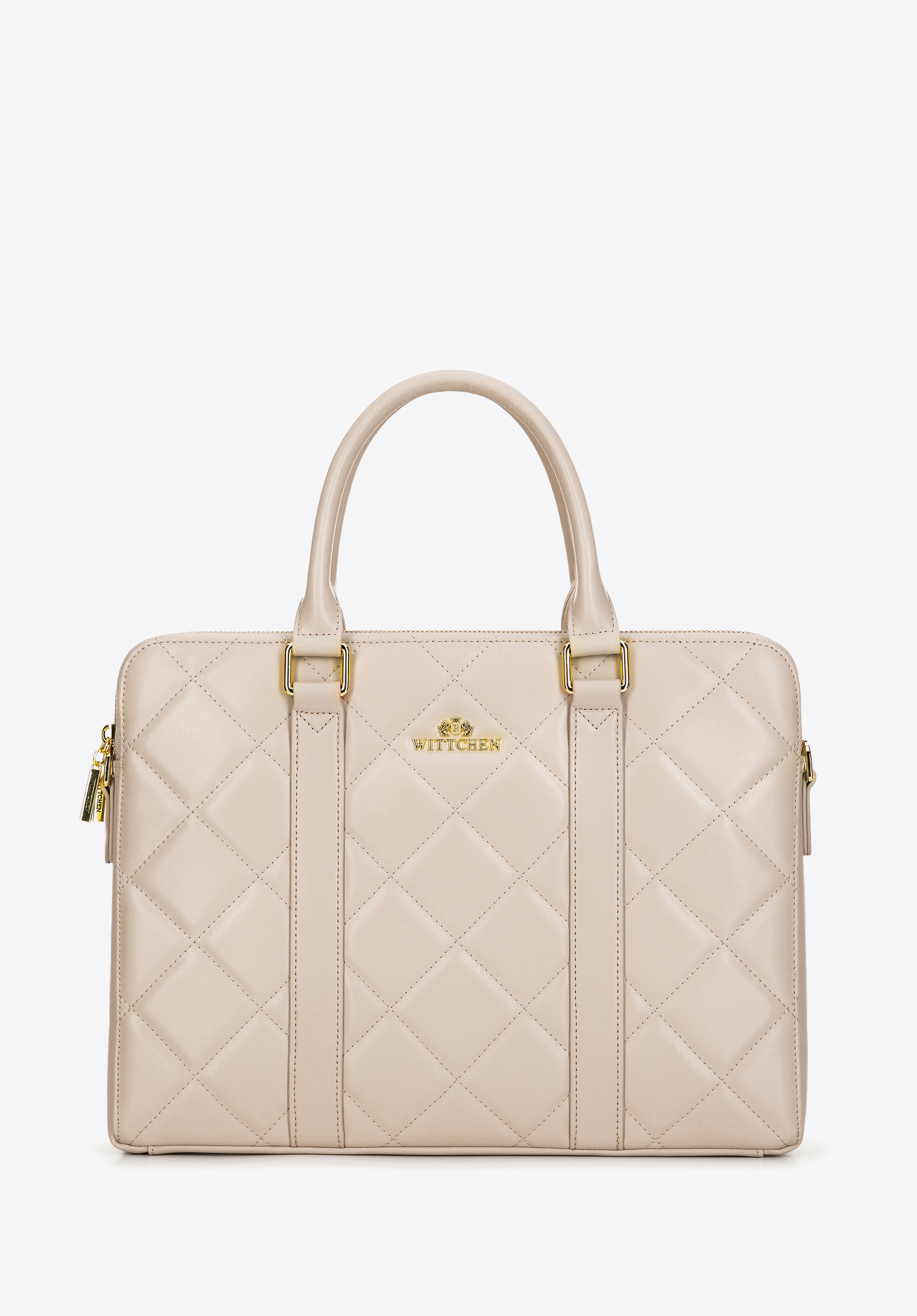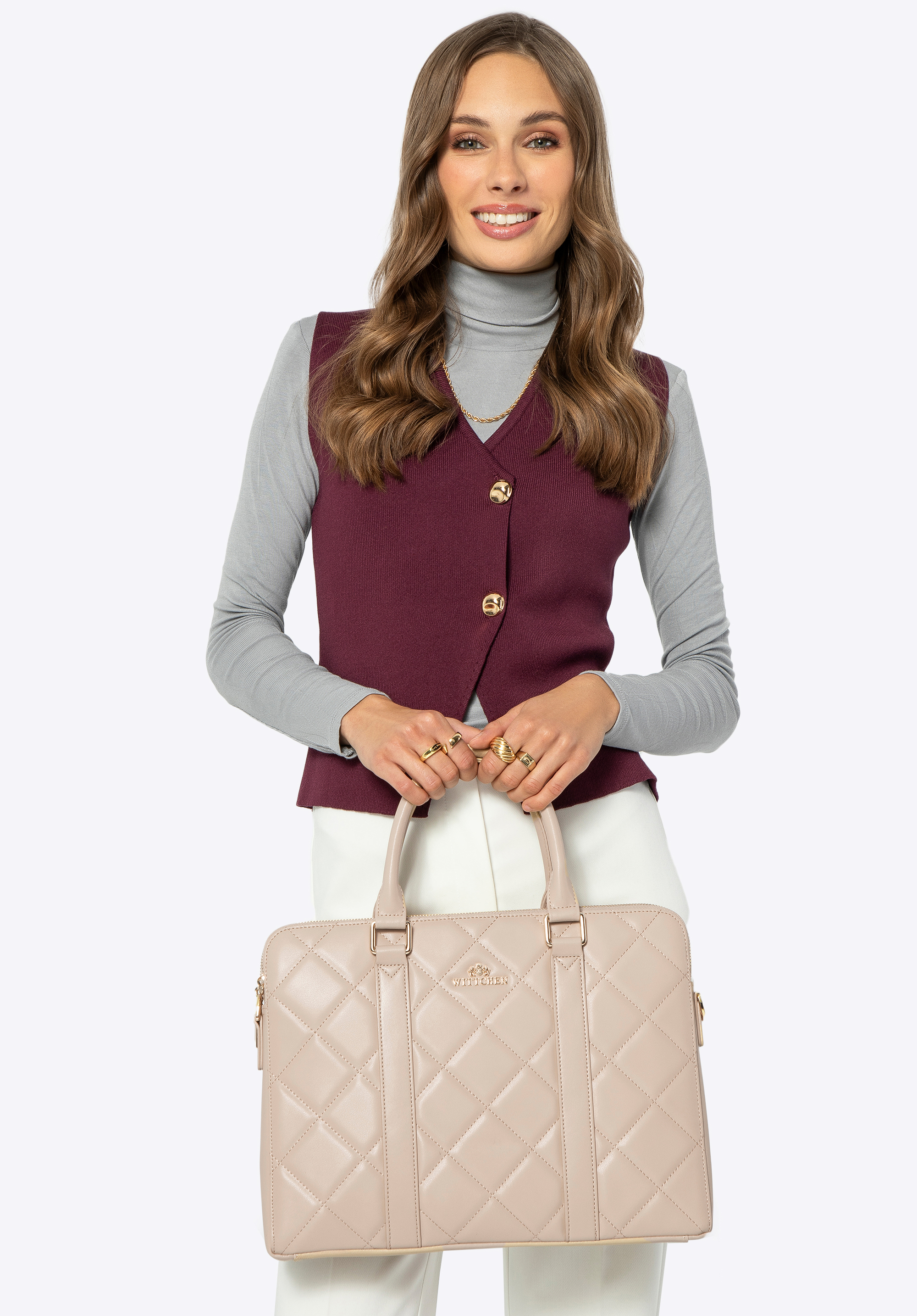Elegancka damska torba na laptopa, wykonana z wysokiej jakości skóry naturalnej, łączy w sobie funkcjonalność z nowoczesnym designem. Jej front zdobi geometryczne pikowanie, które nadaje jej wyjątkowy charakter, a subtelne logo producenta podkreśla ekskluzywny wygląd.