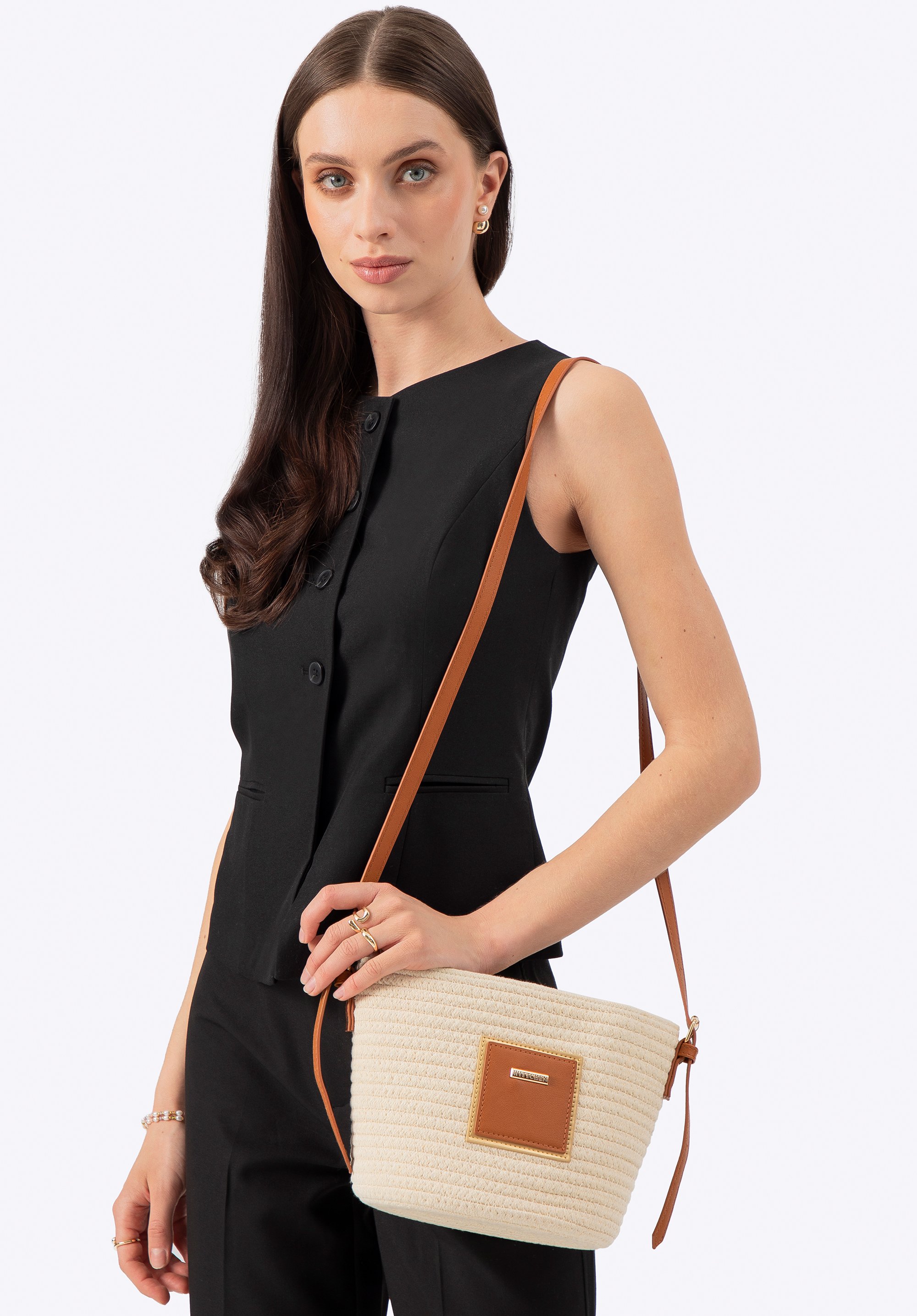 Nasza rada: Torebka typu koszyk świetnie komponuje się z lekkimi, letnimi stylizacjami. W połączeniu z plecionymi balerinami lub sandałami stworzysz idealną wakacyjną stylizację, która zachwyci prostotą i elegancją. Może być noszona także jako crossbody, dzięki regulowanemu paskowi, co zapewnia wygodę i swobodę ruchów w każdej sytuacji.