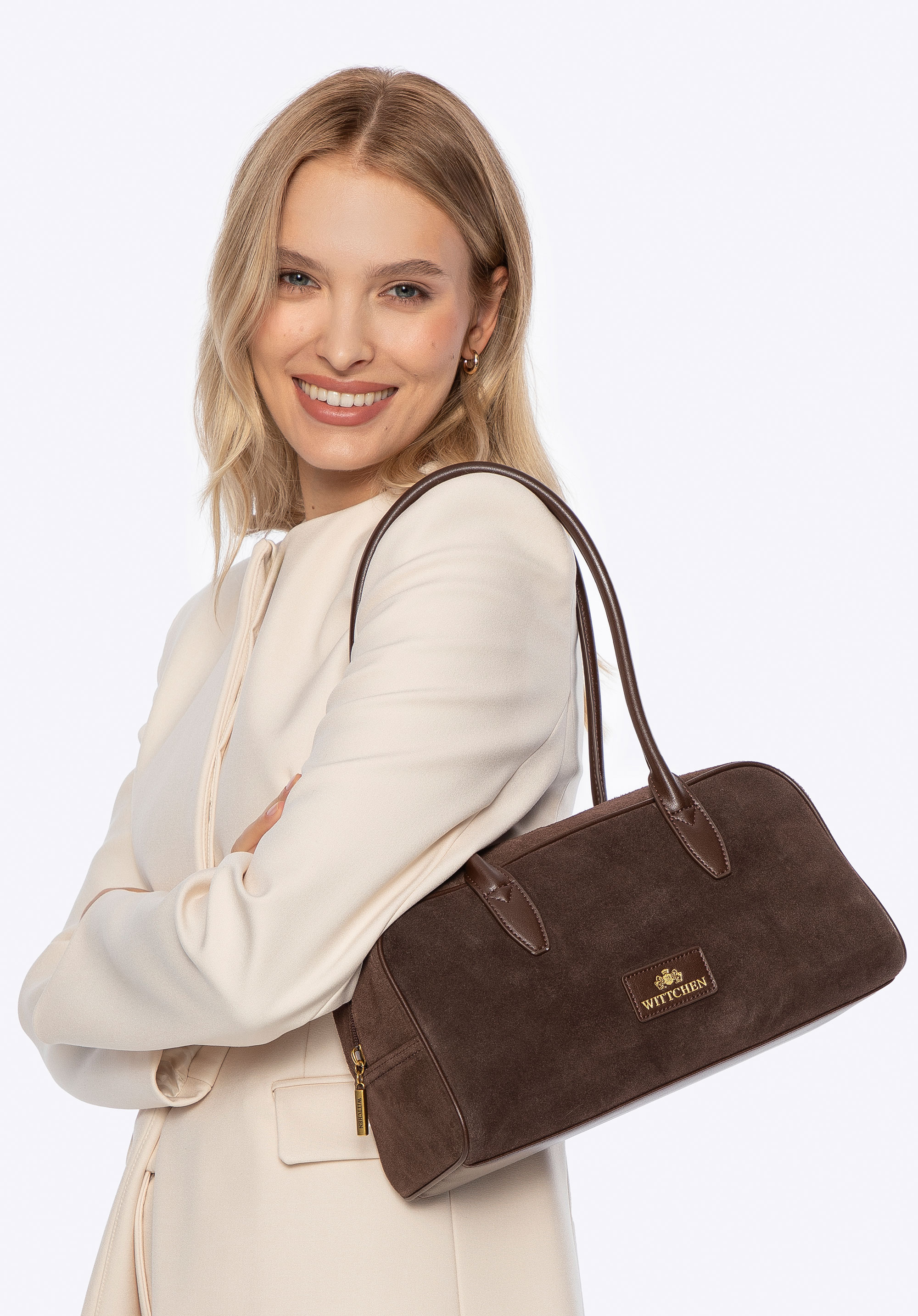 - Materiał: Skóra naturalna w korpusie o dwóch fakturach – zamszowej i gładkiej – połączona z rączkami i eleganckimi detalami z mikrofibry (doskonale imitującej skórę naturalną), które dodają szyku.