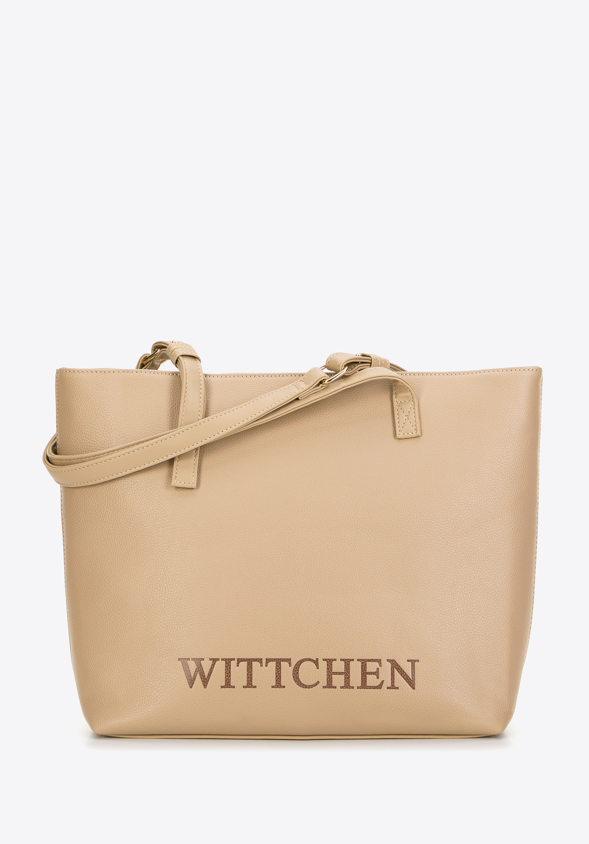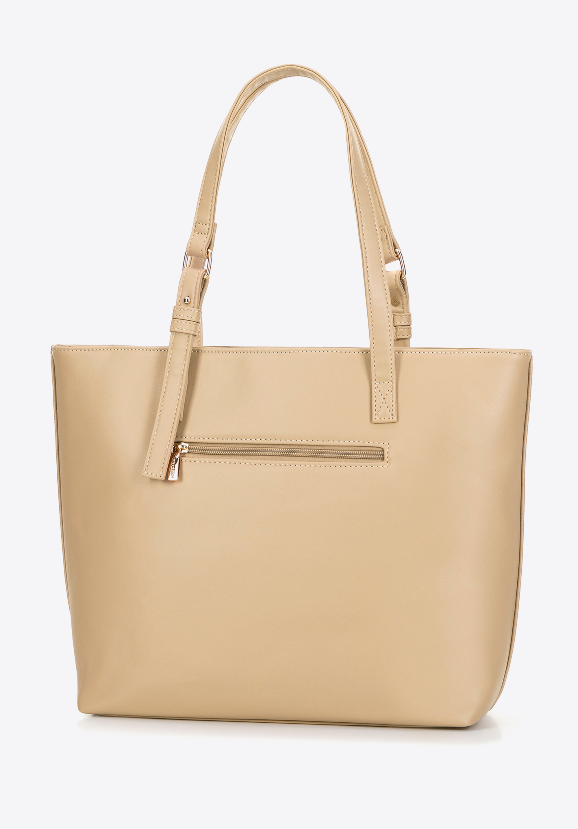 Odkryj idealną torebkę shopperkę ze skóry ekologicznej, która jest połączeniem stylu i funkcjonalności. Przestronny jednokomorowy model, z jedną kieszenią na suwak i drugą otwartą, ułatwia organizację i oferuje miejsce na wszystkie najpotrzebniejsze rzeczy. Lekko usztywnione dno utrzymuje doskonały kształt torby bez względu na zawartość, a tylna kieszeń na suwak to idealne miejsce na drobiazgi, które zawsze chcesz mieć pod ręką. Ta torebka shopperka jest nie tylko praktyczna, ale i szykowna. Eleganckie, tłoczone logo dodaje jej klasy, idealnie komponując się z każdą stylizacją.