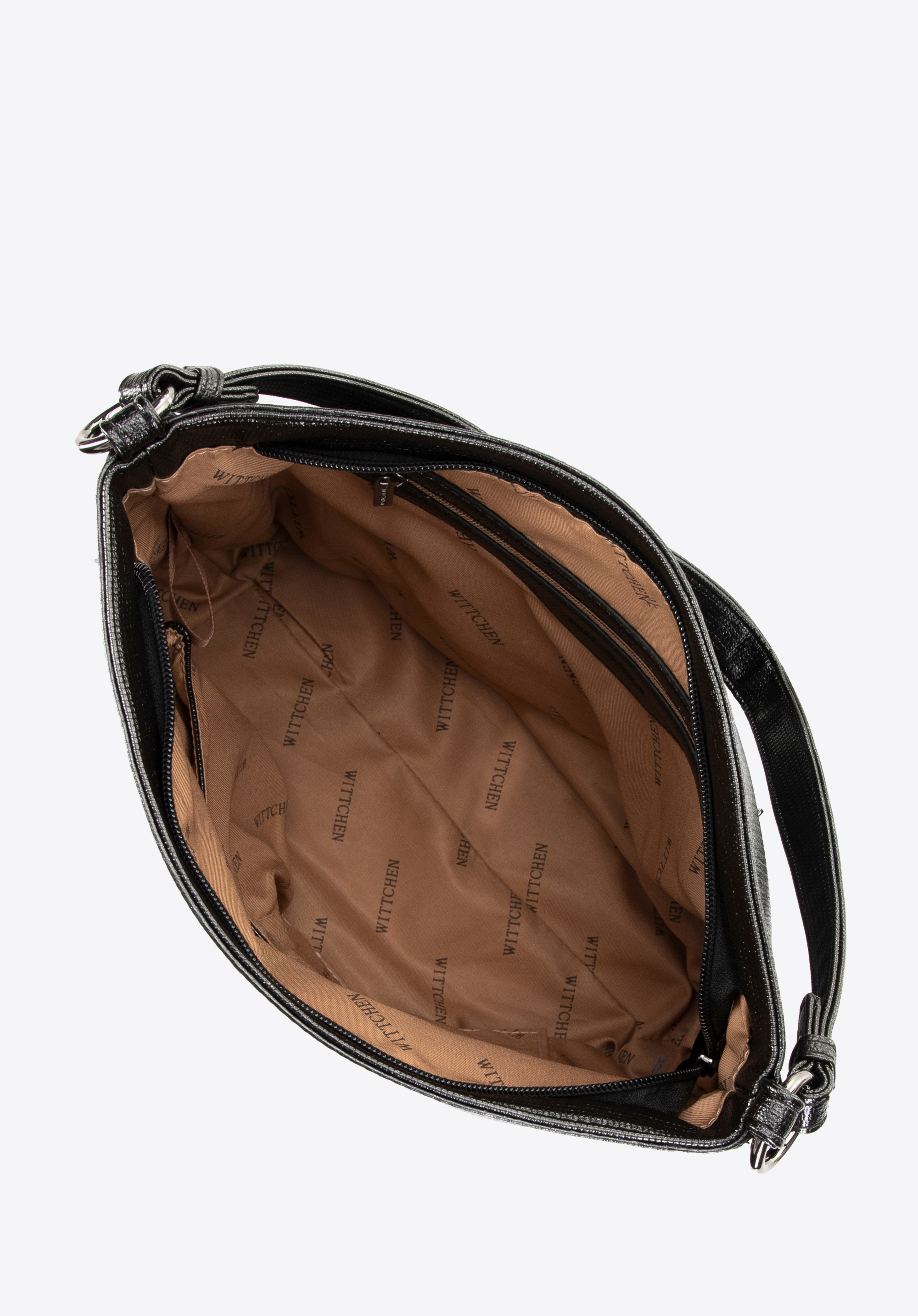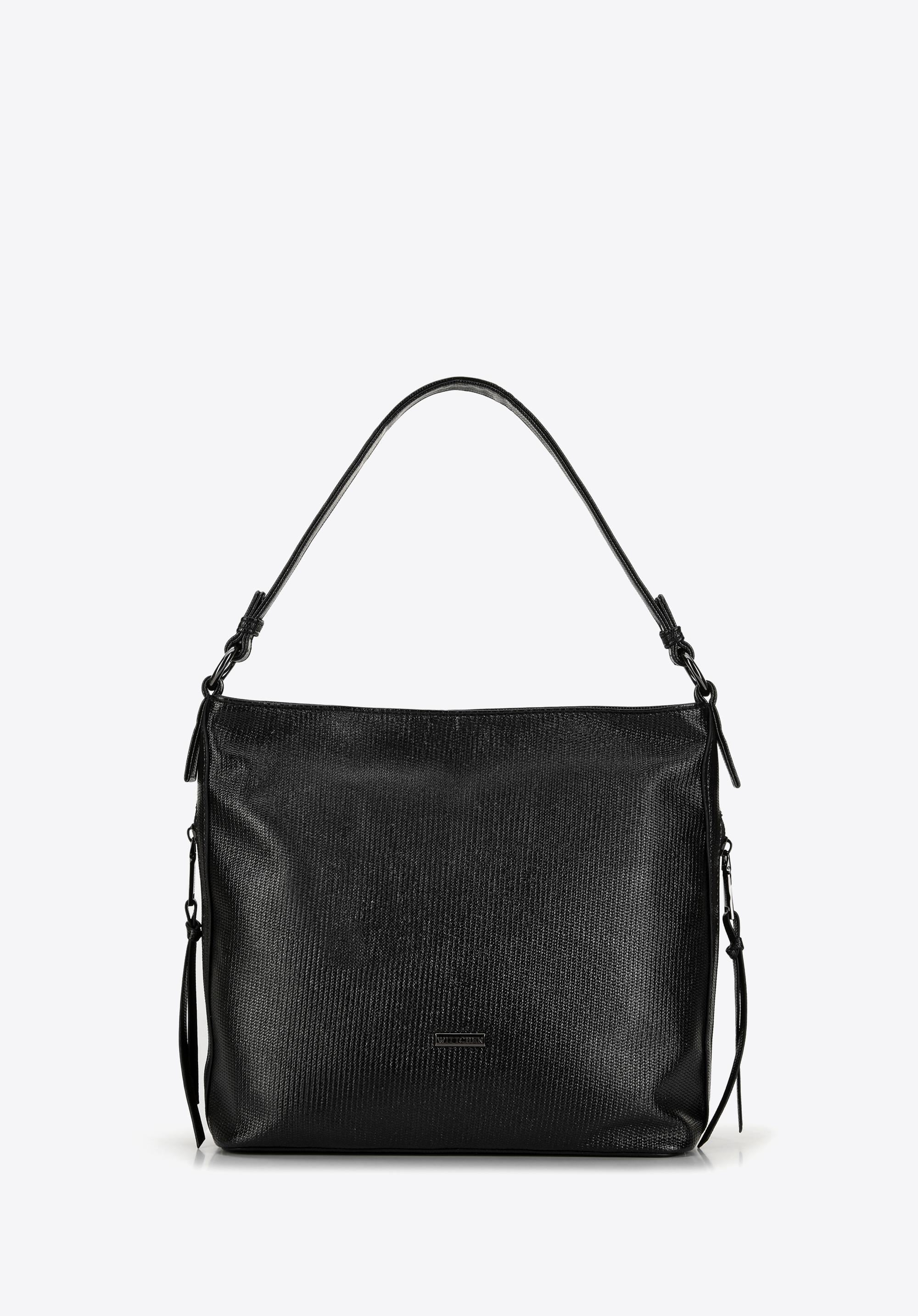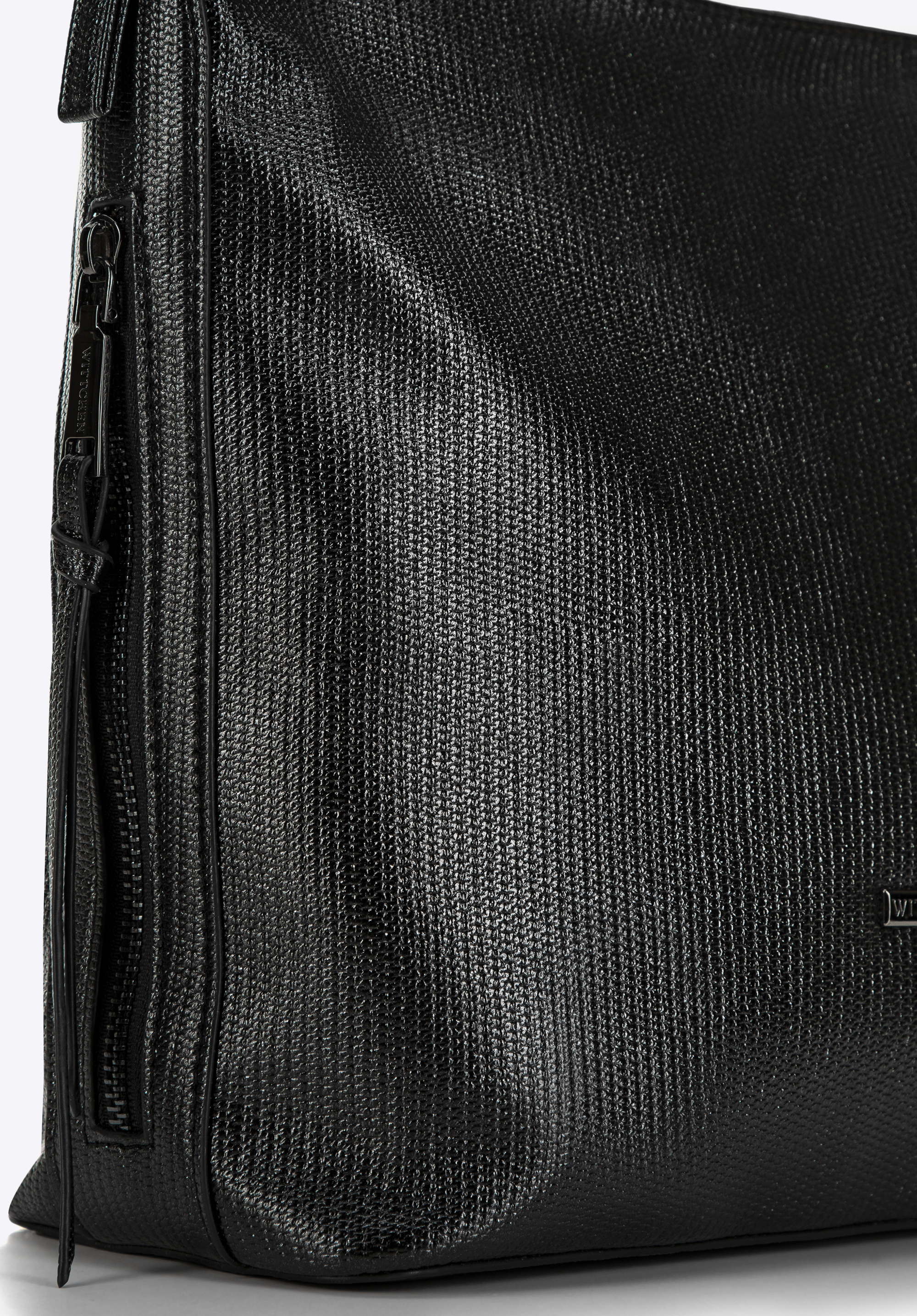Poznaj elegancką i funkcjonalną torebkę, która zrewolucjonizuje Twoje codzienne stylizacje. Model typu worek wykonany z połyskującej ekoskóry dodaje eleganckiego i nowoczesnego wyglądu. Jednokomorowe wnętrze gwarantuje przestronność i porządek, pozwalając łatwo zorganizować wszystkie niezbędne rzeczy. Usztywniane dno zapewnia stabilność torebki, dzięki czemu prezentuje się nienagannie. Stylowa rączka umożliwia komfortowe noszenie zarówno na ramieniu, jak i w dłoni, zaś płytkie kieszenie po bokach z ozdobnymi chwostami dodają jej wyjątkowego uroku. Z tyłu torebki znajduje się dodatkowa kieszeń na zamek błyskawiczny, doskonała na rzeczy, które chcesz mieć pod ręką, na przykład bilet czy portfel.