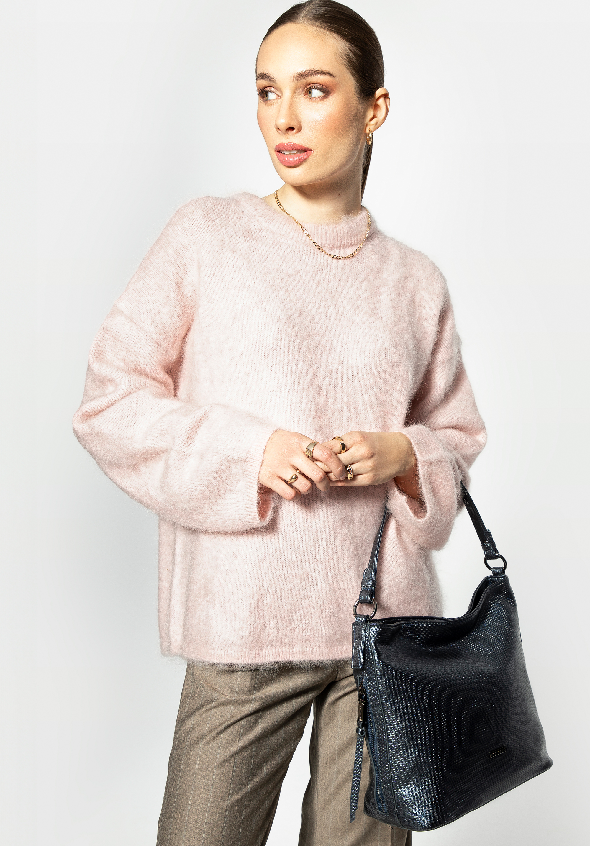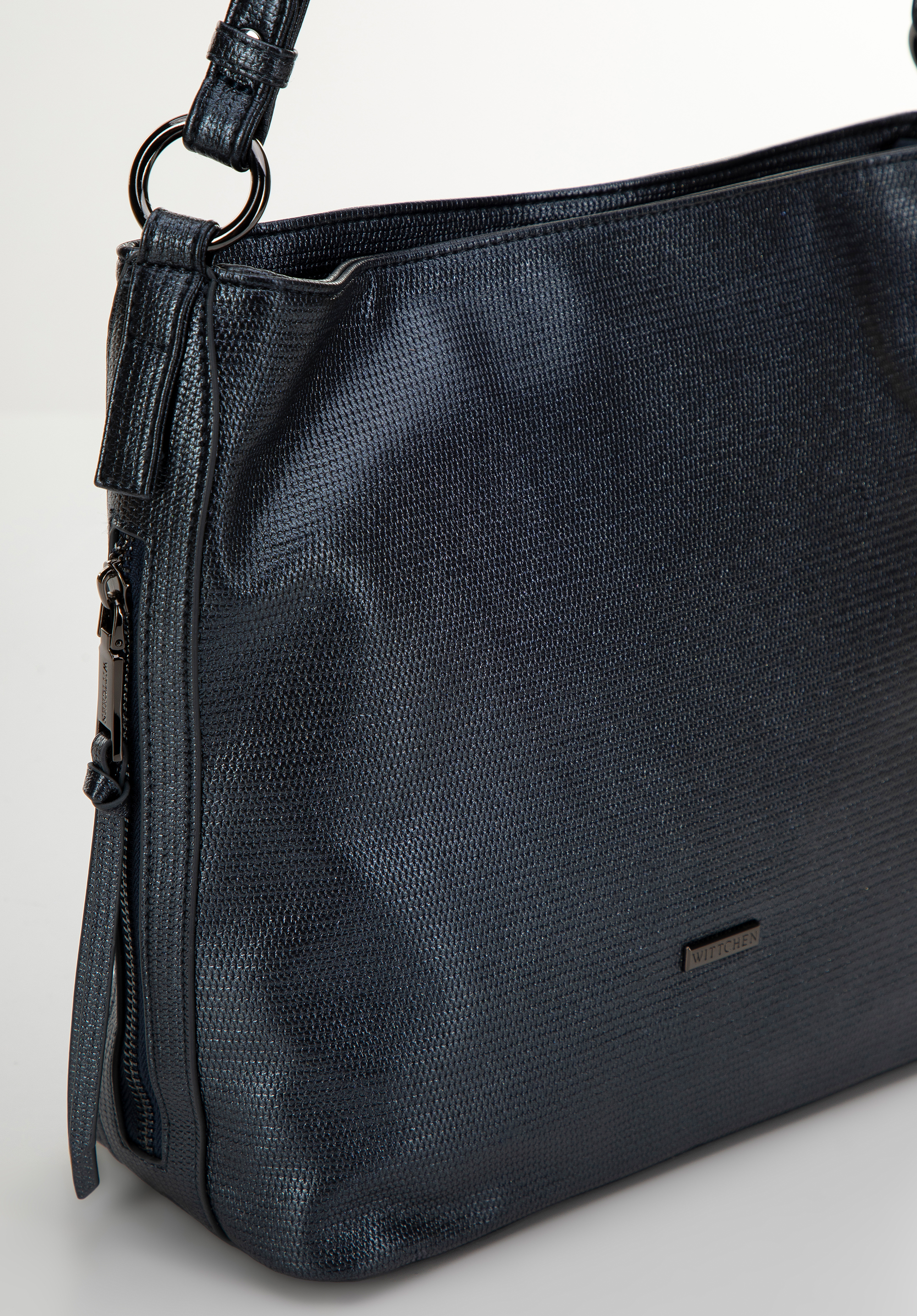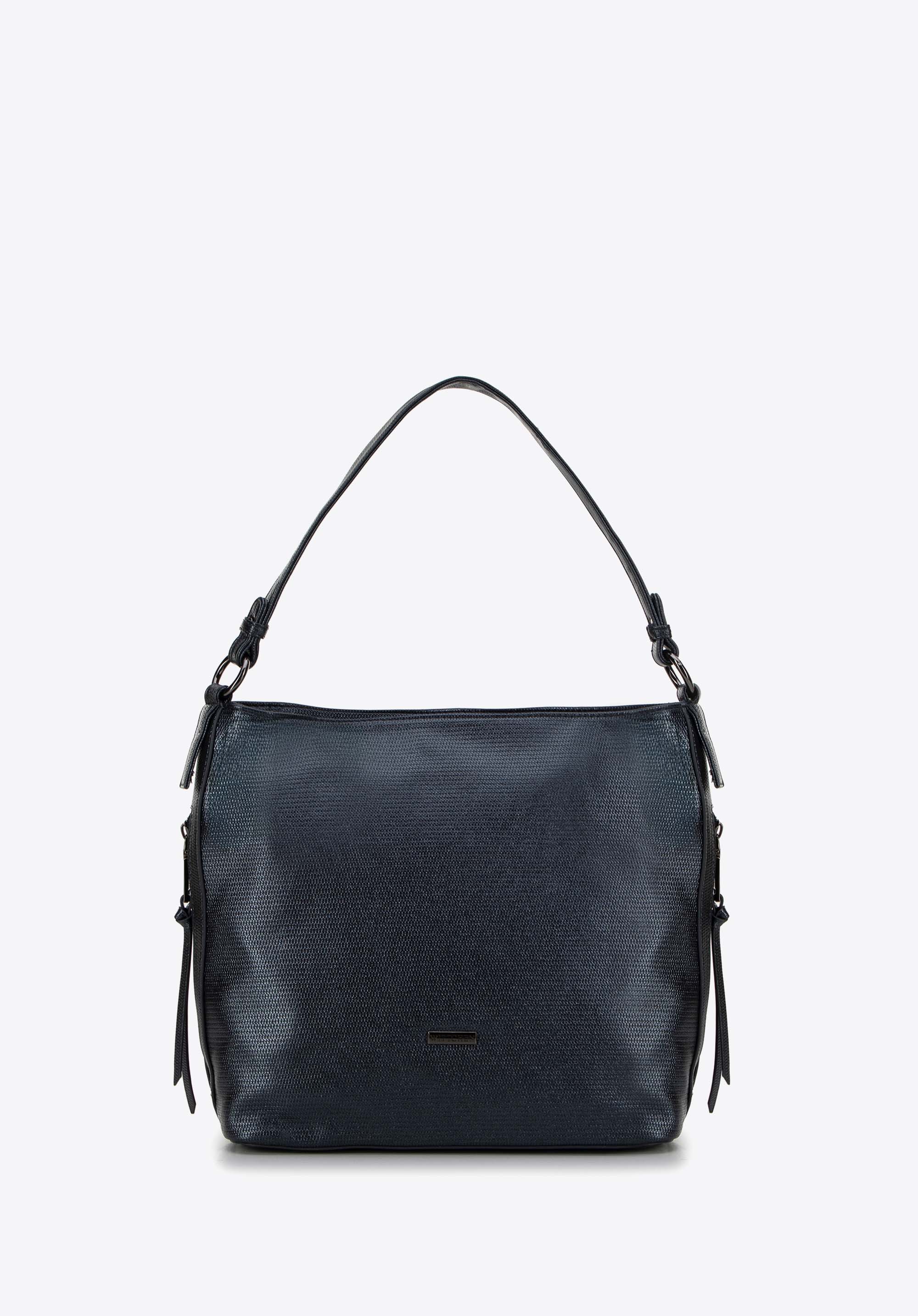 Poznaj elegancką i funkcjonalną torebkę, która zrewolucjonizuje Twoje codzienne stylizacje. Model typu worek wykonany z połyskującej ekoskóry dodaje eleganckiego i nowoczesnego wyglądu. Jednokomorowe wnętrze gwarantuje przestronność i porządek, pozwalając łatwo zorganizować wszystkie niezbędne rzeczy. Usztywniane dno zapewnia stabilność torebki, dzięki czemu prezentuje się nienagannie. Stylowa rączka umożliwia komfortowe noszenie zarówno na ramieniu, jak i w dłoni, zaś płytkie kieszenie po bokach z ozdobnymi chwostami dodają jej wyjątkowego uroku. Z tyłu torebki znajduje się dodatkowa kieszeń na zamek błyskawiczny, doskonała na rzeczy, które chcesz mieć pod ręką, na przykład bilet czy portfel.