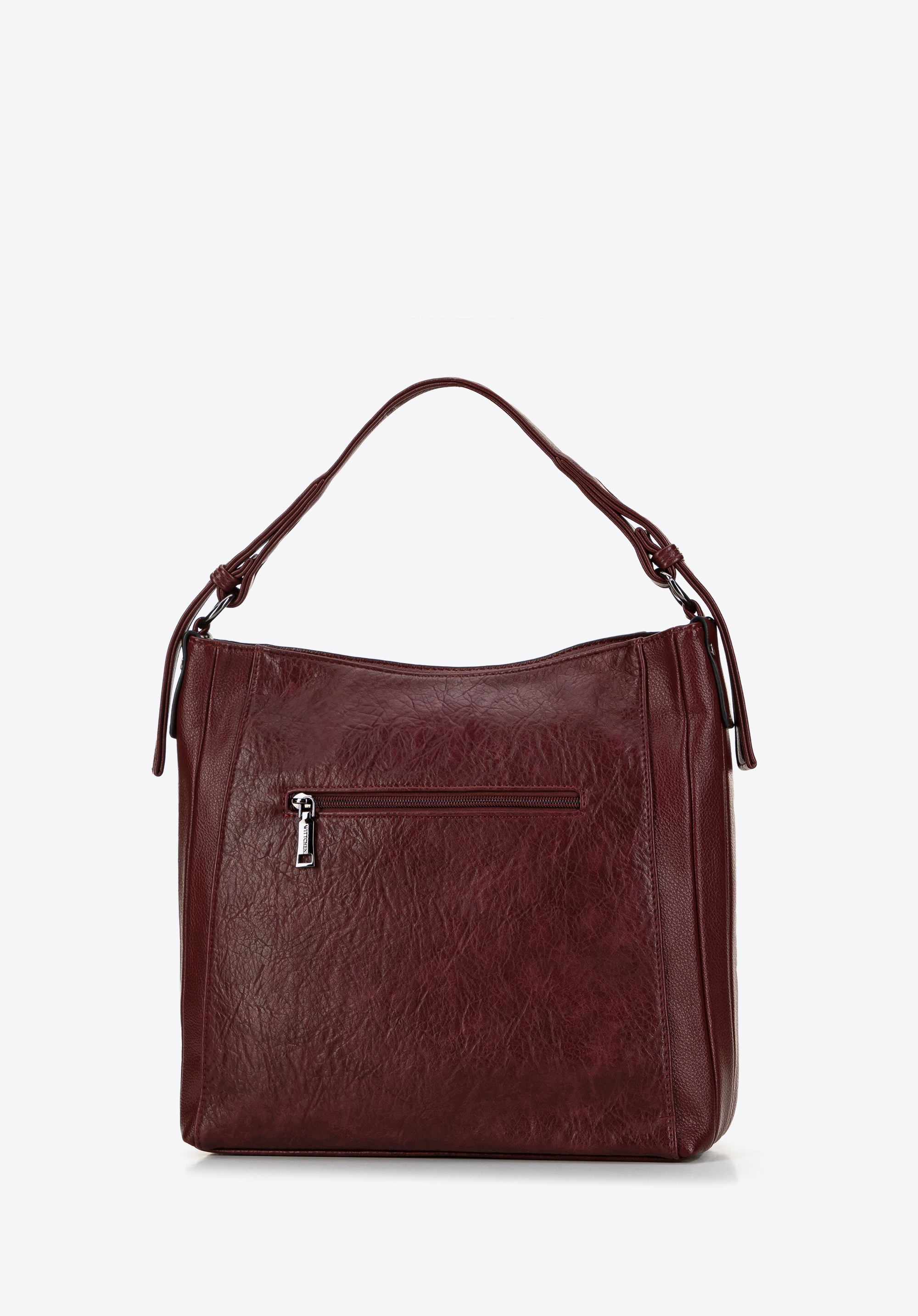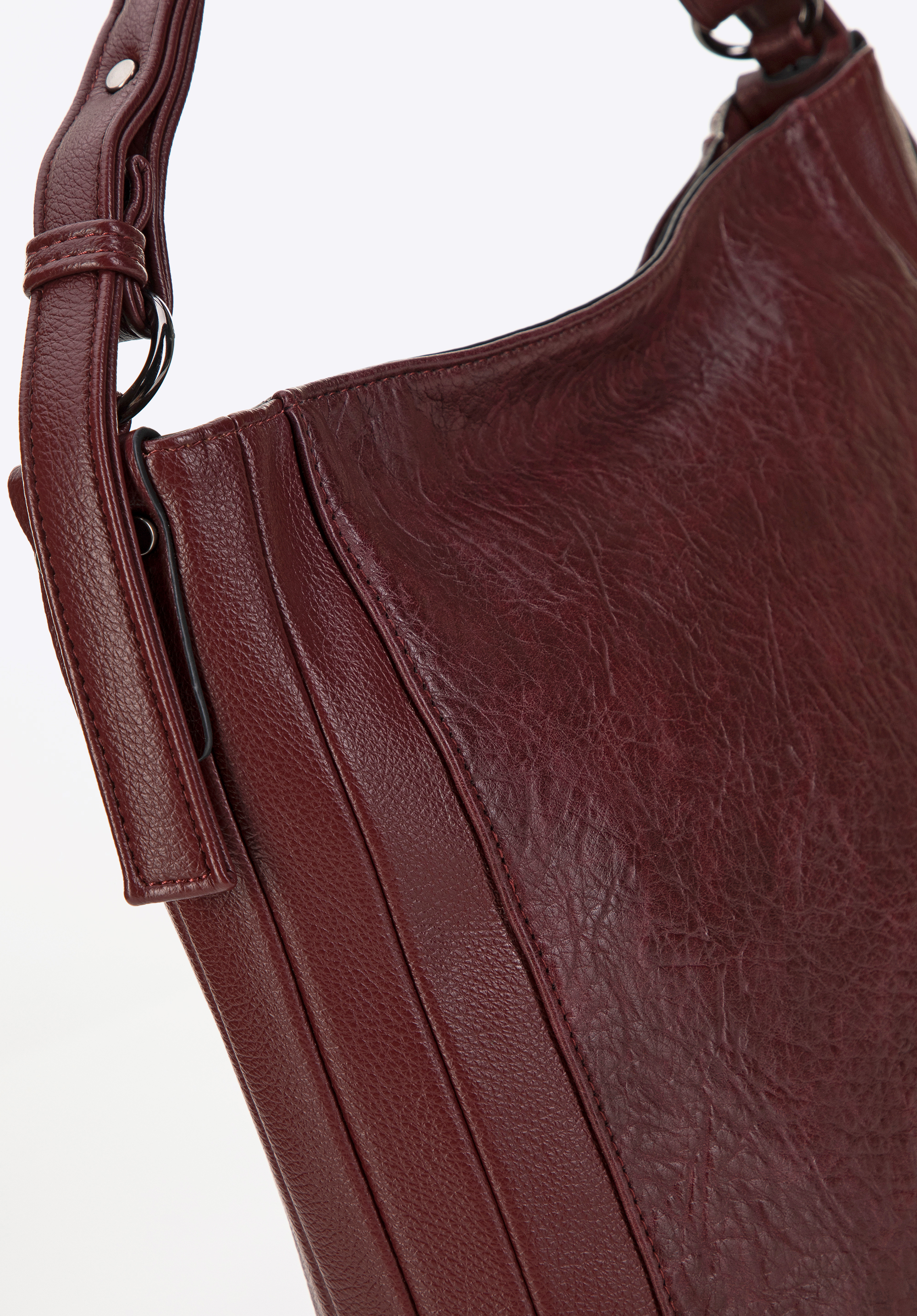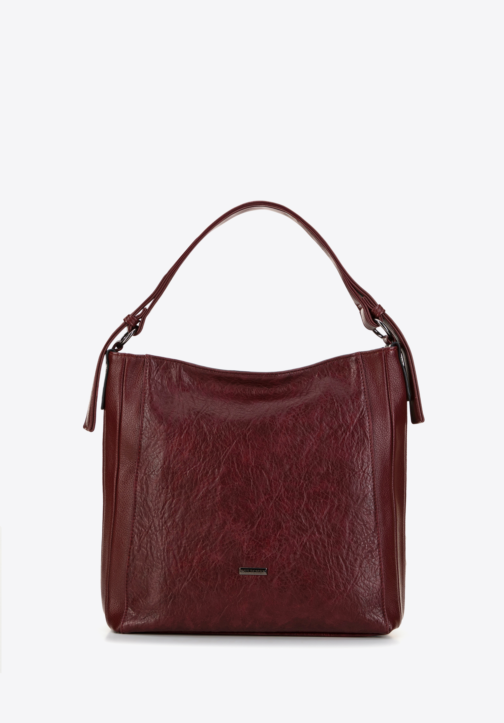 - Design: Torebka w kształcie worka z ozdobnymi przeszyciami na bokach oraz jedną rączką zdobioną nitami.