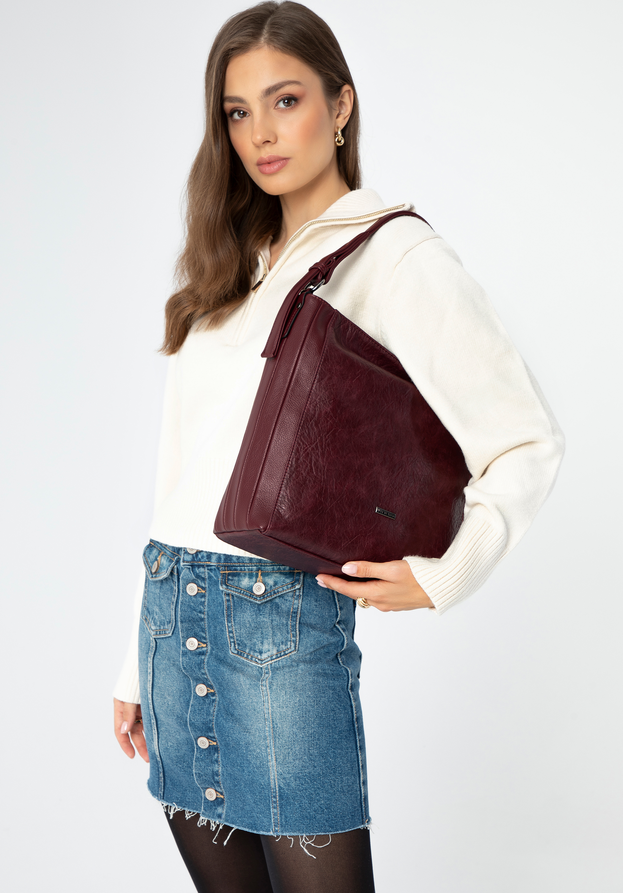 Damska torebka worek z ekoskóry z nitami pasuje do miejskich stylizacji od porannej kawy po wieczorne wyjście, kiedy liczy się swoboda i wyrazisty detal. Stabilne dno, wygodna rączka z nitami oraz praktyczne kieszenie pomagają zorganizować zawartość i bezpiecznie przechować najcenniejsze drobiazgi.