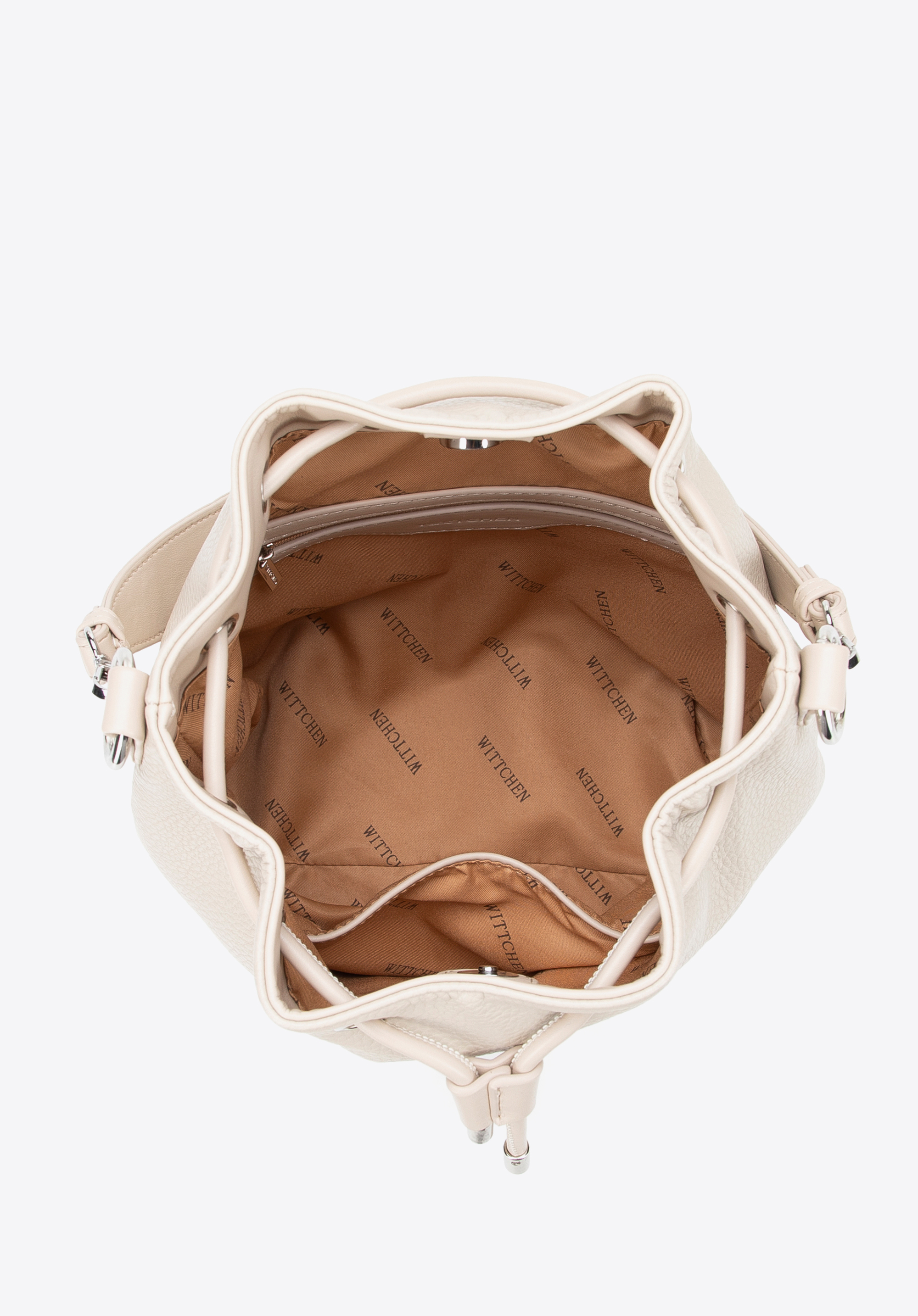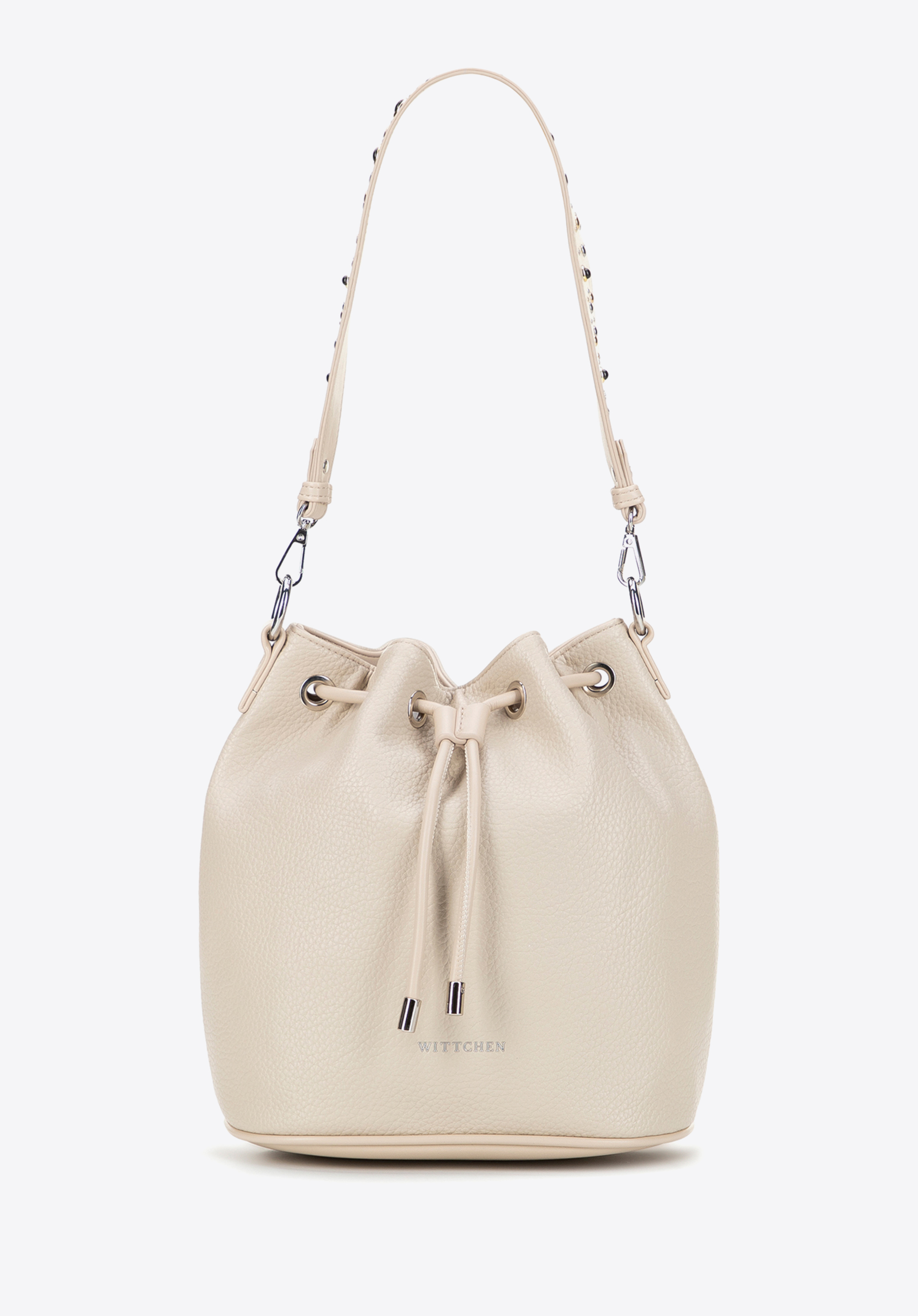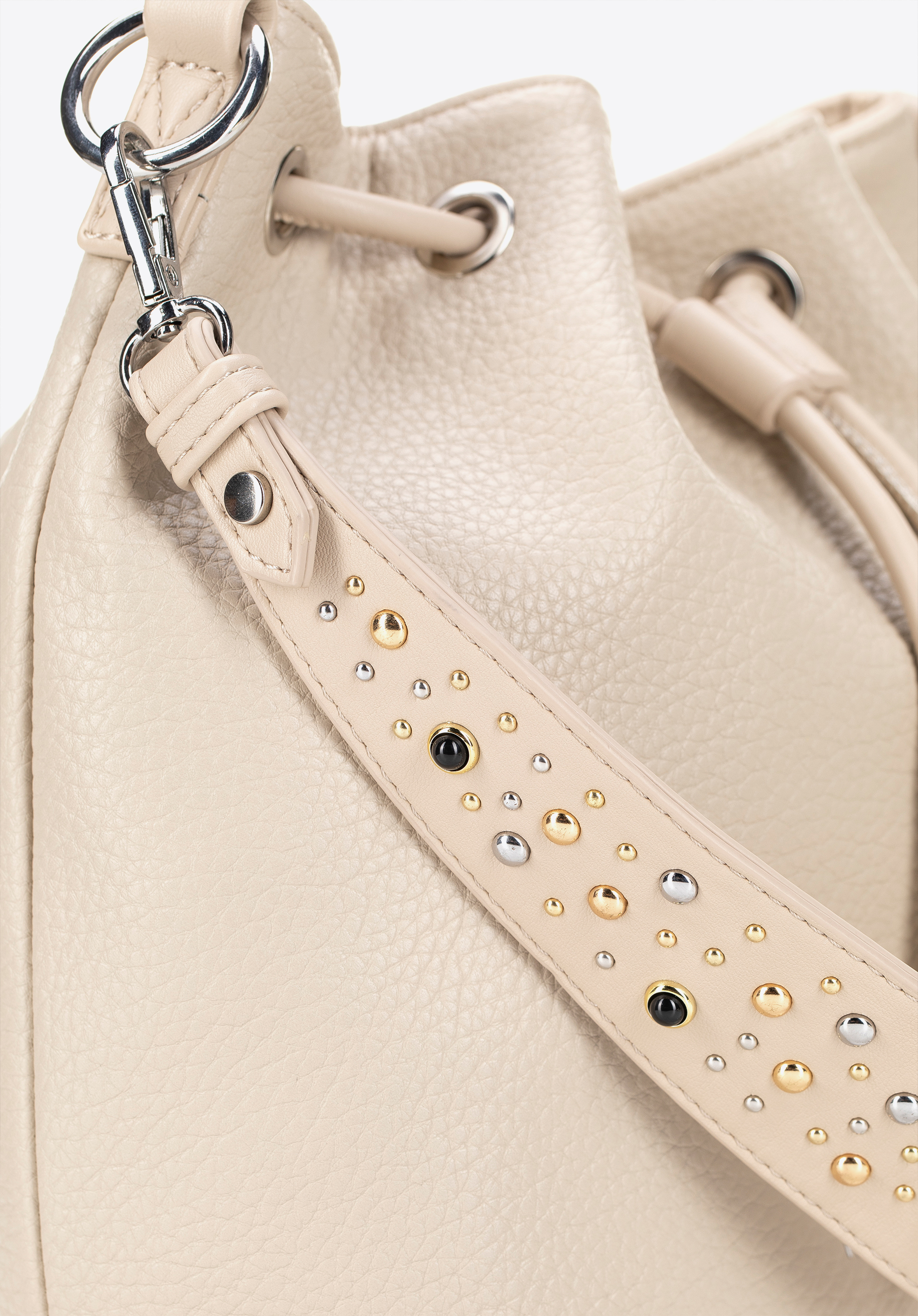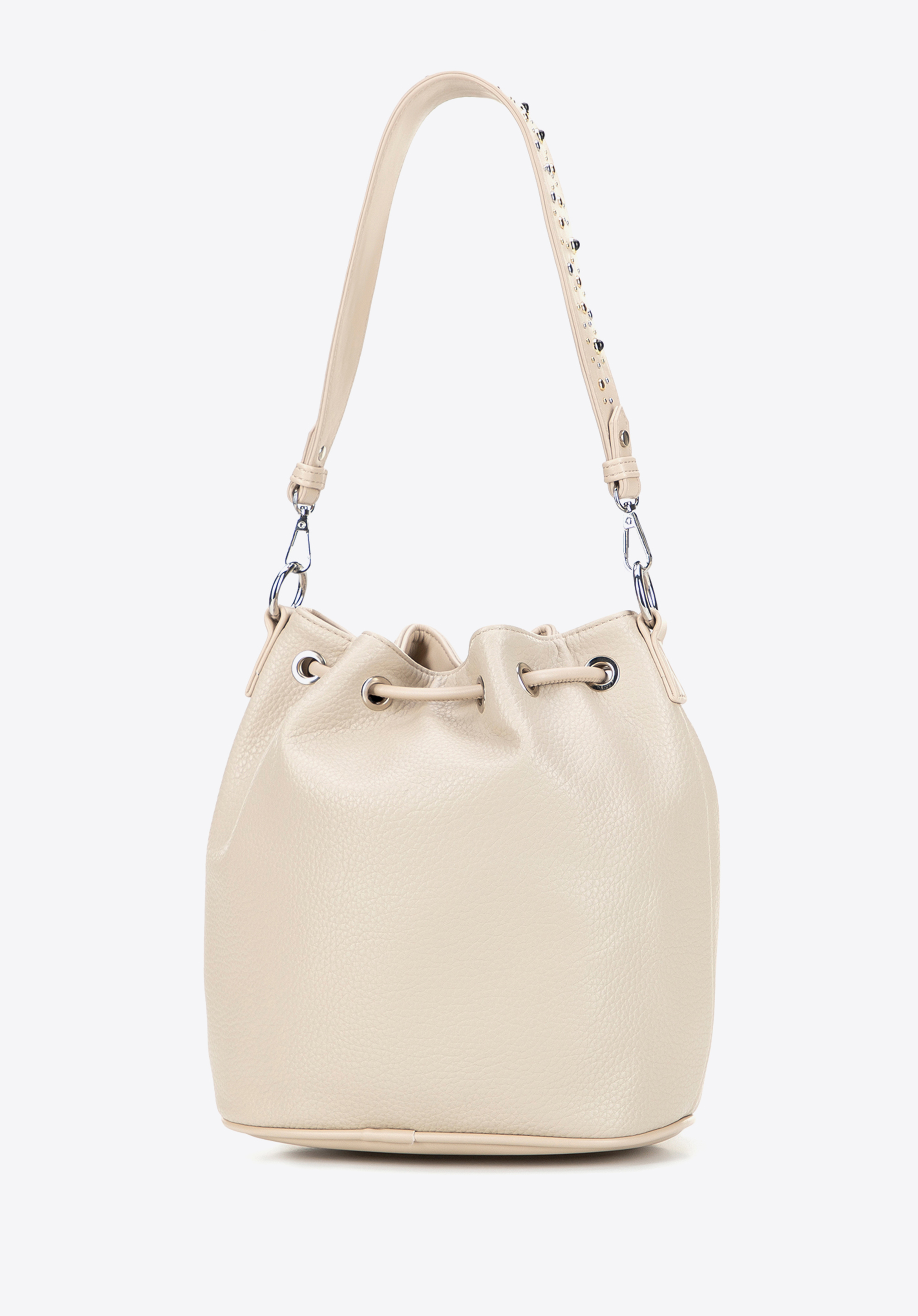 Połącz stylowy wygląd z praktycznością dzięki tej wyjątkowej torebce typu worek. Jej charakterystyczny kształt przyciąga wzrok, a odpinana rączka pozwala wygodnie nosić torbę w dłoni. Zapięcie na magnes i ściągacz chroni zawartość, a wnętrze z dwiema kieszeniami, w tym jedną na zamek, pomaga utrzymać porządek i szybki dostęp do najważniejszych drobiazgów.