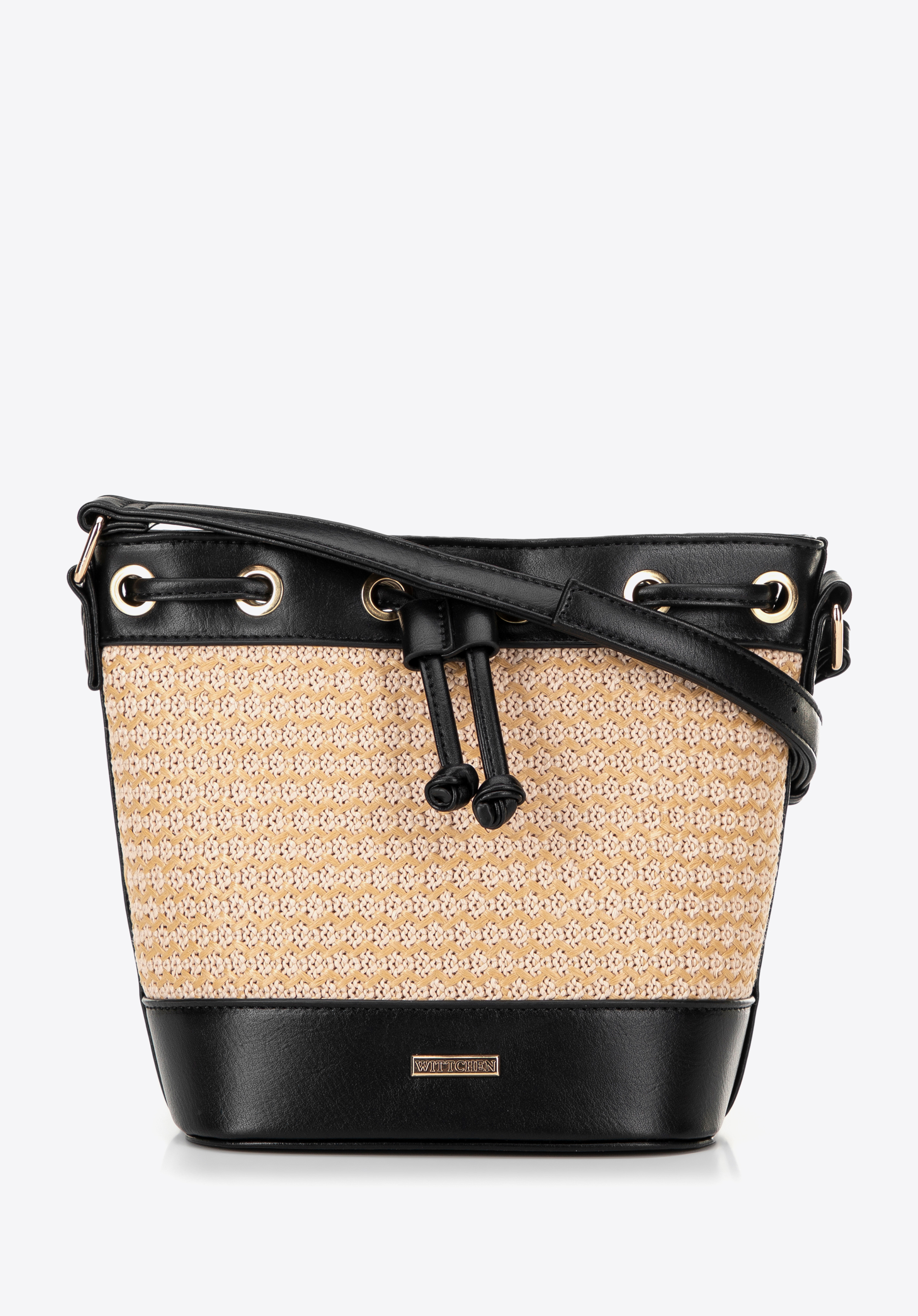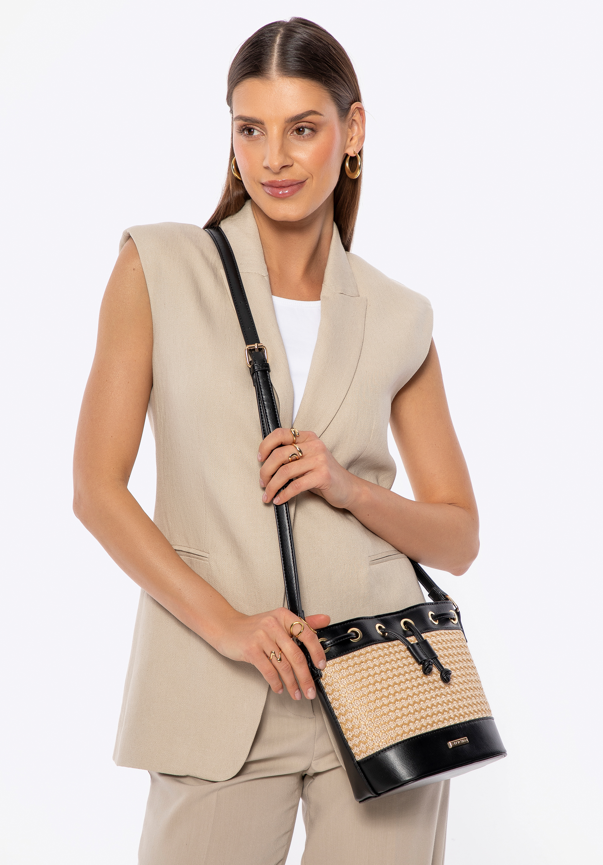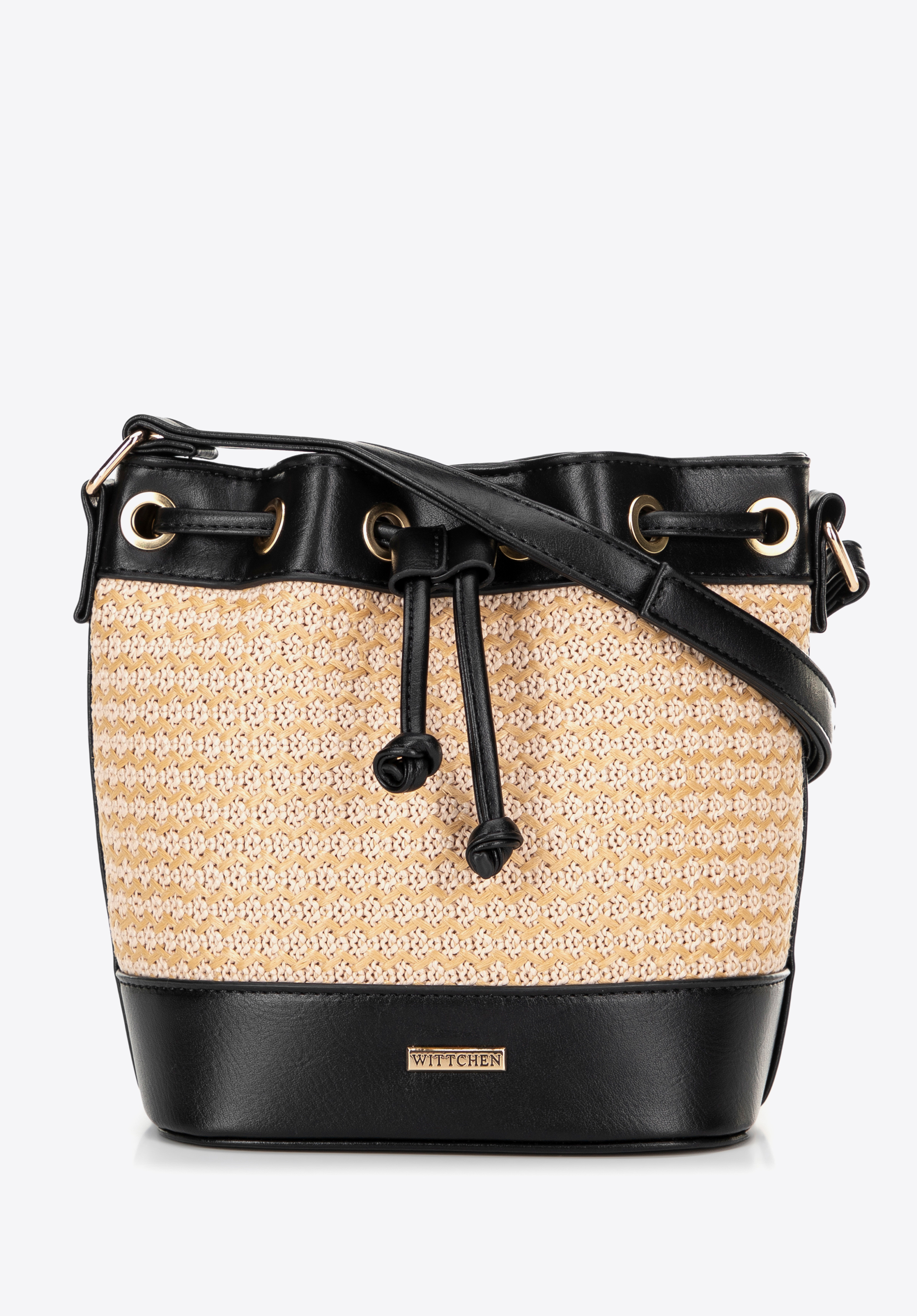 Damska torebka worek z plecionki czarno - beżowa