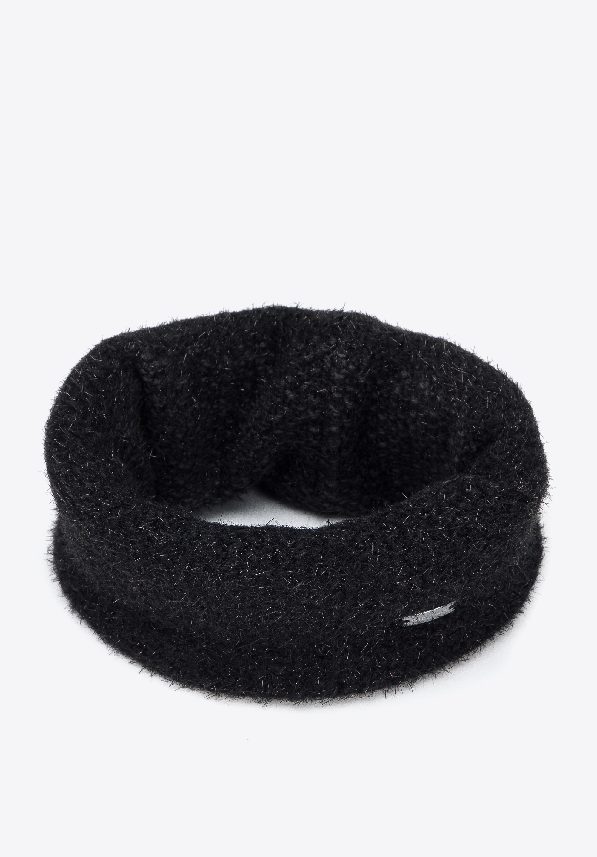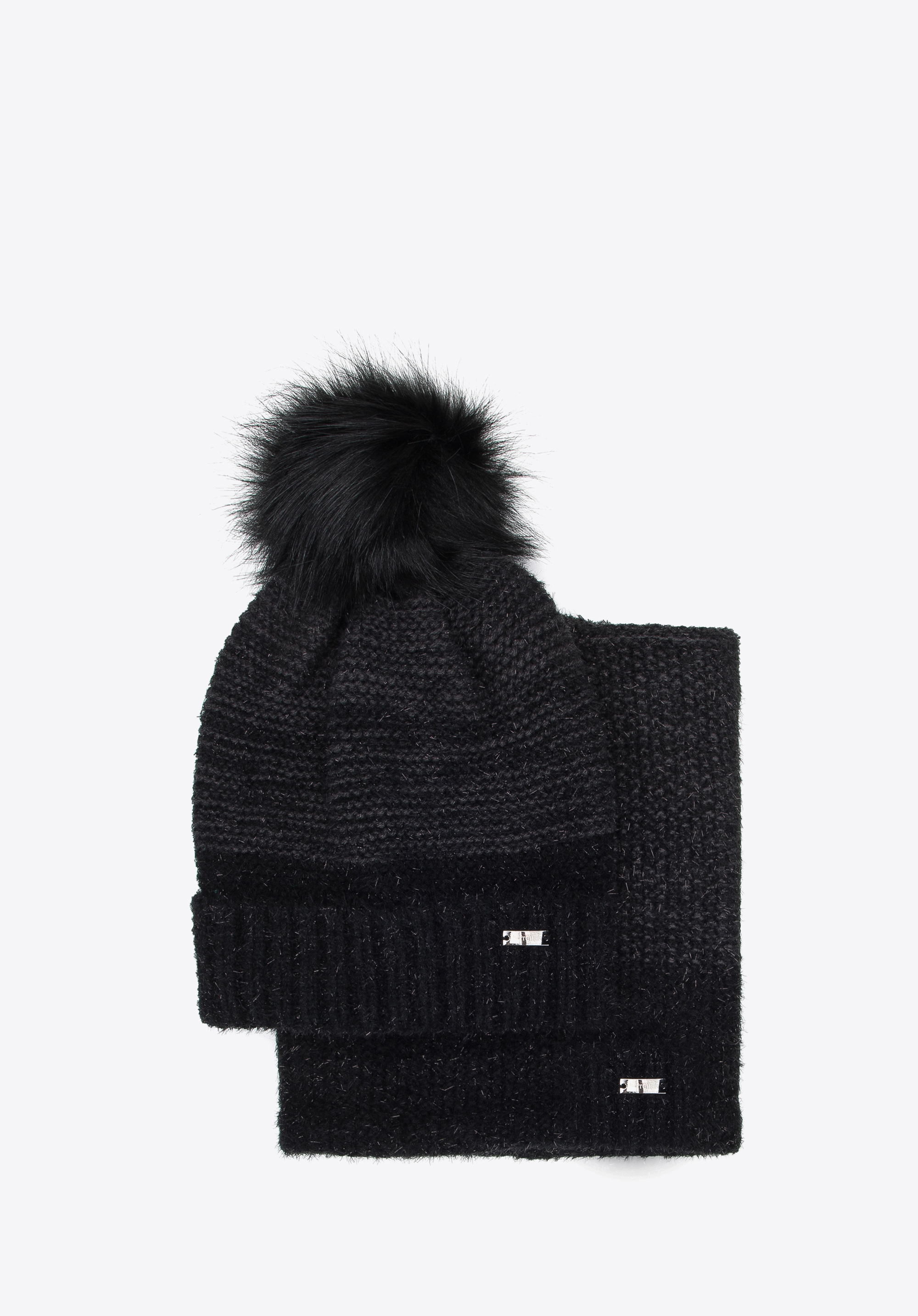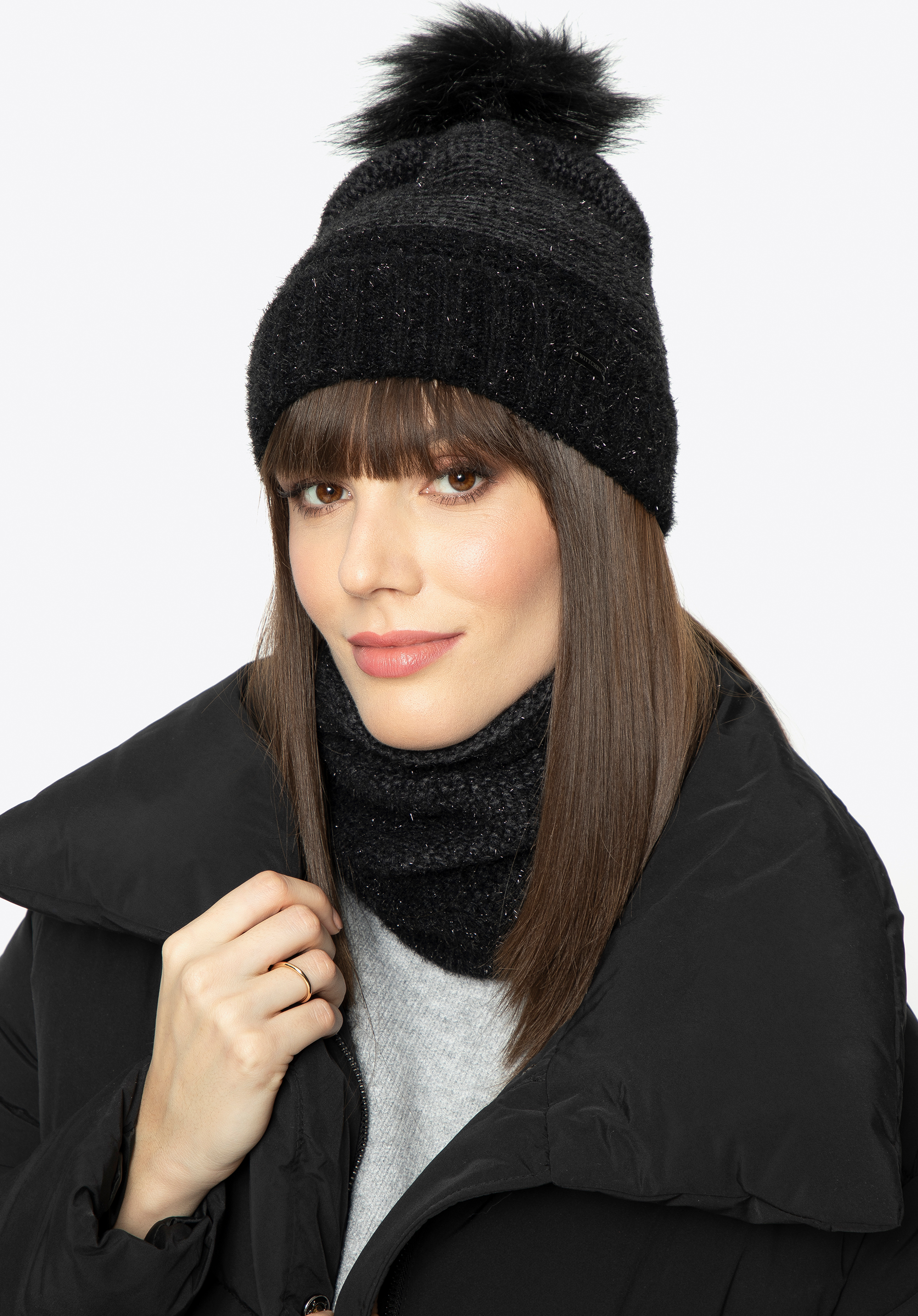 Czapka wykończona jest wywiniętym ściągaczem oraz pomponem ze sztucznego futerka. Wysoki i dość wąski komin ładnie układa się przy szyi, a od wewnątrz podszyty jest miękkim polarem. Damski komplet zimowy z błyszczącą nitką ozdobi gładki zimowy płaszcz i doda szyku pikowanej, krótkiej kurtce.