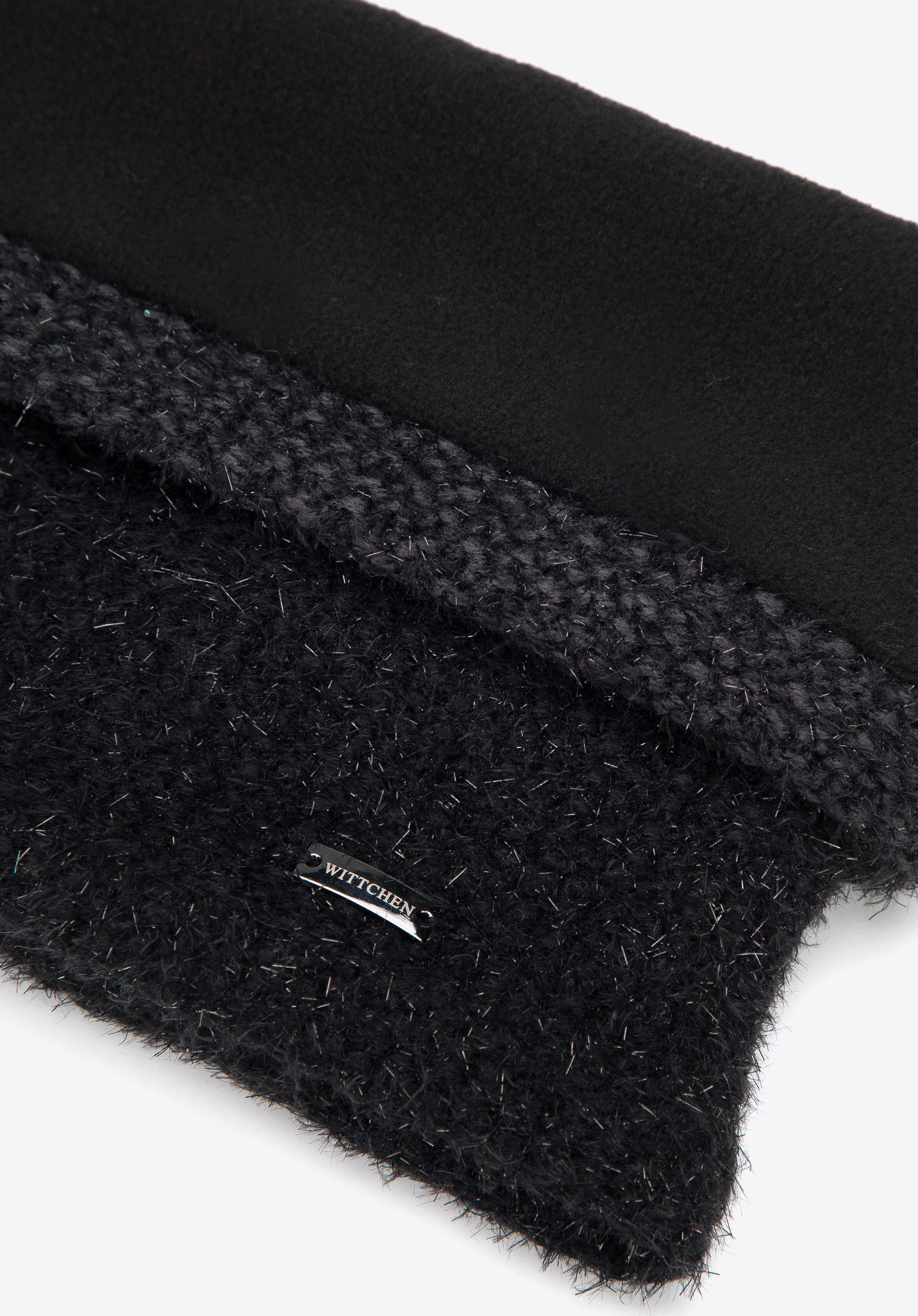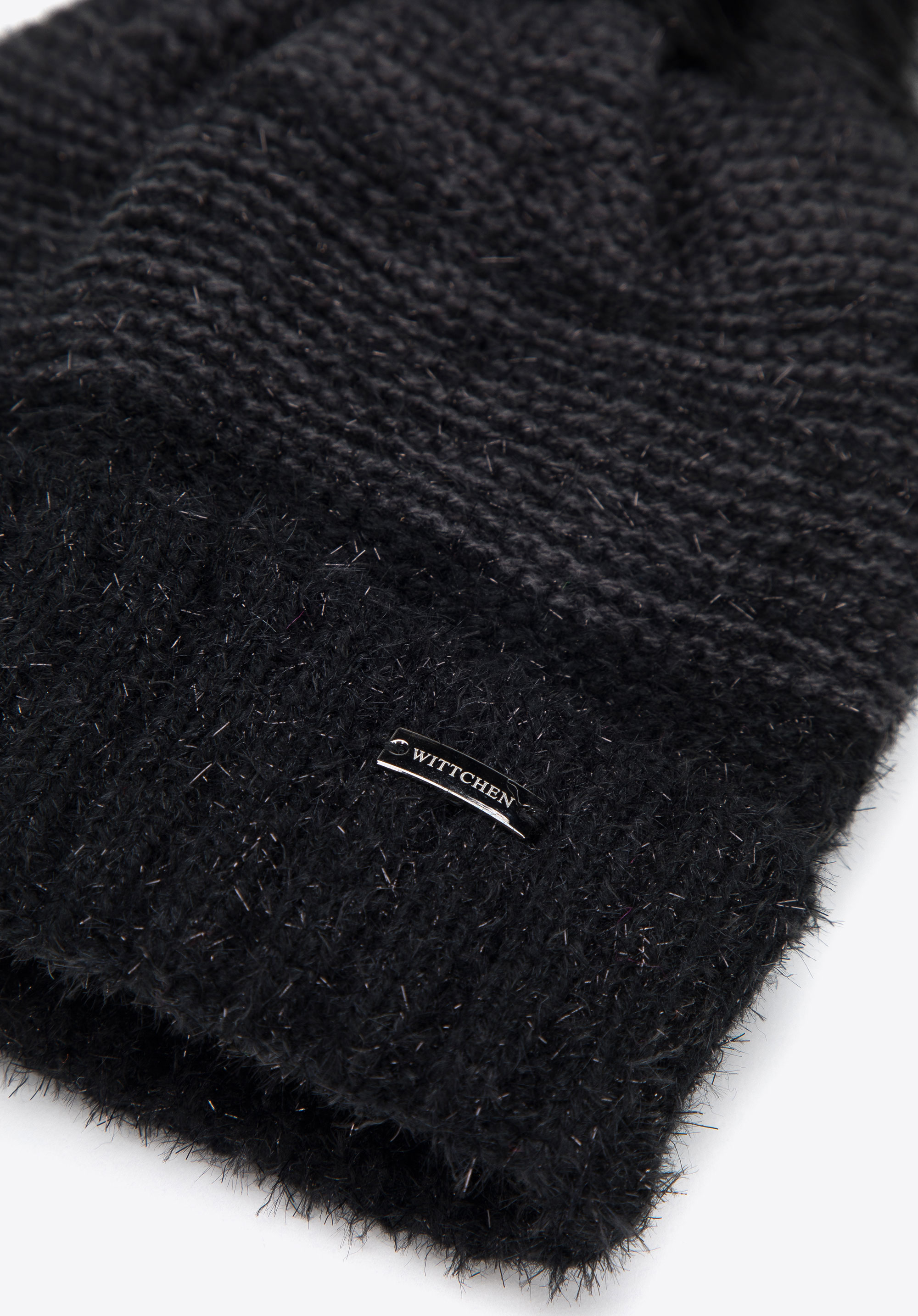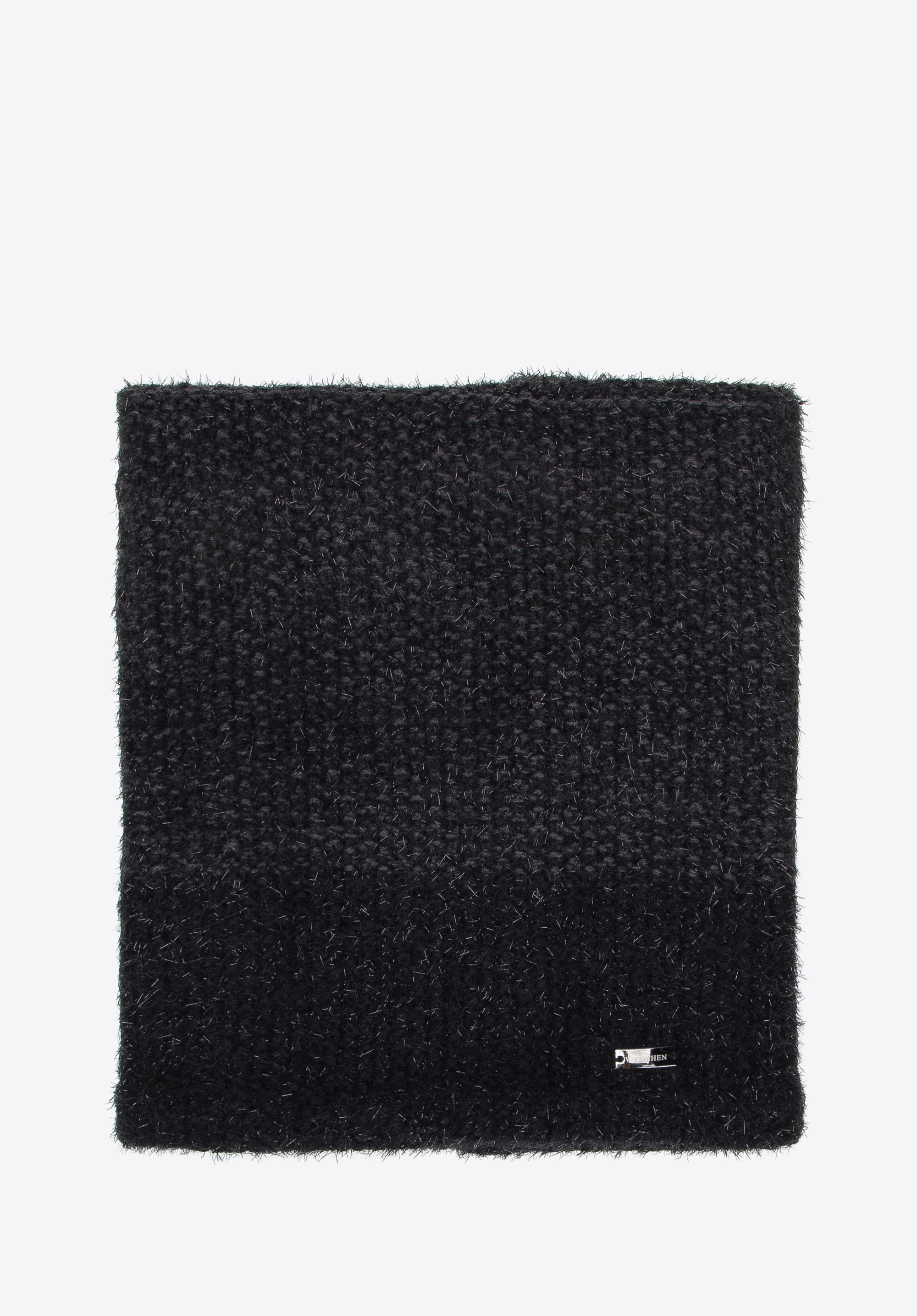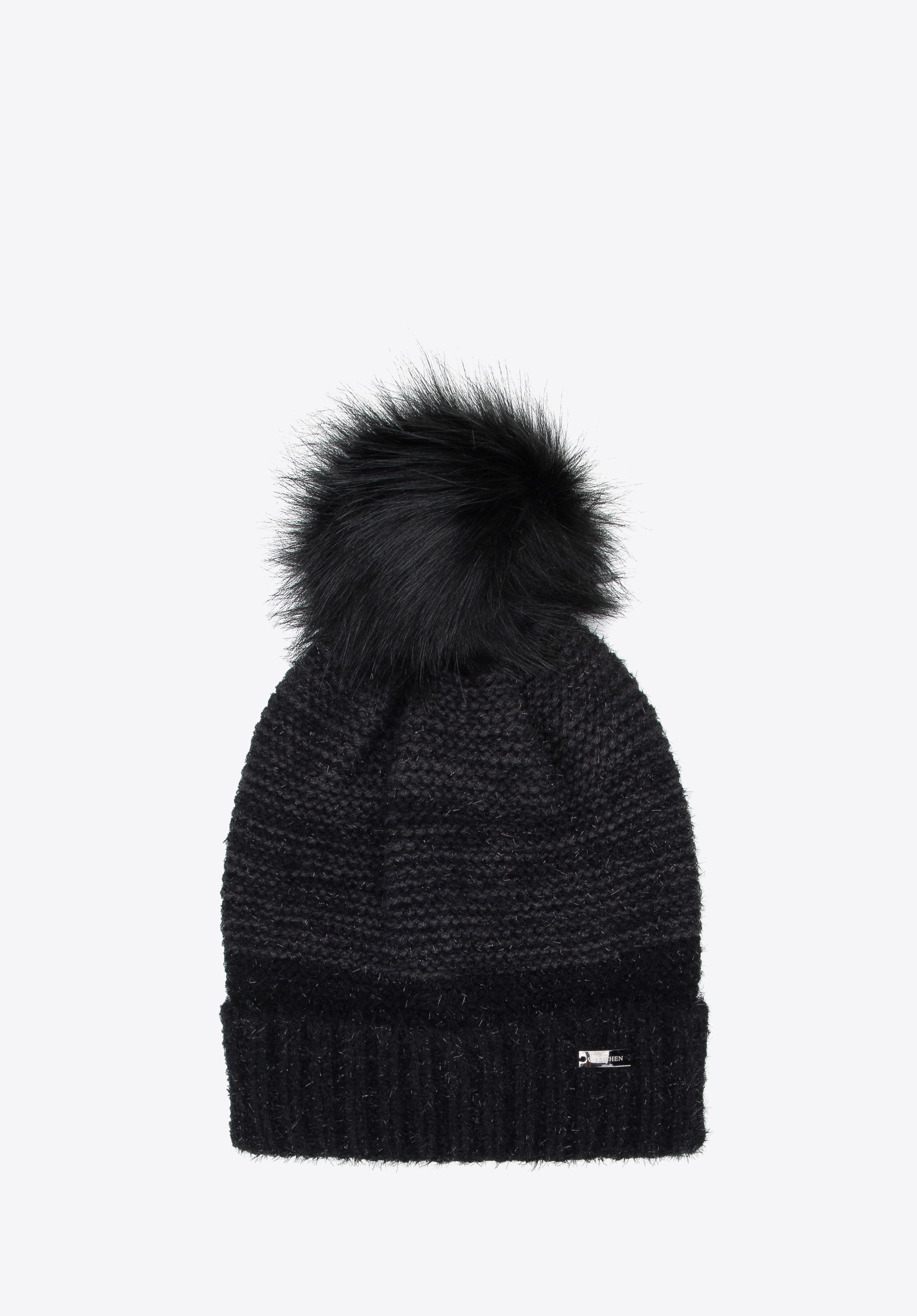 Czapka wykończona jest wywiniętym ściągaczem oraz pomponem ze sztucznego futerka. Wysoki i dość wąski komin ładnie układa się przy szyi, a od wewnątrz podszyty jest miękkim polarem. Damski komplet zimowy z błyszczącą nitką ozdobi gładki zimowy płaszcz i doda szyku pikowanej, krótkiej kurtce.