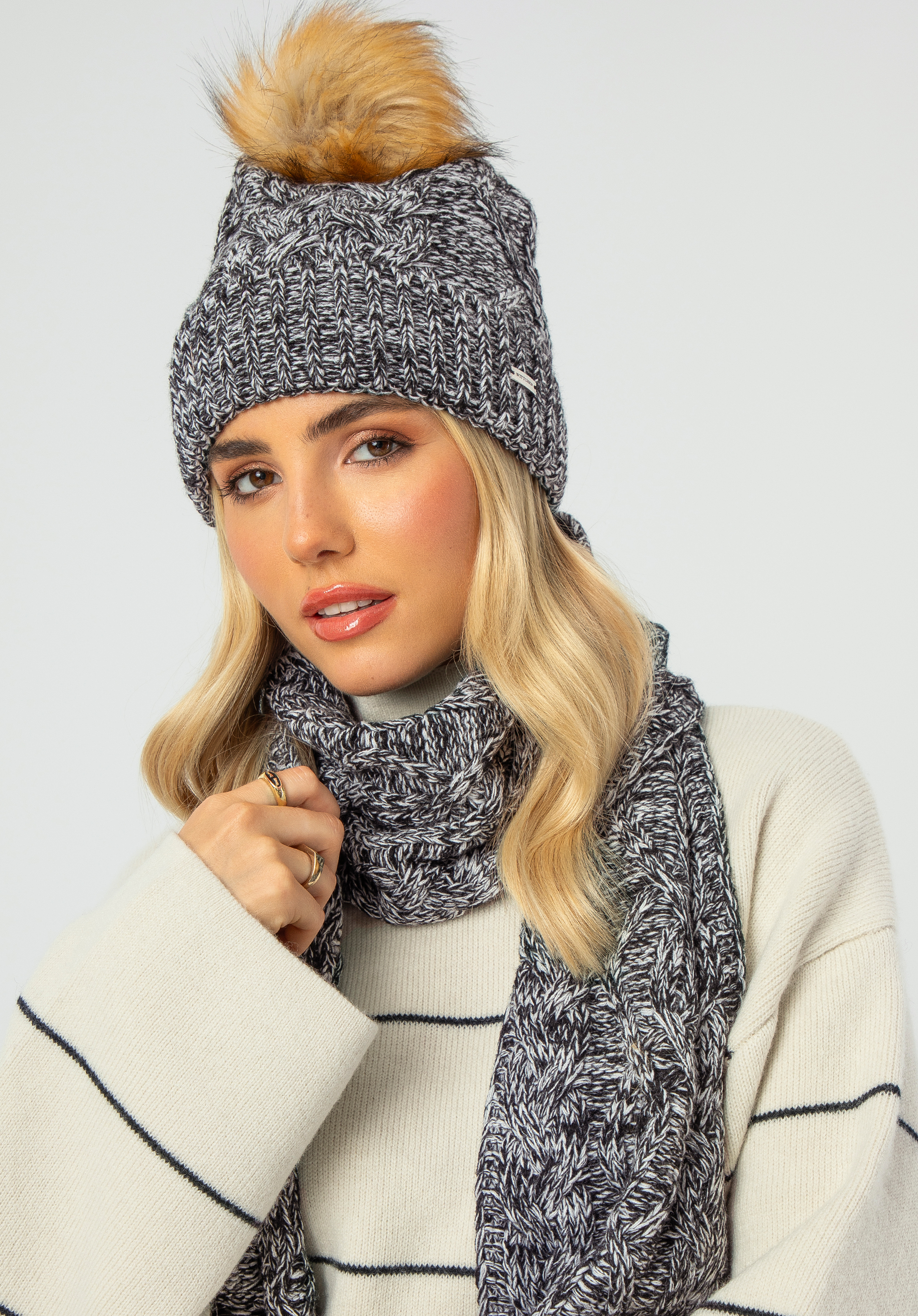 Odkryj wyjątkowy damski komplet zimowy – czapka i szalik w klasycznym warkoczowym splocie, który otuli Cię ciepłem i stylem tej zimy. Komplet wykonany jest z miękkiego akrylu, co zapewnia nie tylko przyjemność noszenia, ale także skuteczną ochronę przed zimnem. Dwukolorowe wykończenie dodaje elegancji, a kontrastowy pompon na czapce to subtelny, ale efektowny akcent, który przyciąga wzrok.