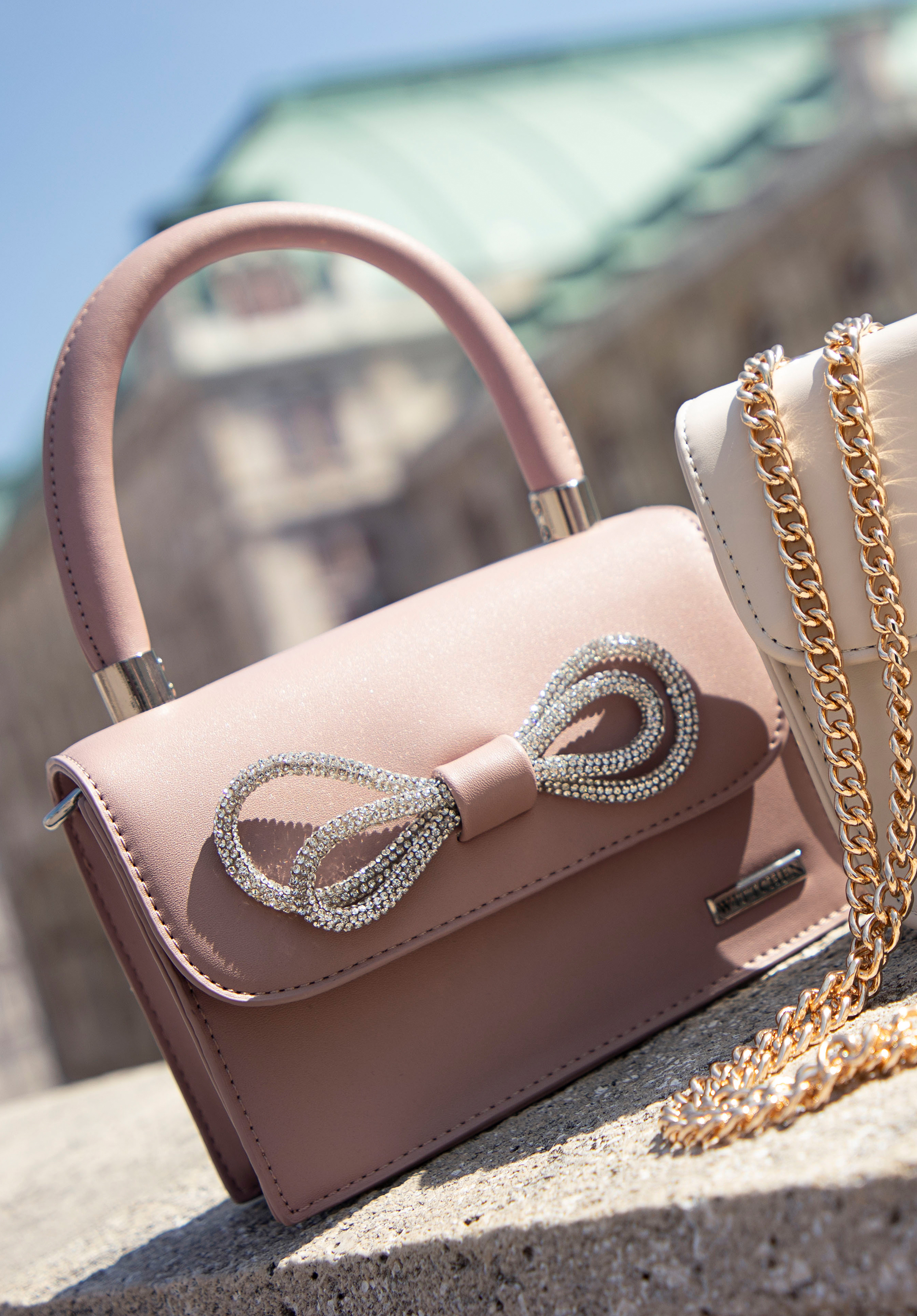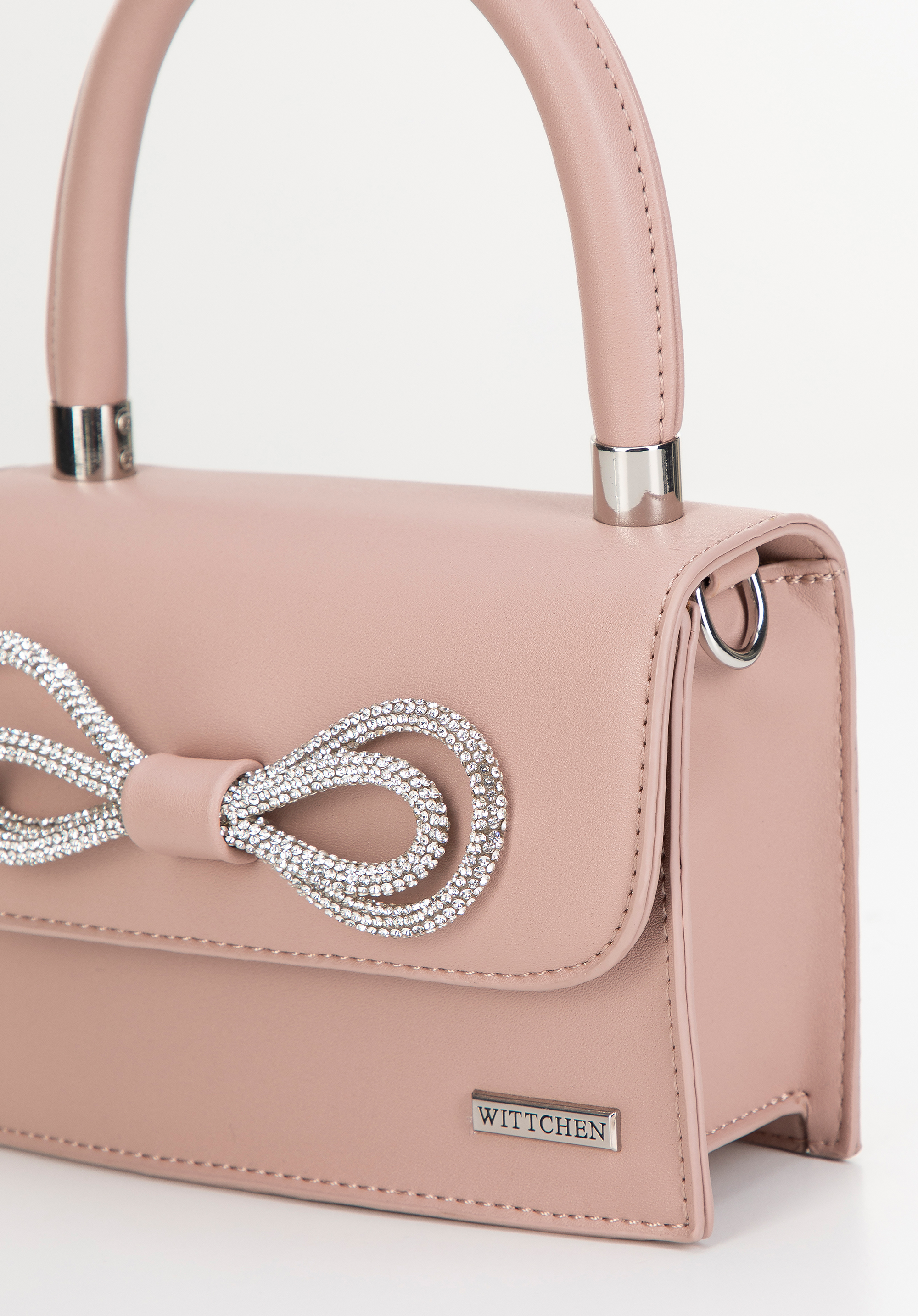 - Ozdoby: Klapa torebki ozdobiona jest błyszczącą wstążką, która dodaje jej odrobiny luksusu i subtelnej elegancji.