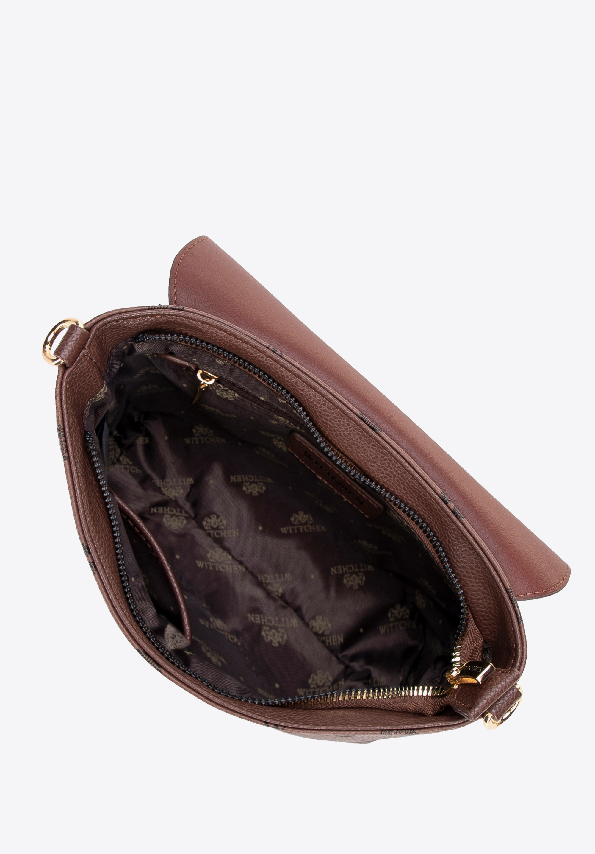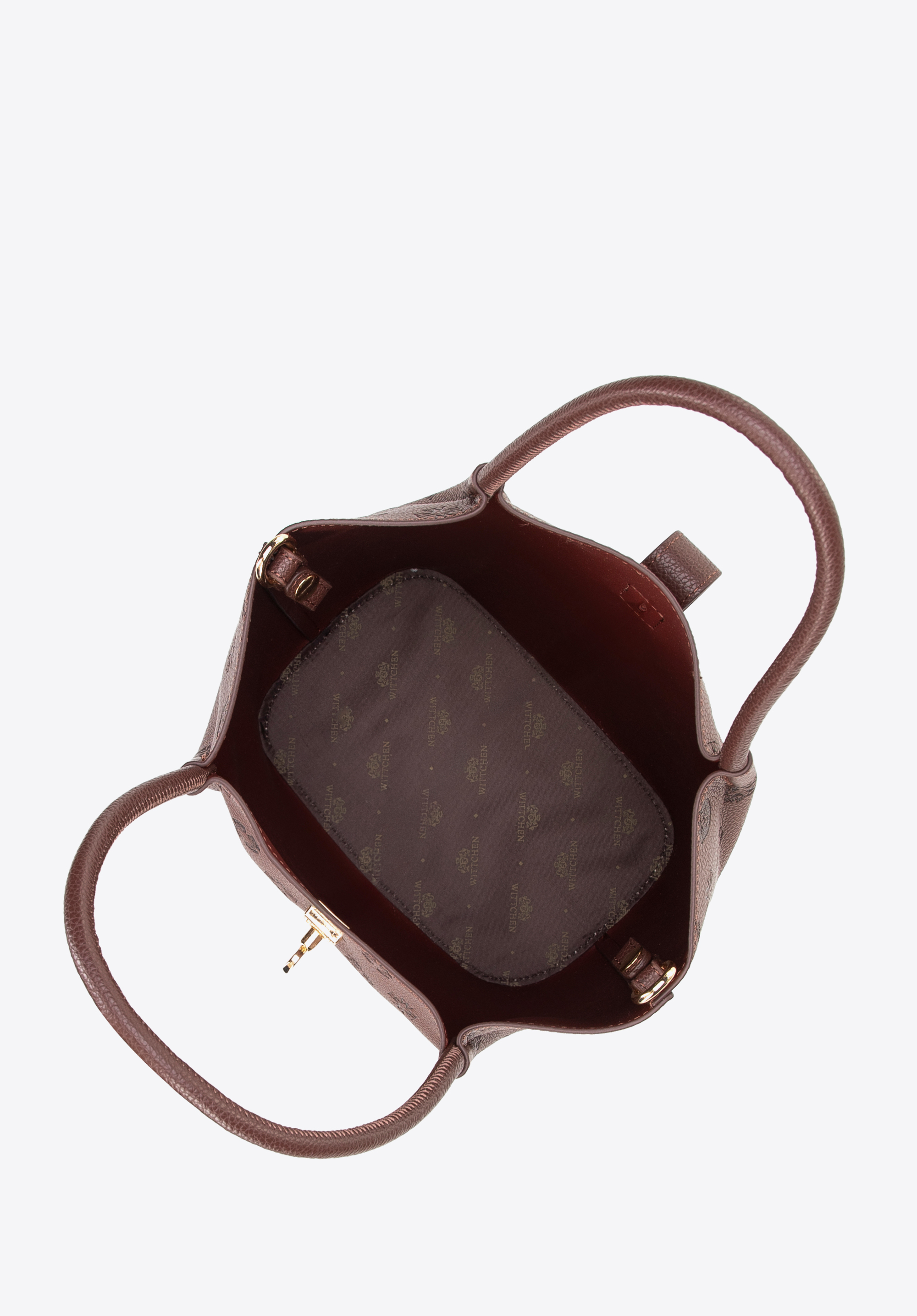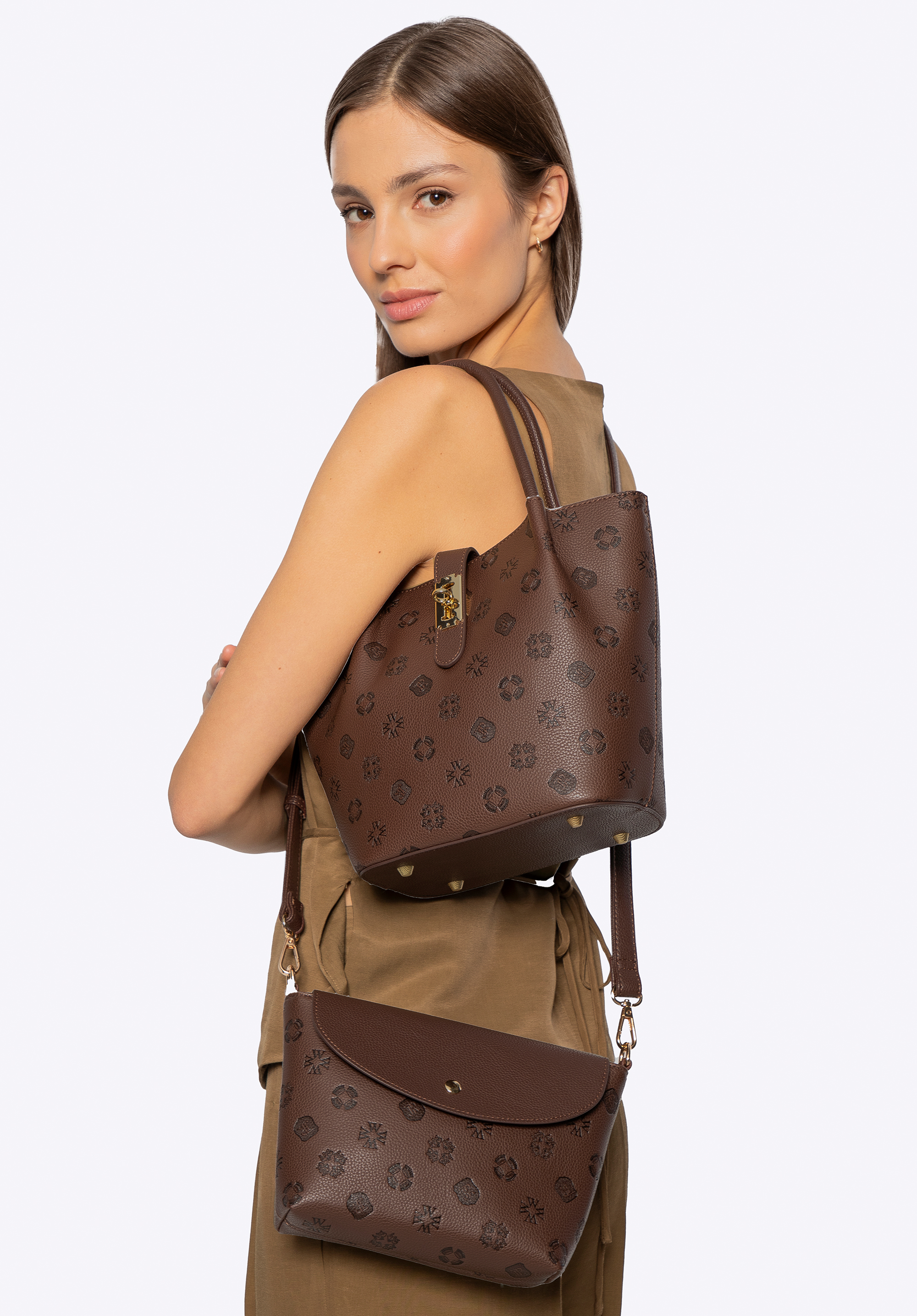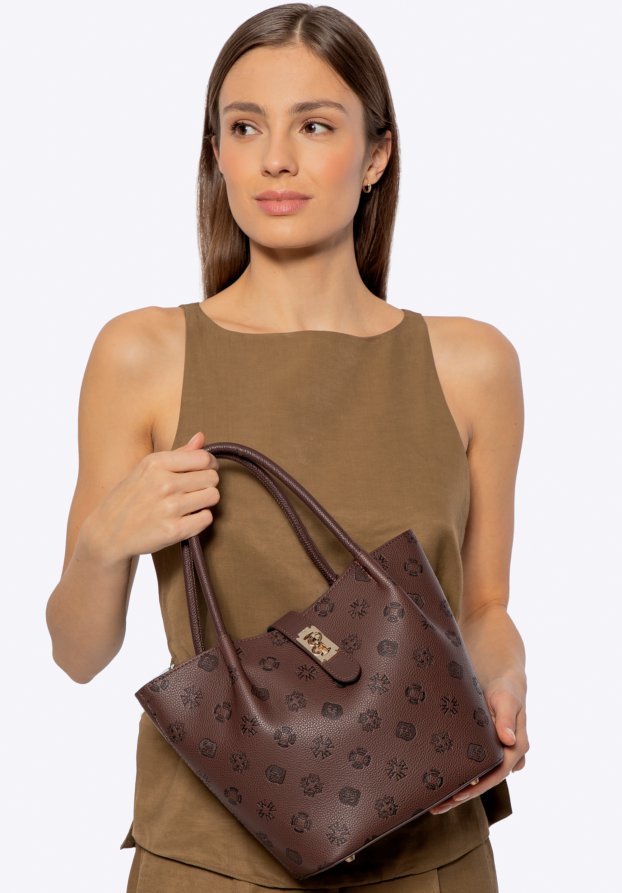 Damski kuferek z ekoskóry z tłoczoną sygnaturą ciemny brąz
