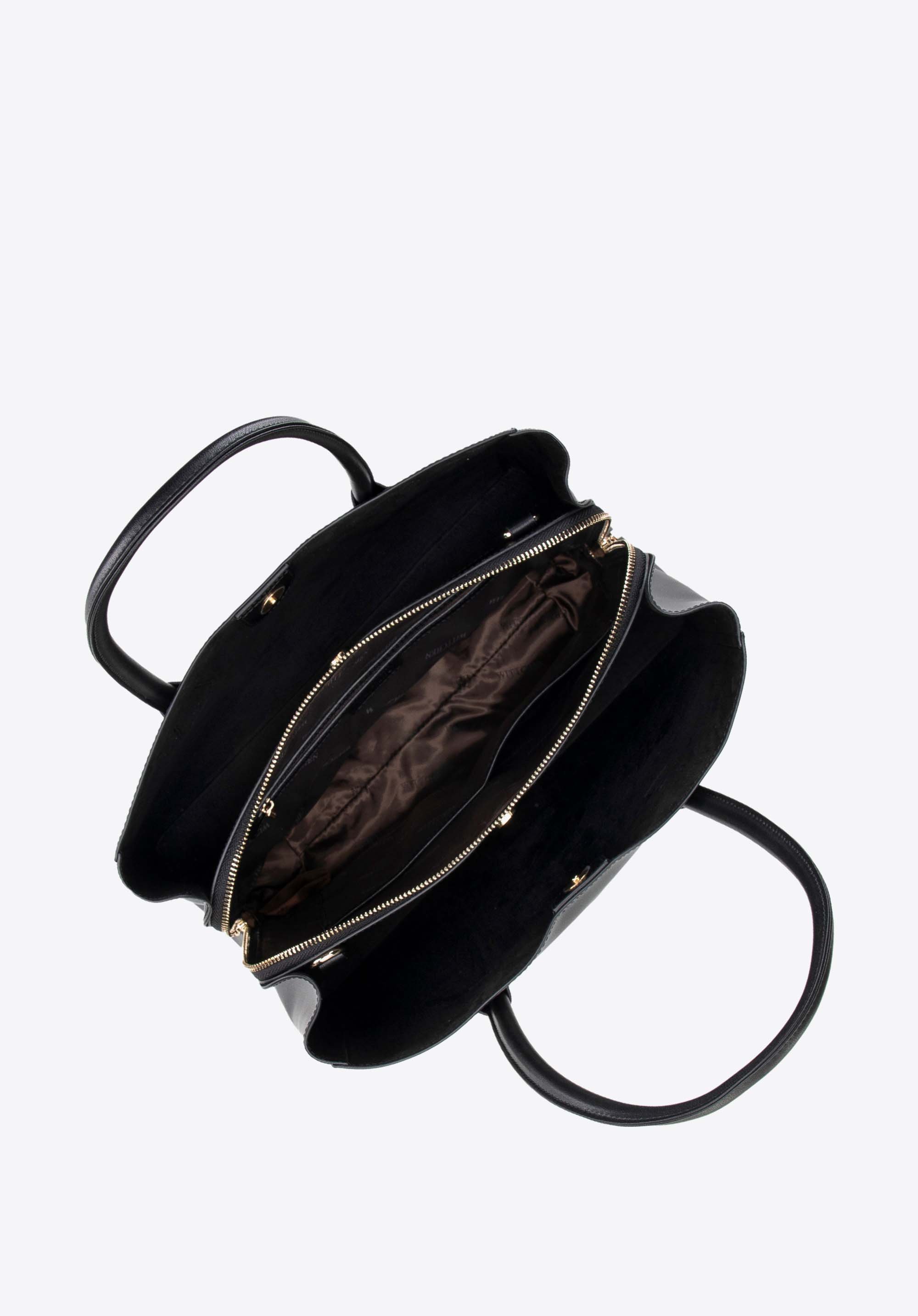 - Praktyczne wnętrze: Główna komora torby posiada trzy kieszenie, w tym jedną zamykaną na zamek, co dodatkowo ułatwia przechowywanie i segregowanie przedmiotów.