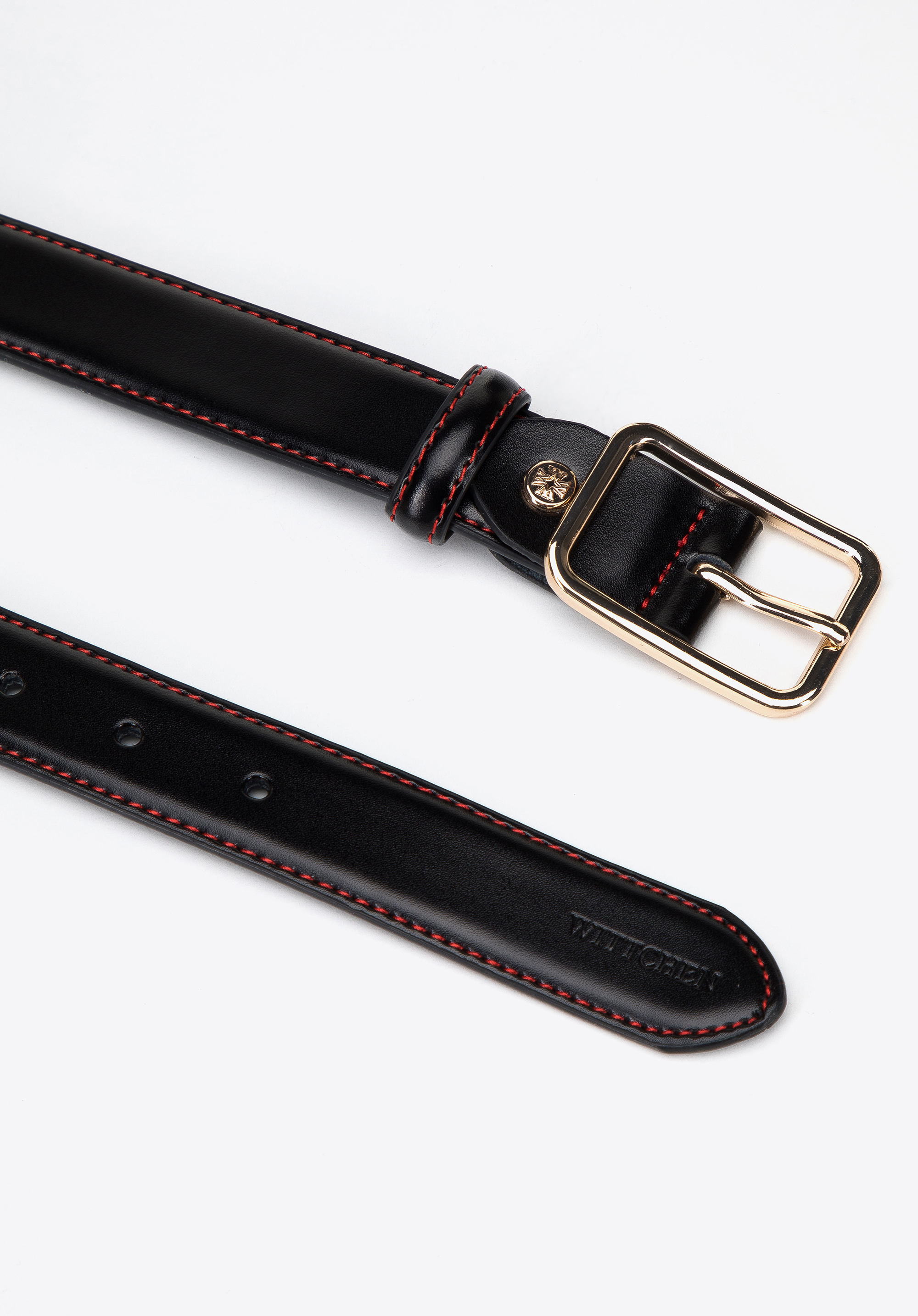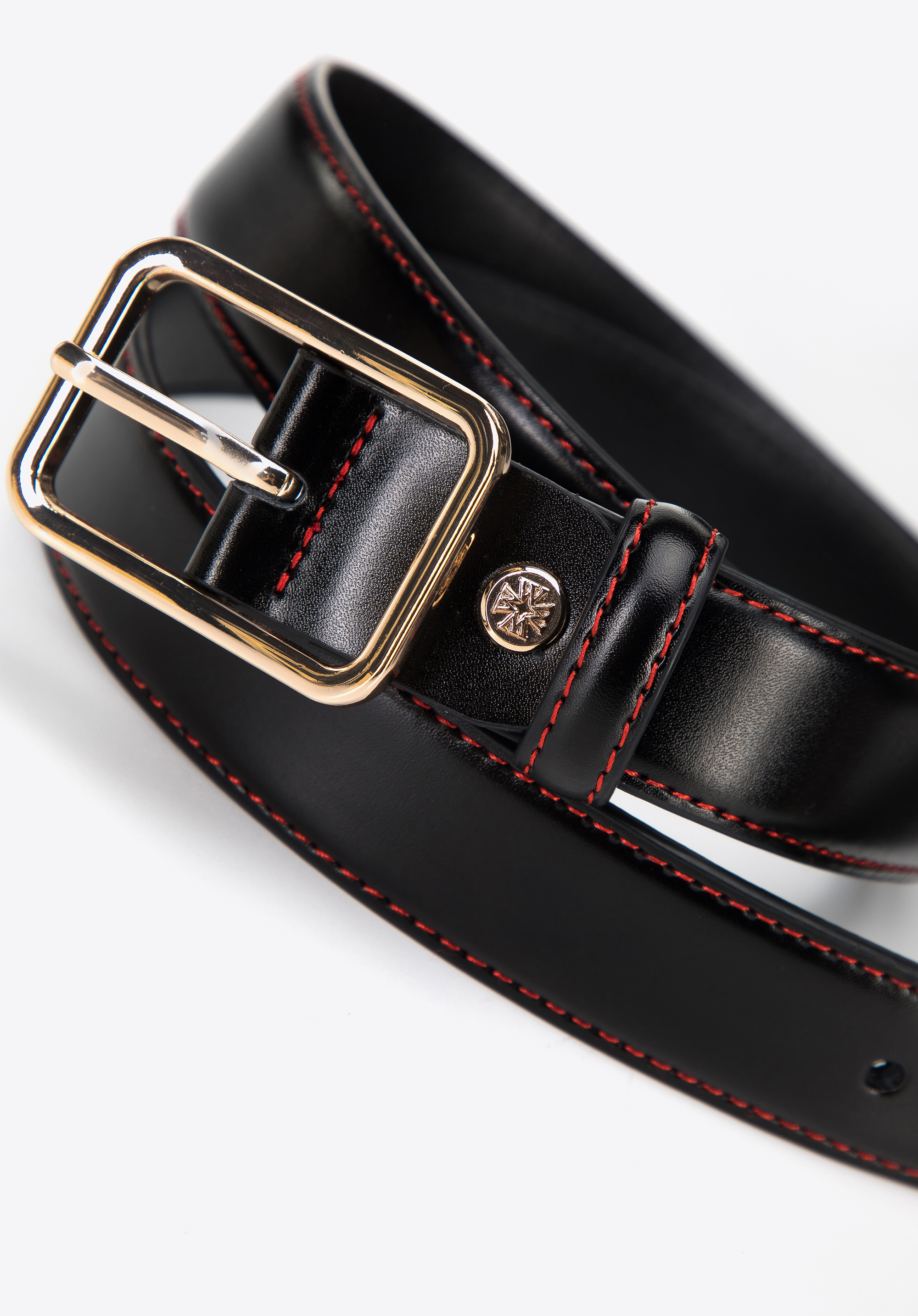 Gładka, błyszcząca klamra o prostokątnym kształcie ma lekko zaokrąglone rogi. Damski pasek skórzany z czerwoną nitką to świetny wybór dla miłośniczek nieoczywistych dodatków.