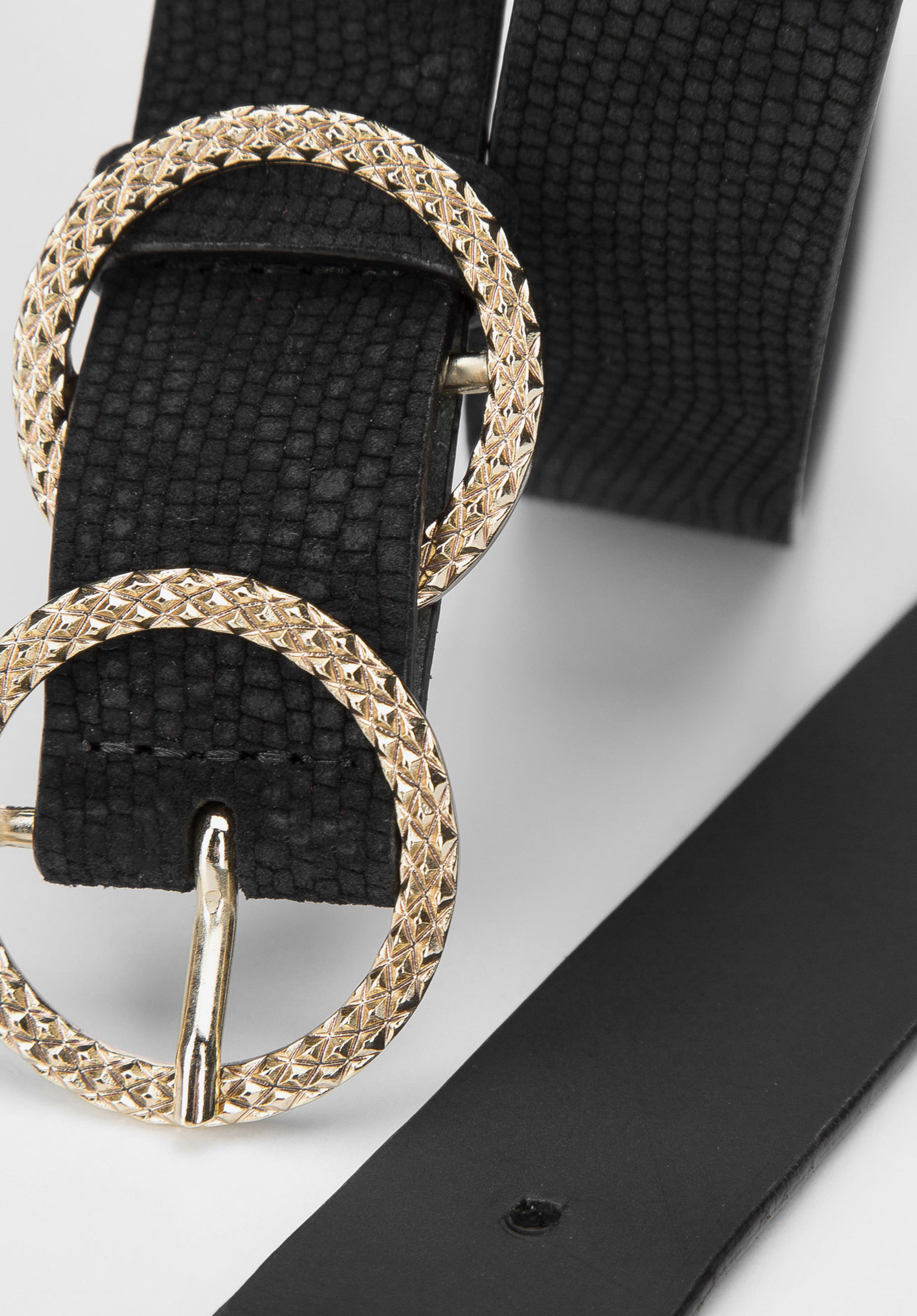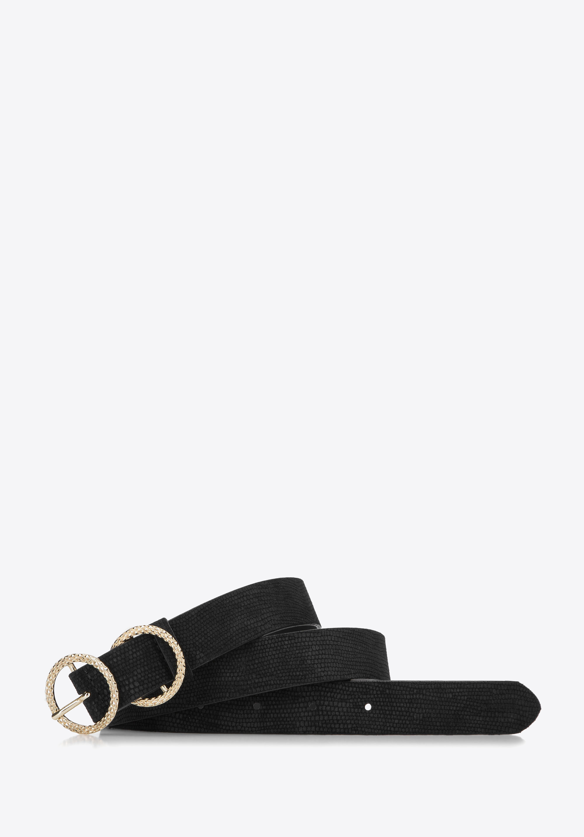 dwa złote kółka, z których jedno jest klamrą, a drugie szlufką. Kółka wykonane są ze złotego metalu z fakturą i stanowią niemal biżuteryjną ozdobę. Ten model urozmaici każdą stylizację: i taką z małą czarną sukienką, i ze swetrem oversize i dżinsami. Damski pasek zamszowy z kółkami to szykowny dodatek w iście włoskim stylu.