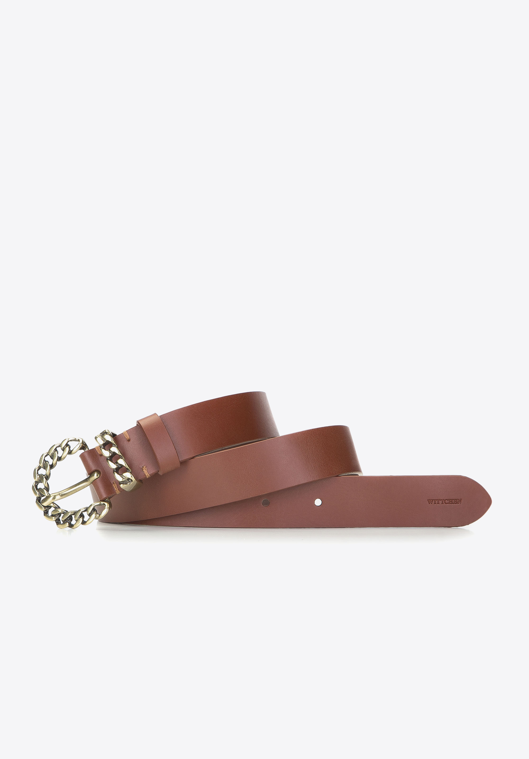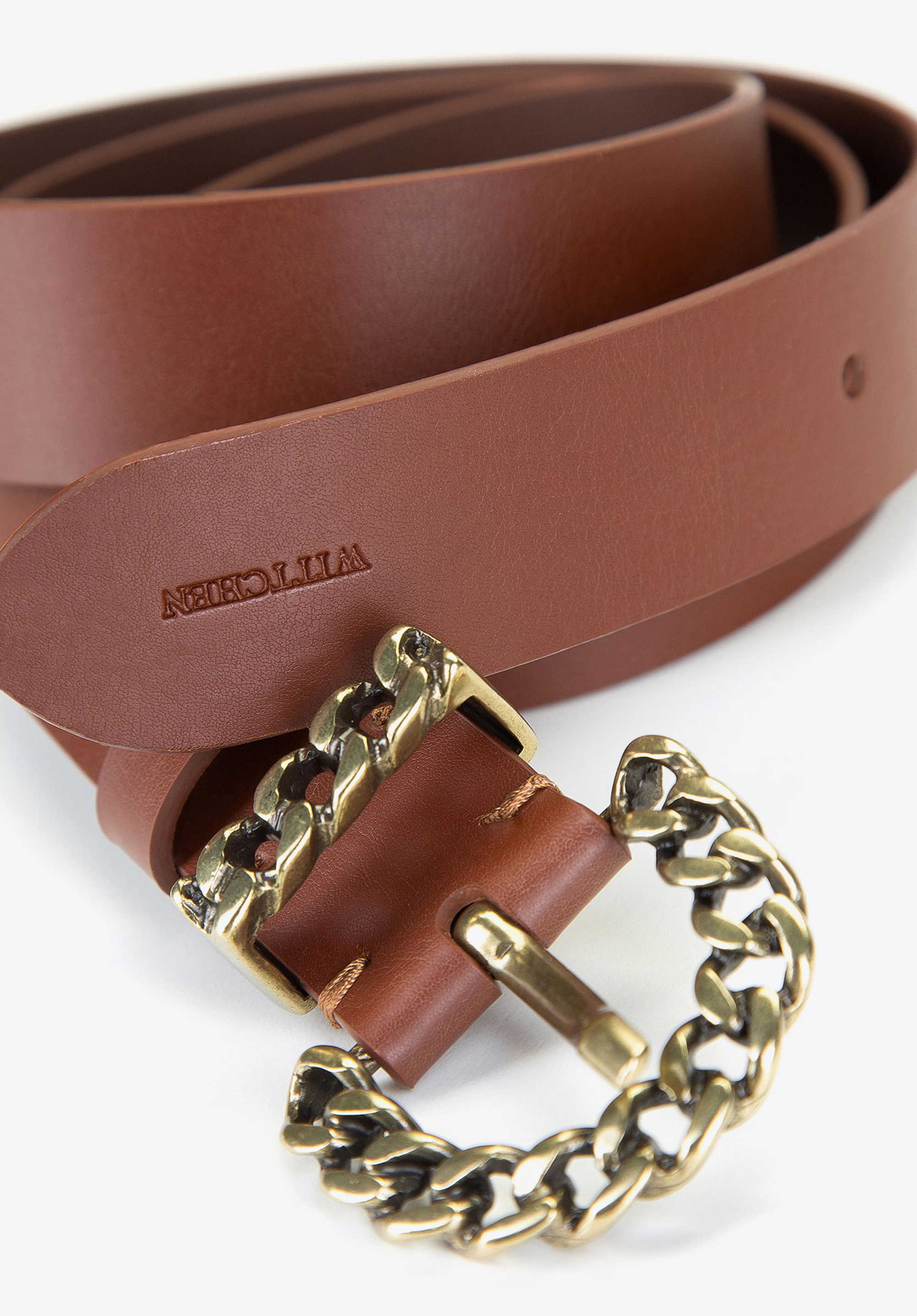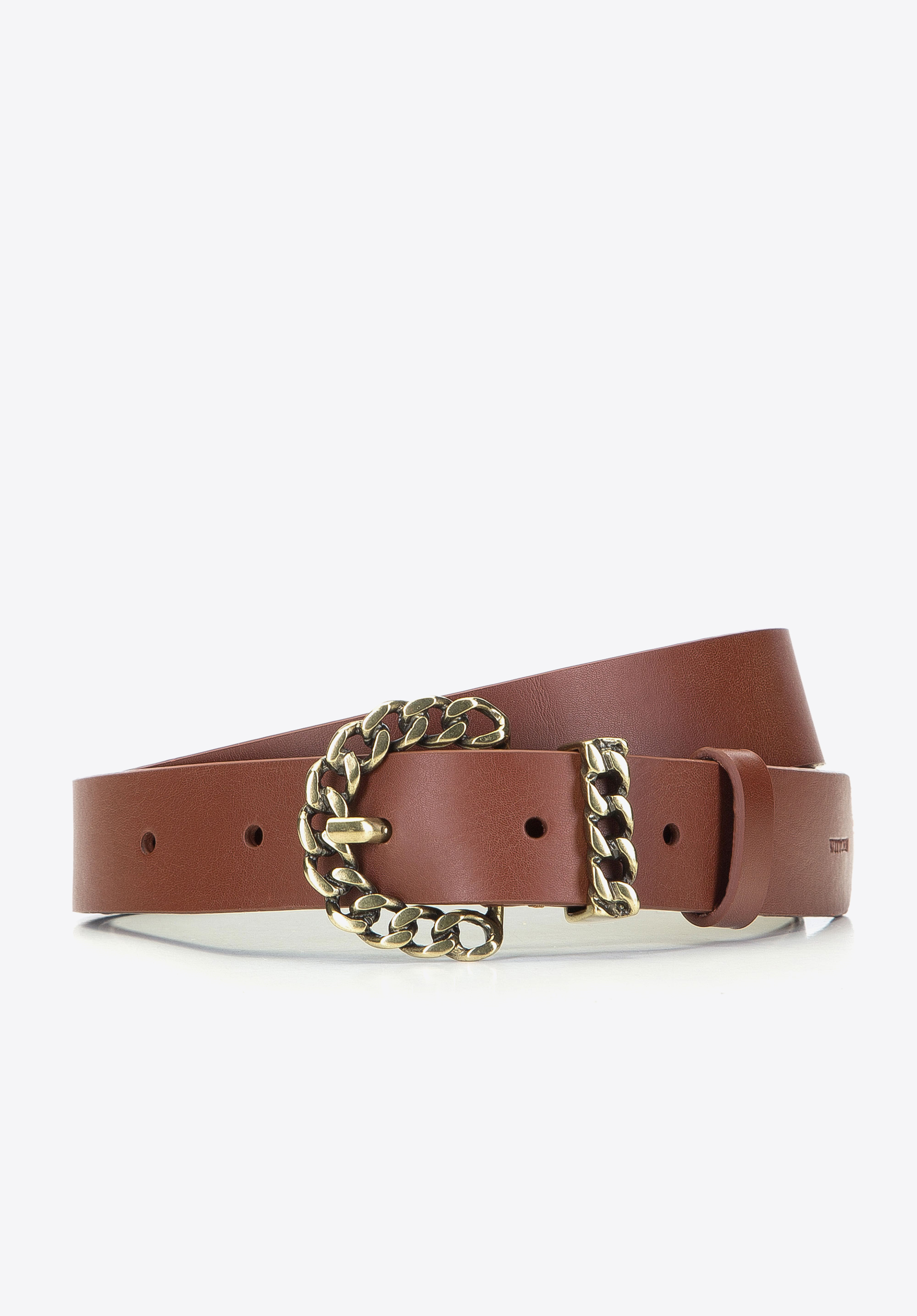 Wykonany jest z miękkiej skóry naturalnej i zakończony plecioną jak łańcuch, metalową klamrą. Klamra w kolorze mosiądzu lekko połyskuje i doda charakteru codziennej stylizacji. Dzięki mocno zaakcentowanej klamrze będziesz mogła używać paska jako ozdoby i zestawić go z luźnymi gładkimi koszulami, jak również grubym, wełnianym swetrem. Damski pasek skórzany z metalową plecioną klamrą urozmaici Twoją garderobę i doda ubraniom nowego stylu.