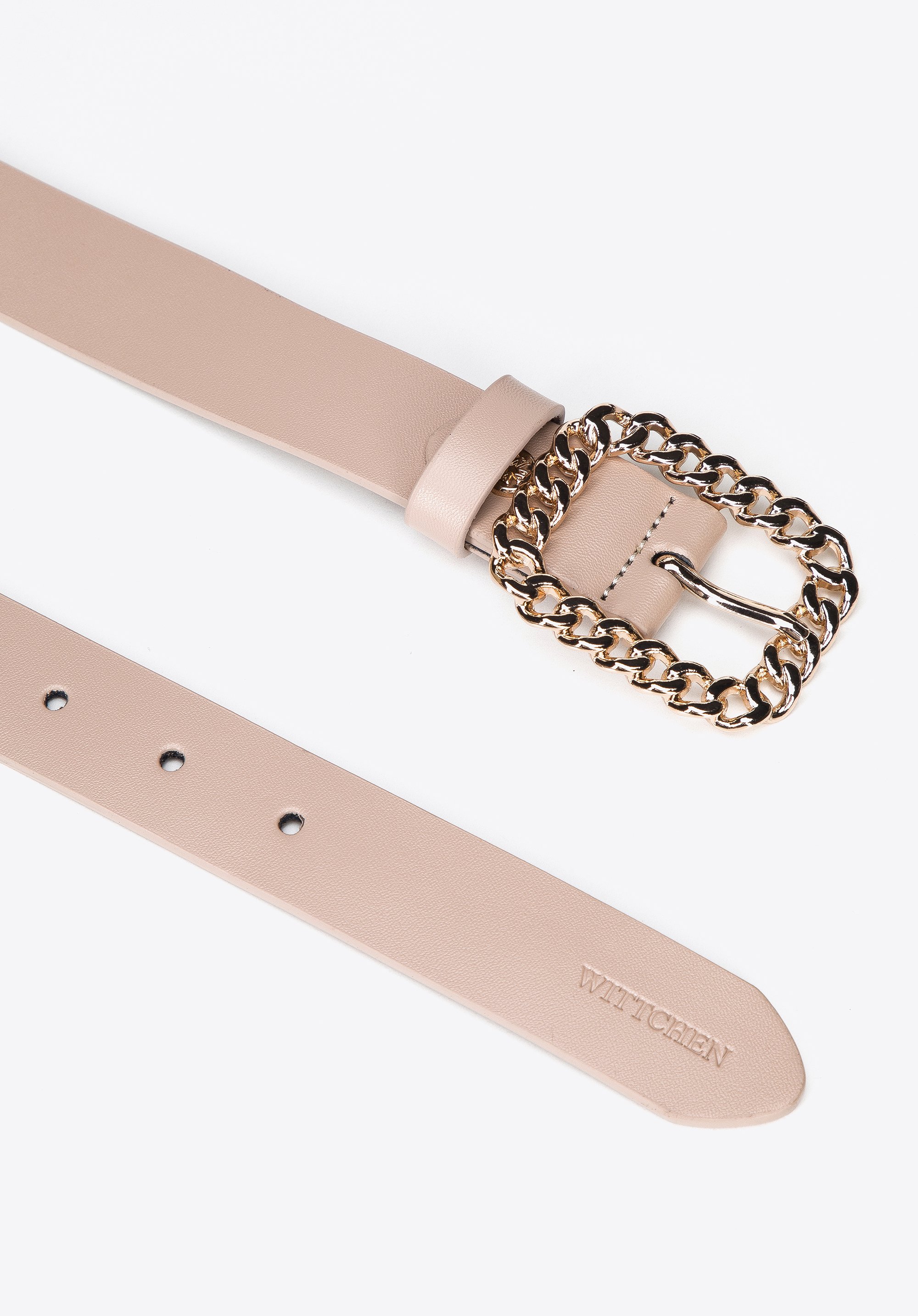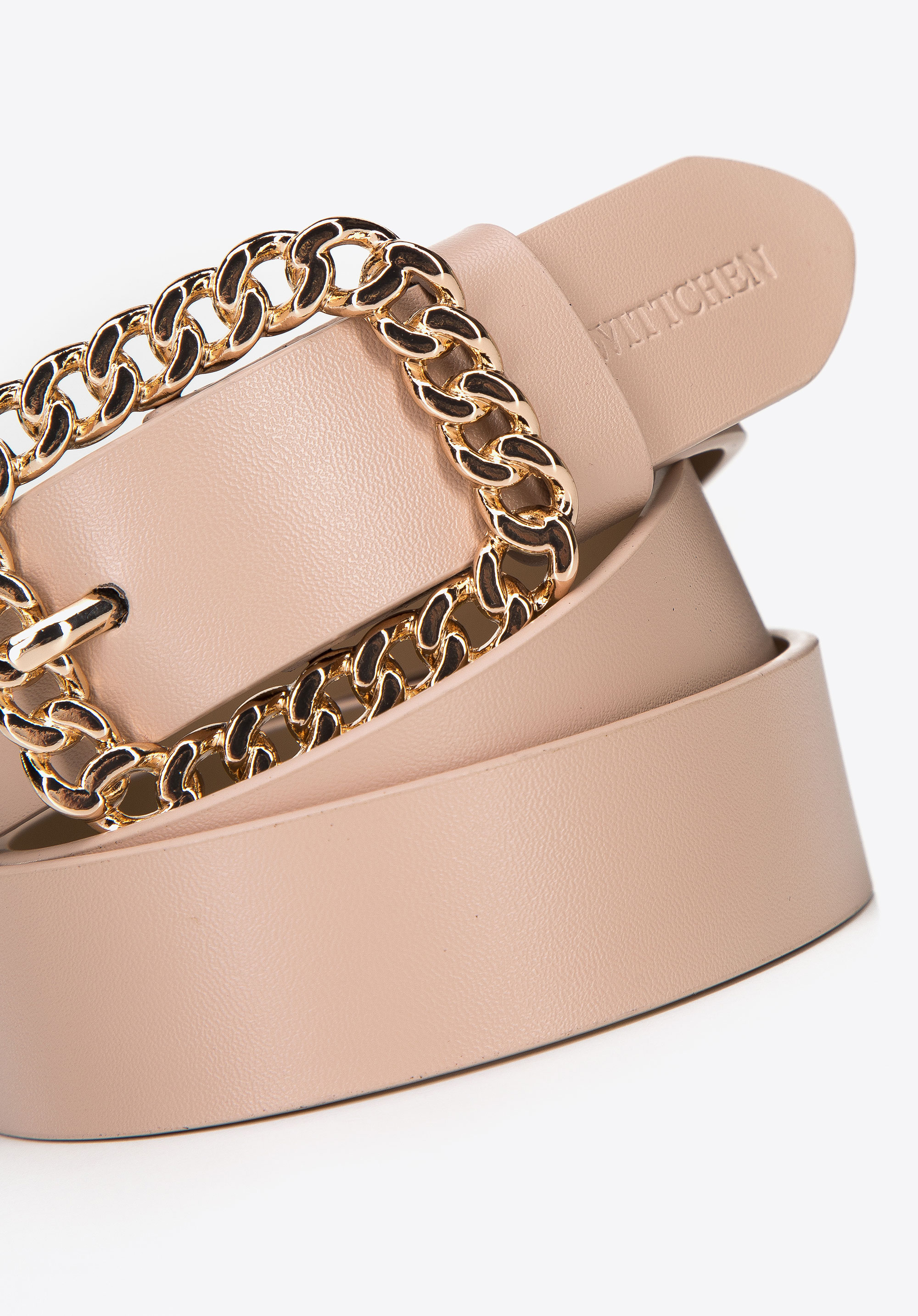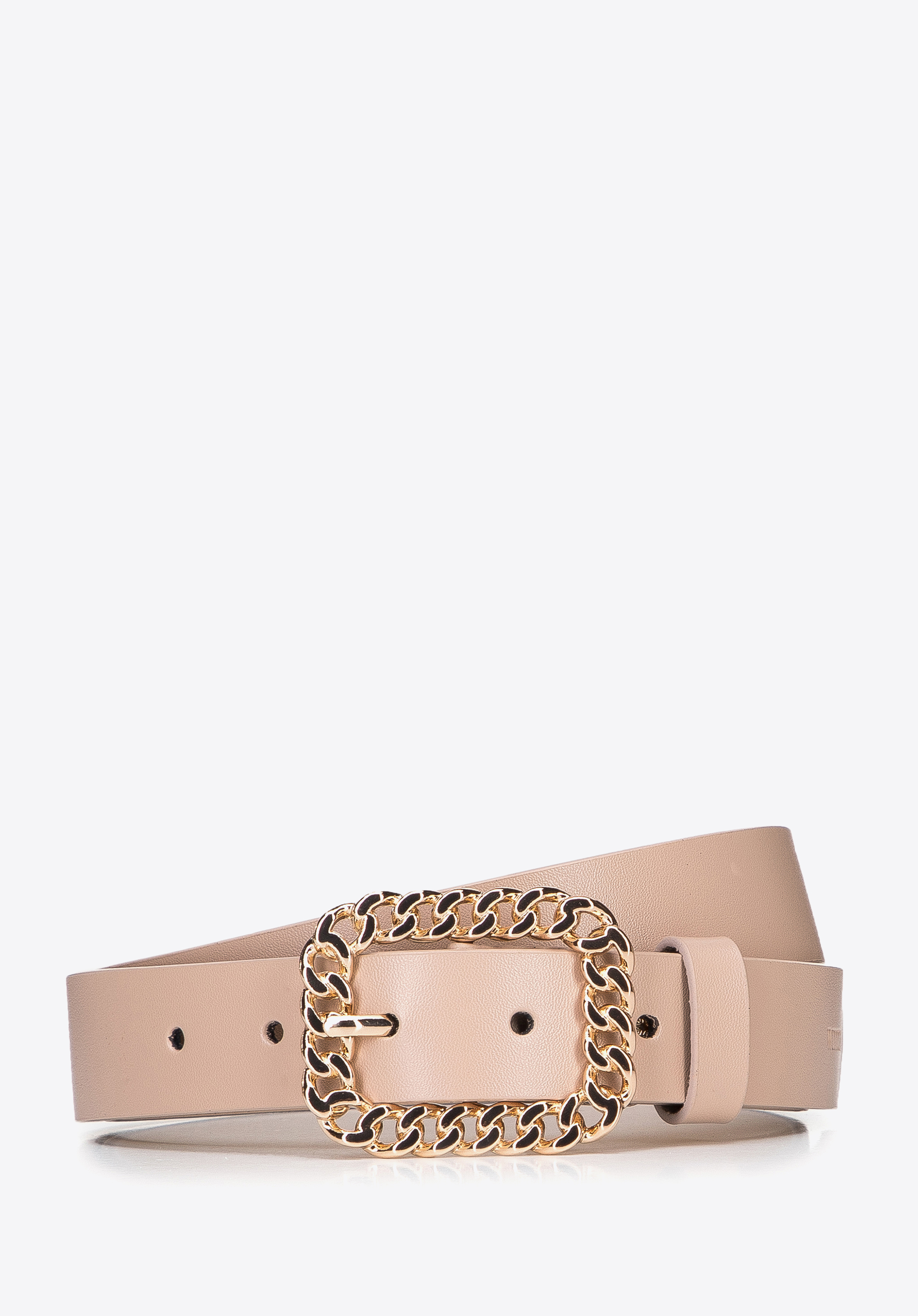 Damski pasek skórzany z ozdobną klamrą dopełni stylizacje, w których chcesz podkreślić talię i dodać całości wyrafinowanego blasku. Naturalna skóra stanowi eleganckie tło dla klamry w formie łańcuszka, a możliwość skrócenia ułatwia idealne dopasowanie.