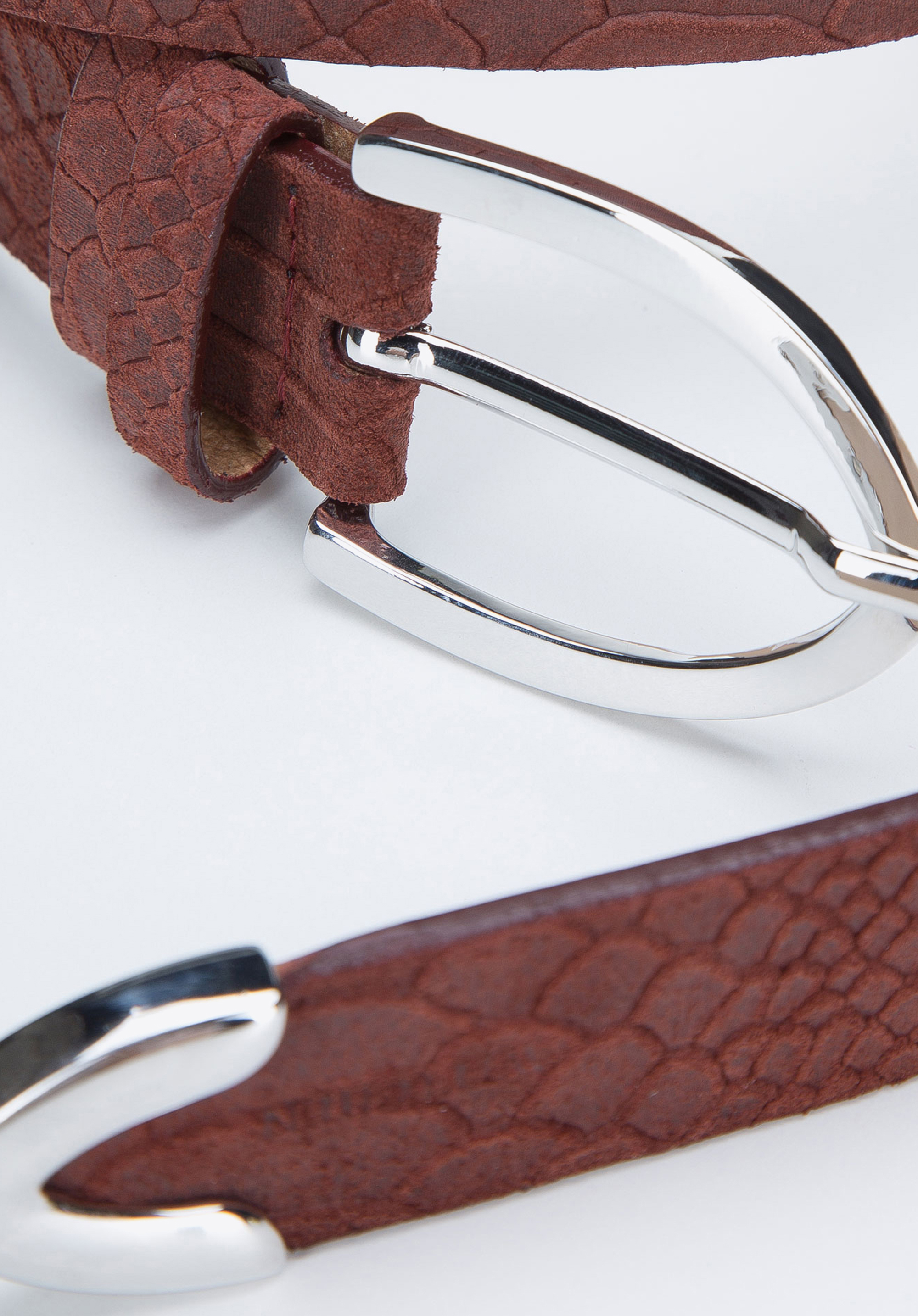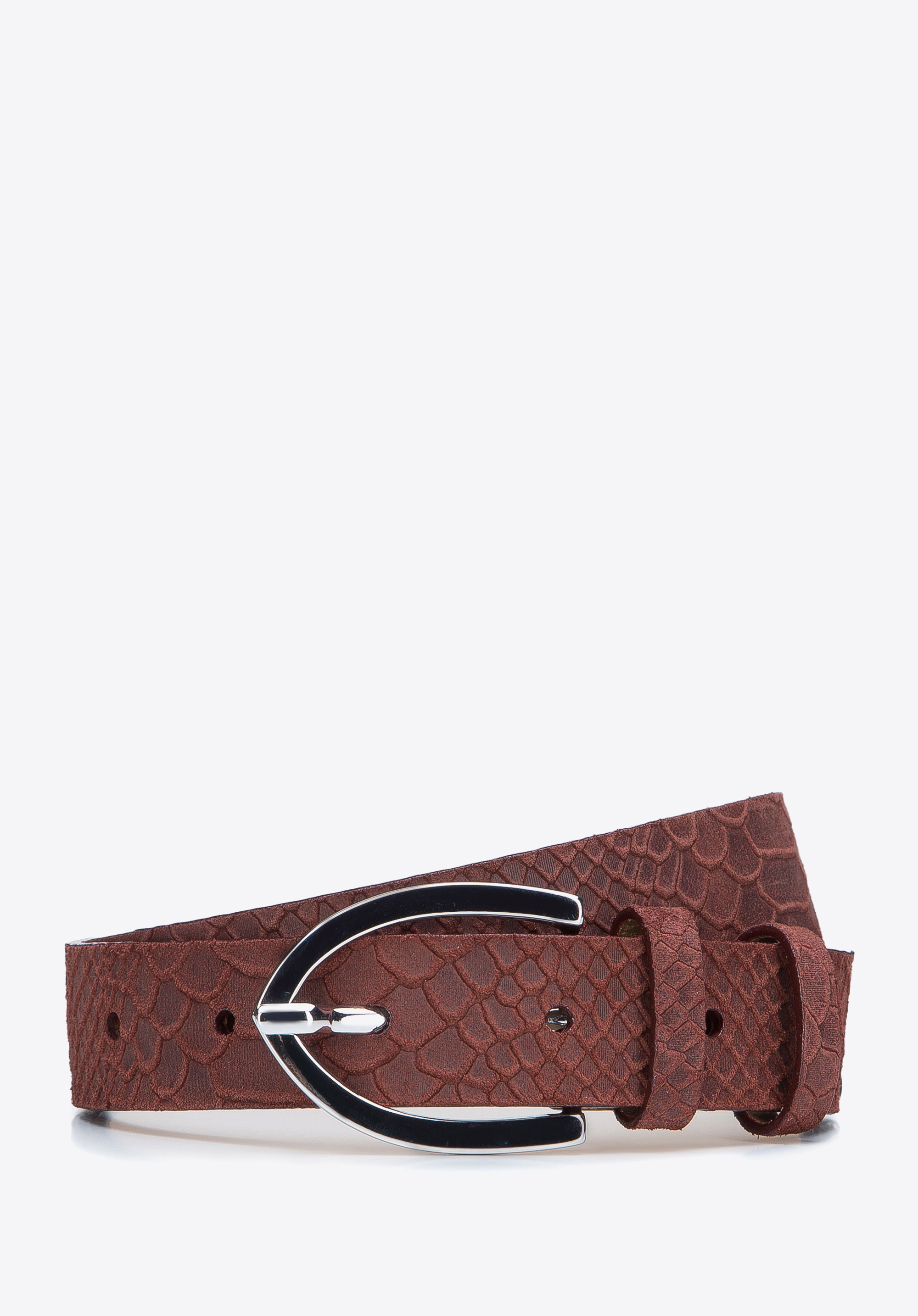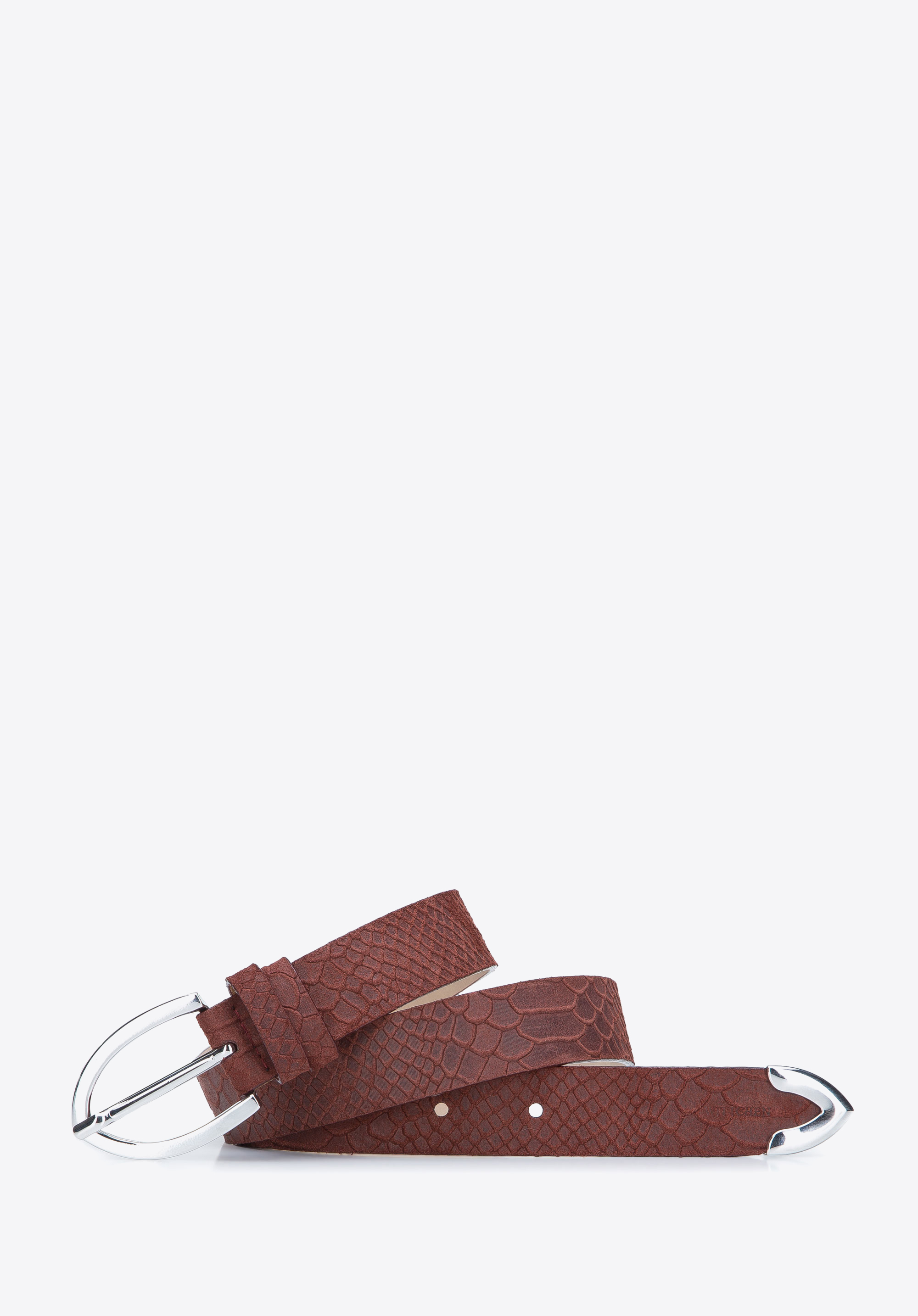 dość cienki, więc możesz go nosić do spodni lub spiąć nim oversizowy sweter. Damski pasek z zamszu tłoczonego w wężową fakturę to świetny pomysł na prezent dla każdej kobiety lubiącej ponadczasowe dodatki.