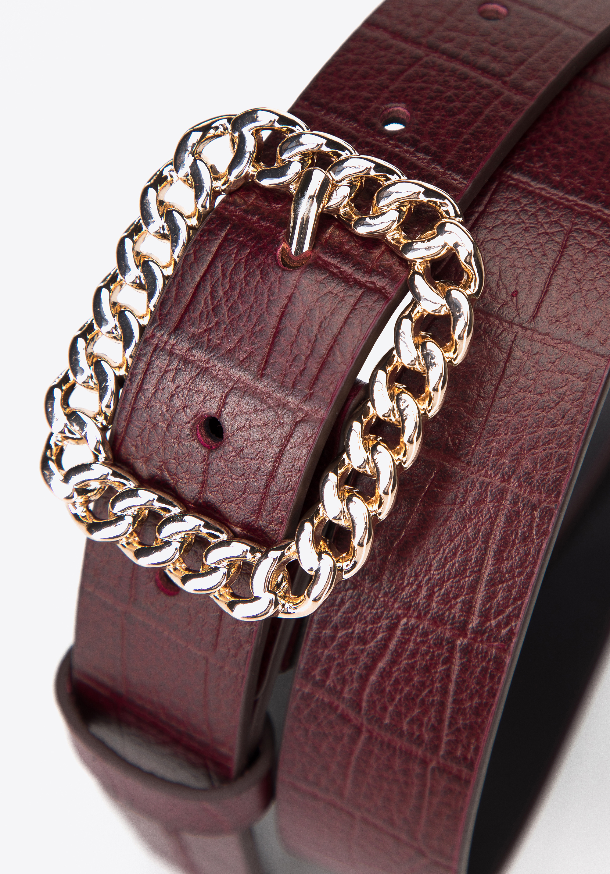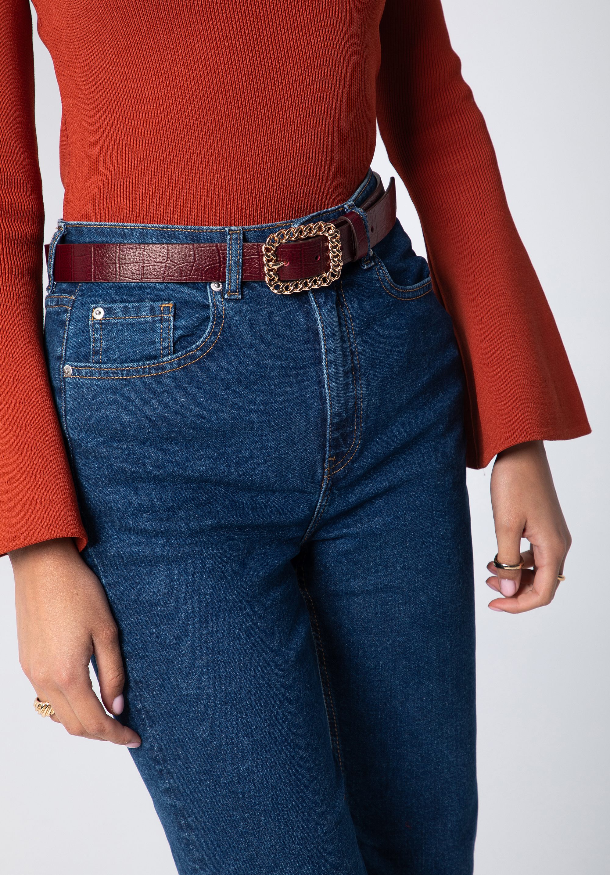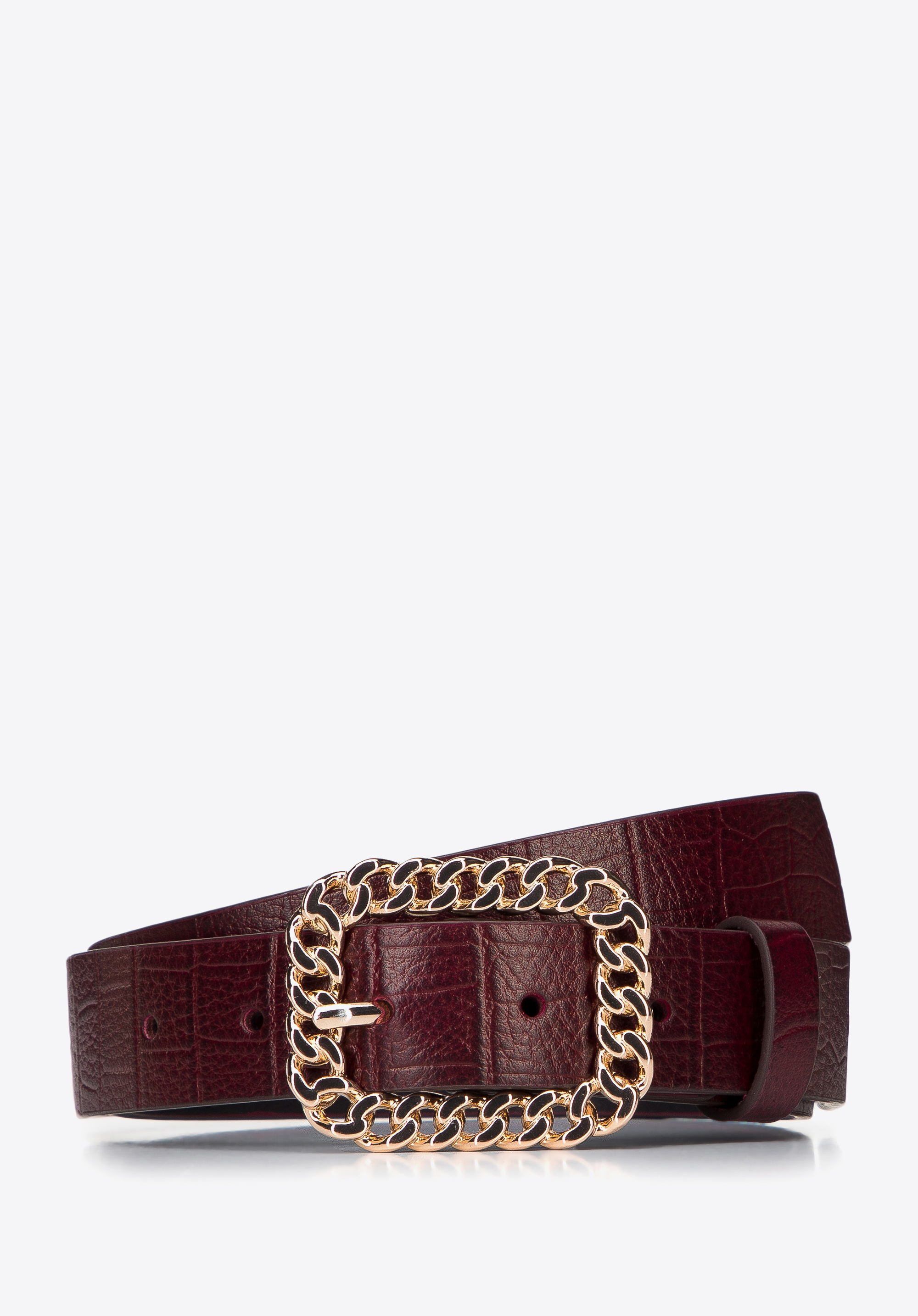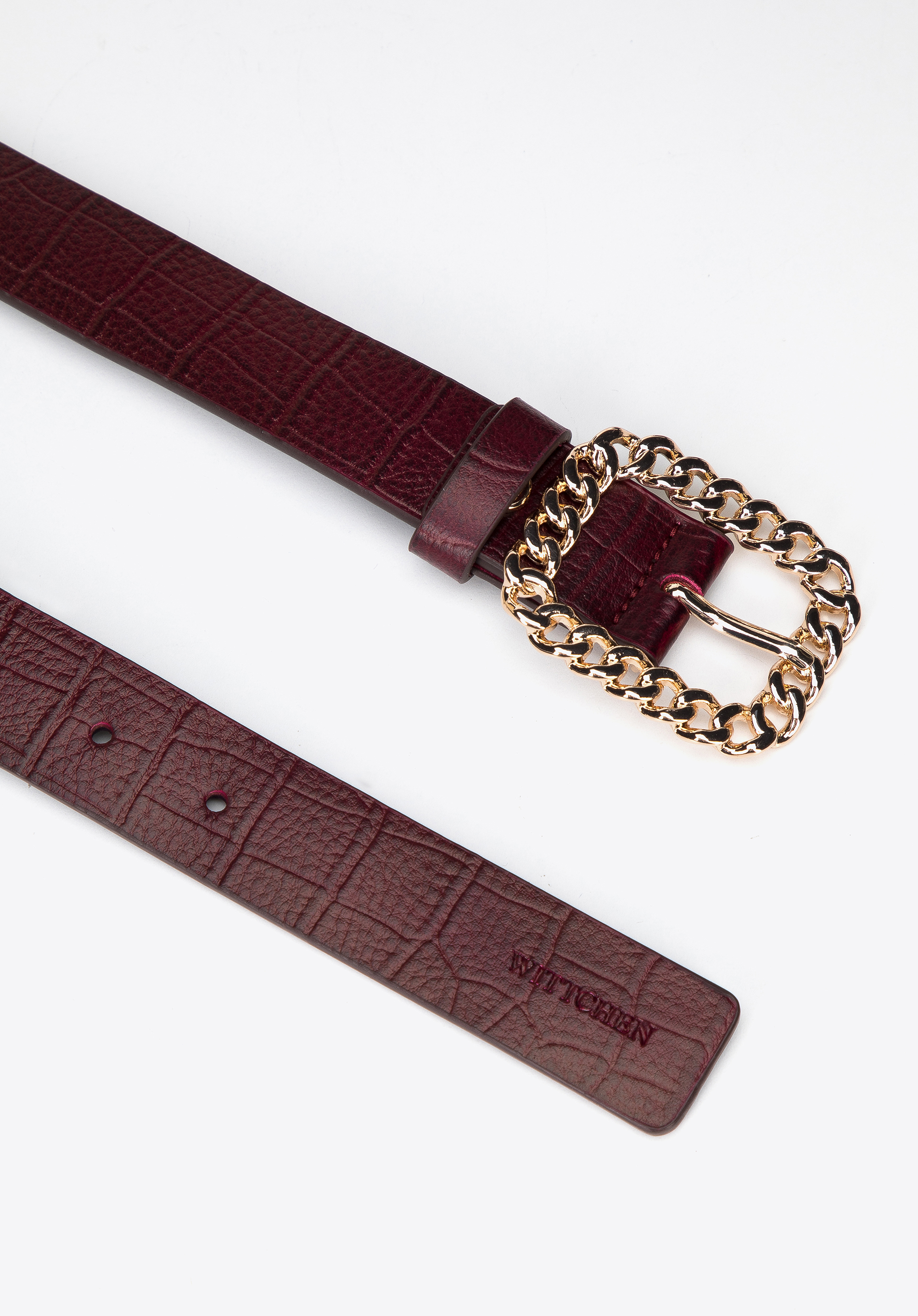 Paski damskie mogą mieć tradycyjną formę, a mogą również prezentować się bardziej spektakularnie. Do tych drugich należy damski pasek ze skóry croco z ozdobną klamrą. Ten model łączy w sobie najmodniejsze trendy sezonu: fakturę imitującą skórę krokodyla oraz błyszczącą, metalową klamrę w formie łańcuszka. Ma optymalną szerokość, dzięki czemu dopasujesz go do większości szlufek w spodniach i spódnicach. A to stwarza nieskończenie wiele możliwości stylizacji! Boho, retro czy w duchu glamour – damski pasek ze skóry croco z ozdobną klamrą będzie Ci towarzyszył w każdej sytuacji, szybko stając się jednym z ulubionych damskich.