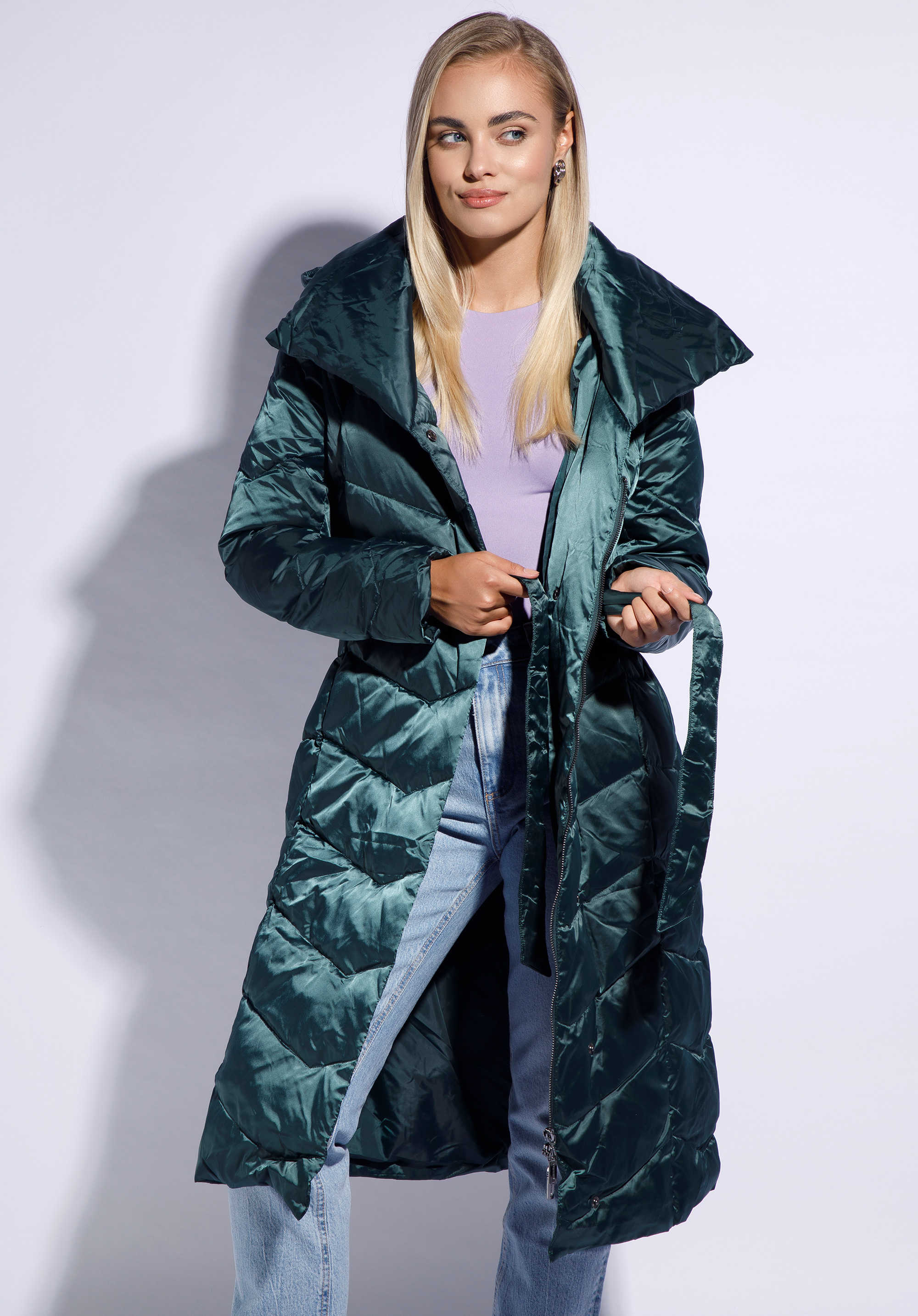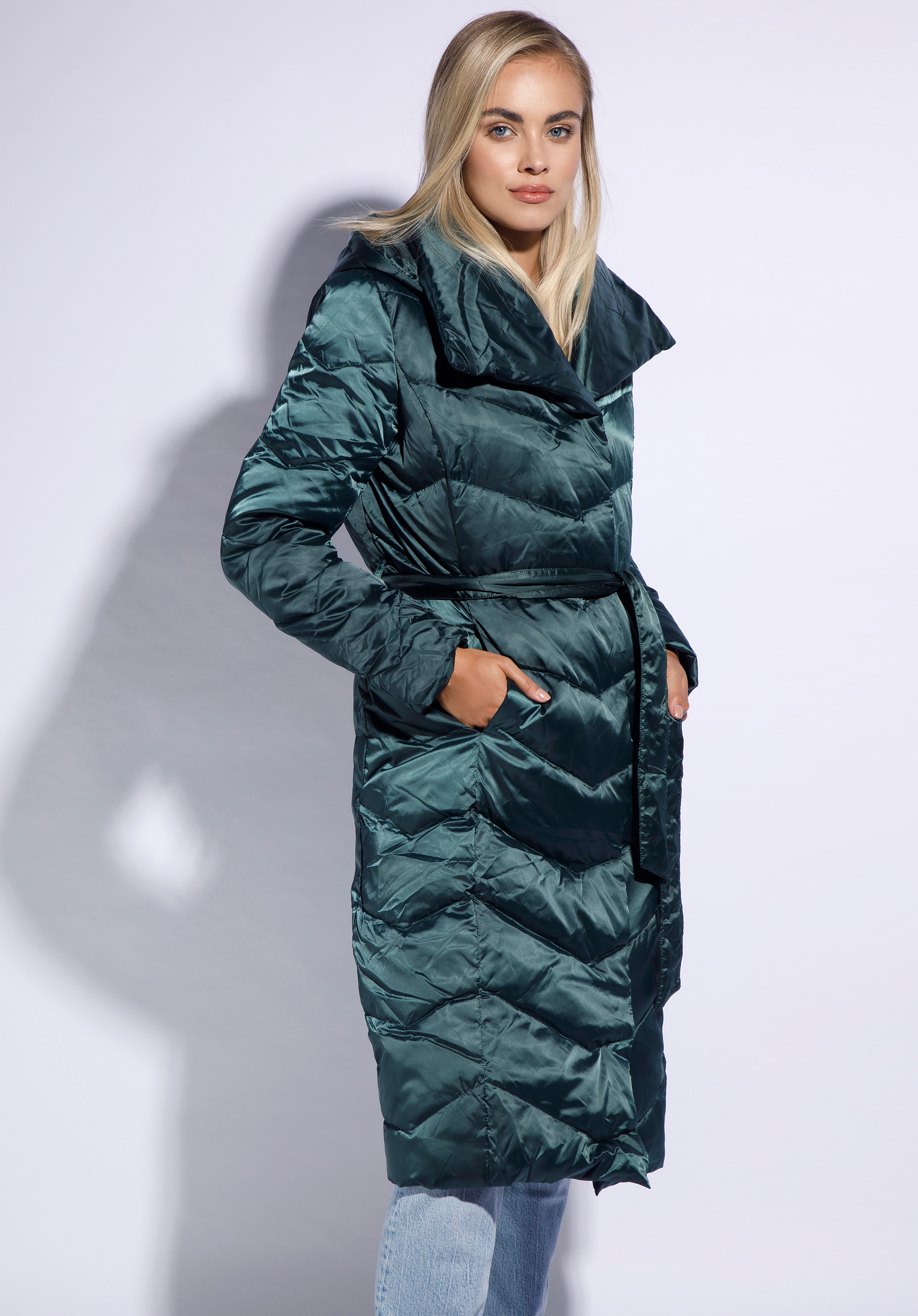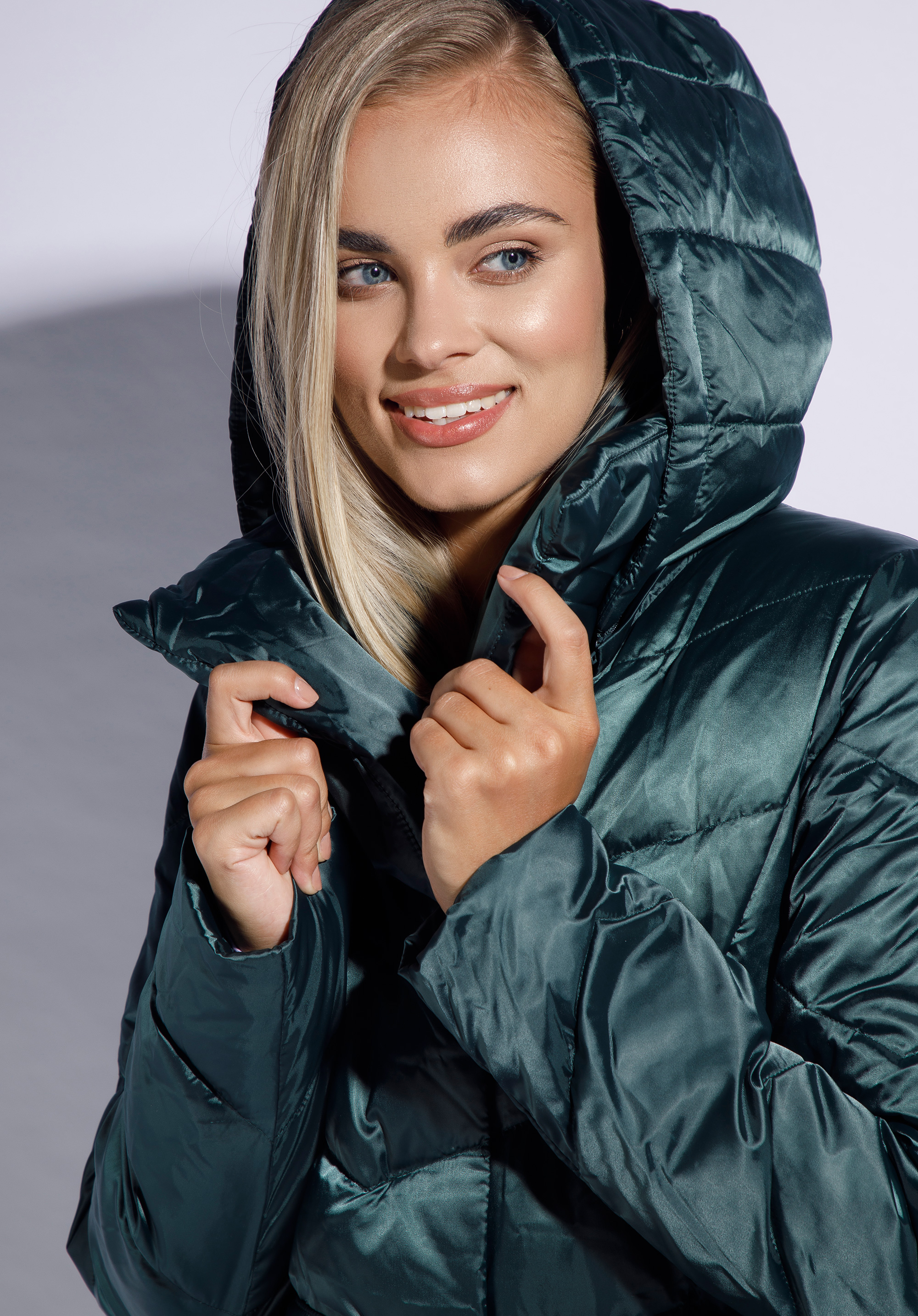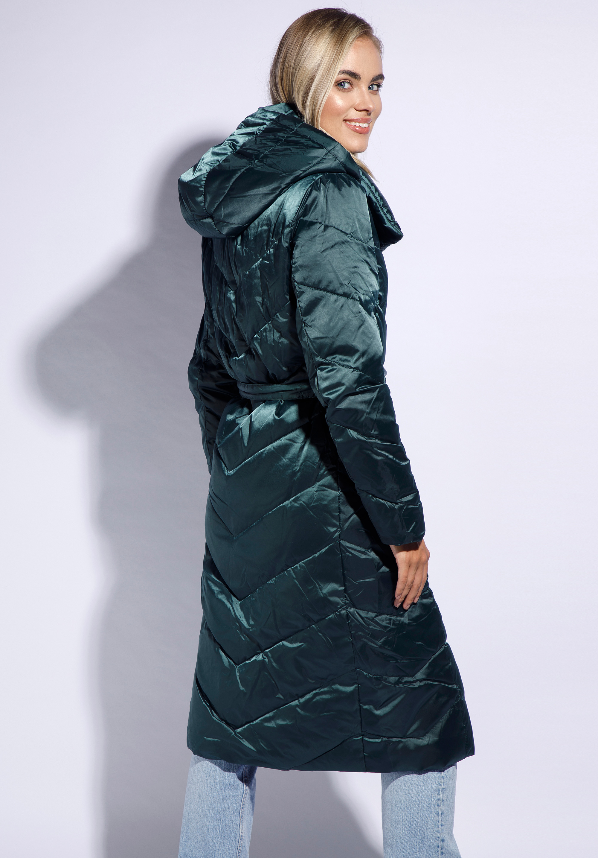 Płaszcz z lekkim, ale ciepłym wypełnieniem – 50% puchu, 50% pierza – izoluje od zimna, jednocześnie nie pogrubiając sylwetki. Wysoki kołnierz wygląda bardzo stylowo i chroni przed podmuchami wiatru. Dodatkowo płaszcz ma kształtny kaptur, który możesz odpiąć. Śliska podszewka sprawia, że ubranie, które masz pod płaszczem, nie fałduje się. Płaszcz ma lekki połysk i zygzakowate przeszycia, które przykuwają wzrok i optycznie wysmuklają. Damski płaszcz z kapturem przyjemnie otula sylwetkę bez dodawania objętości; z pewnością chętnie sięgniesz po niego w chłodniejsze jesienne oraz zimowe dni. Nasza rada: dla odmiany odepnij kaptur i otul się kołnierzem.