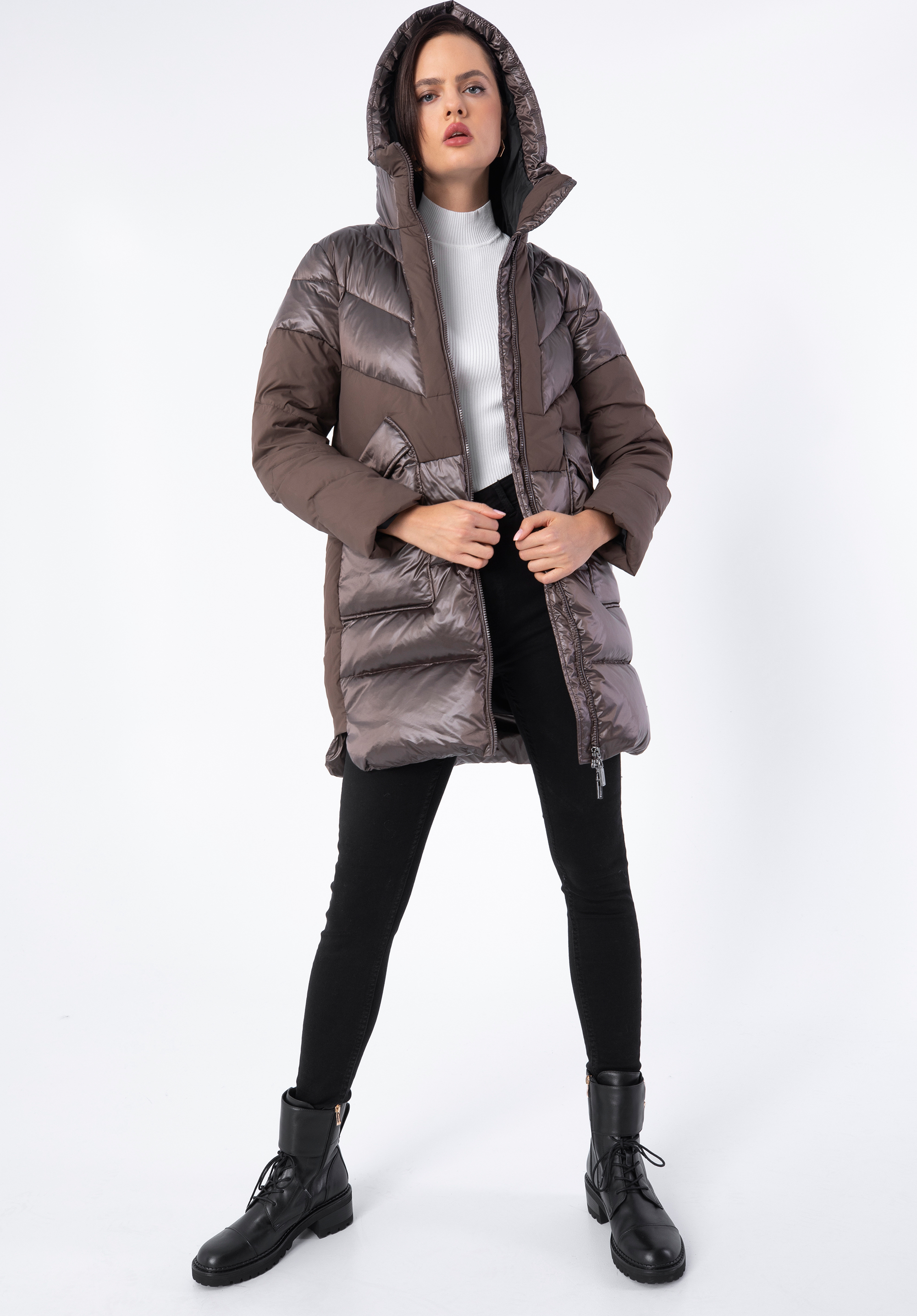Damski płaszcz puchowy z łączonych materiałów z kapturem beżowy
