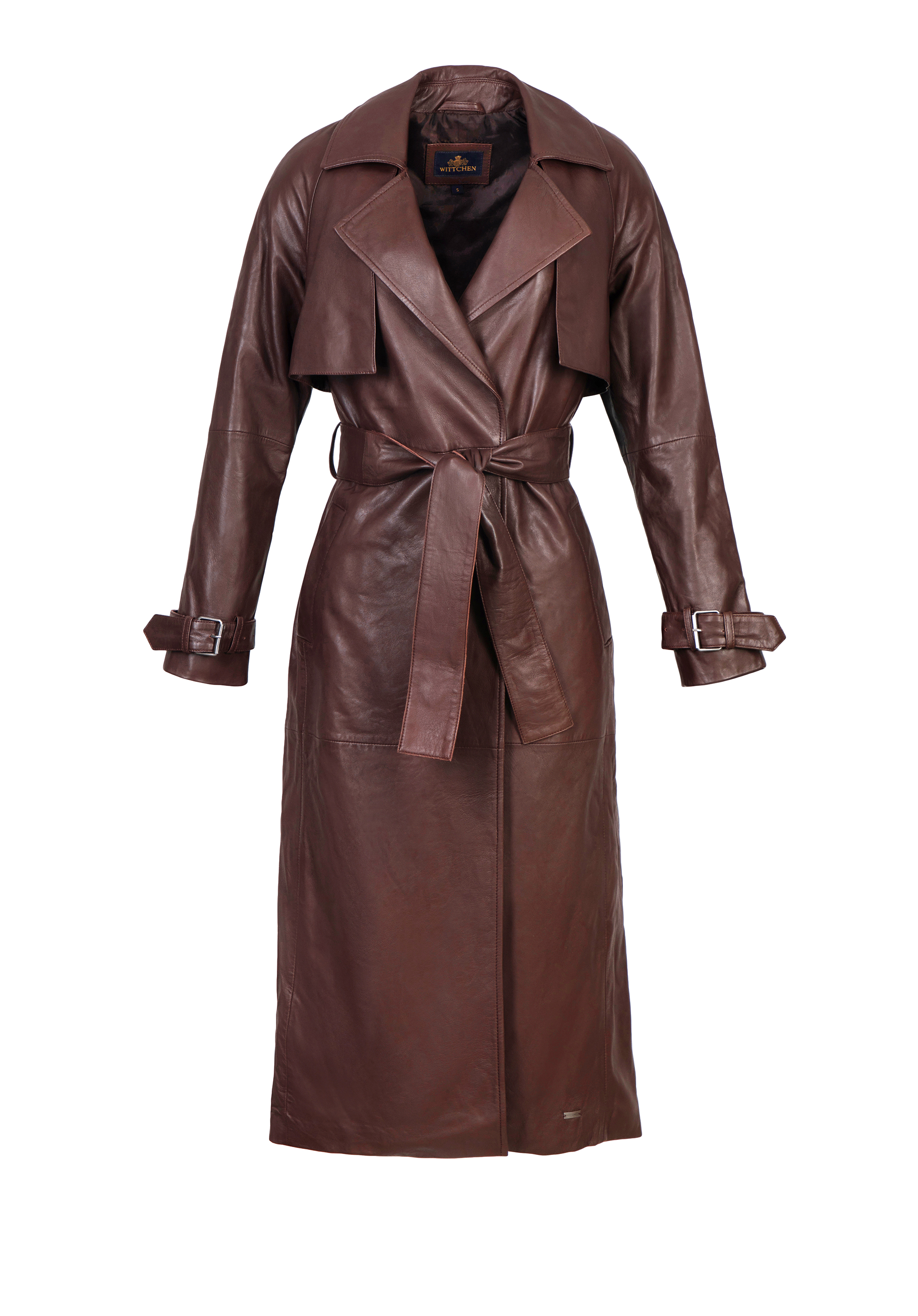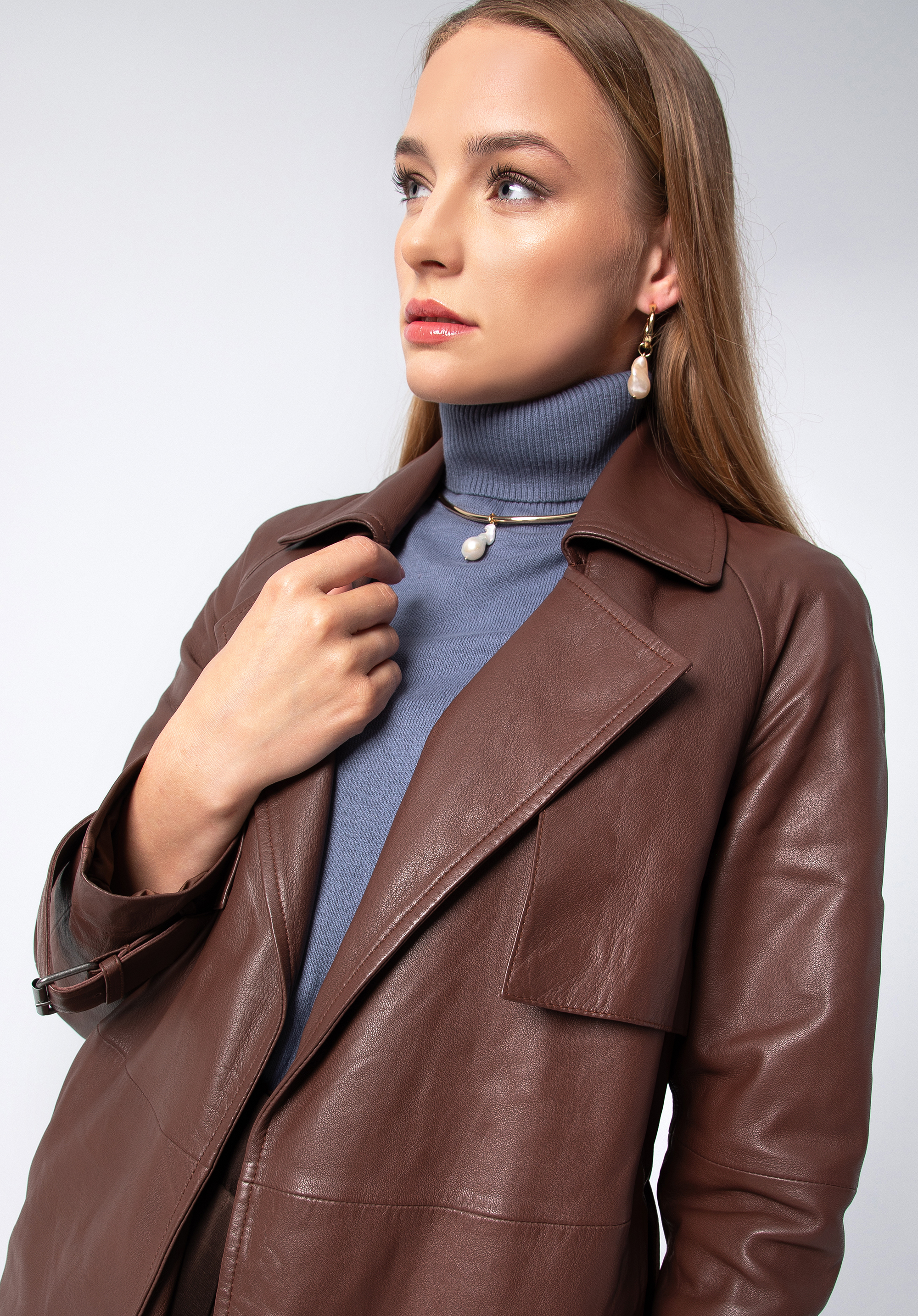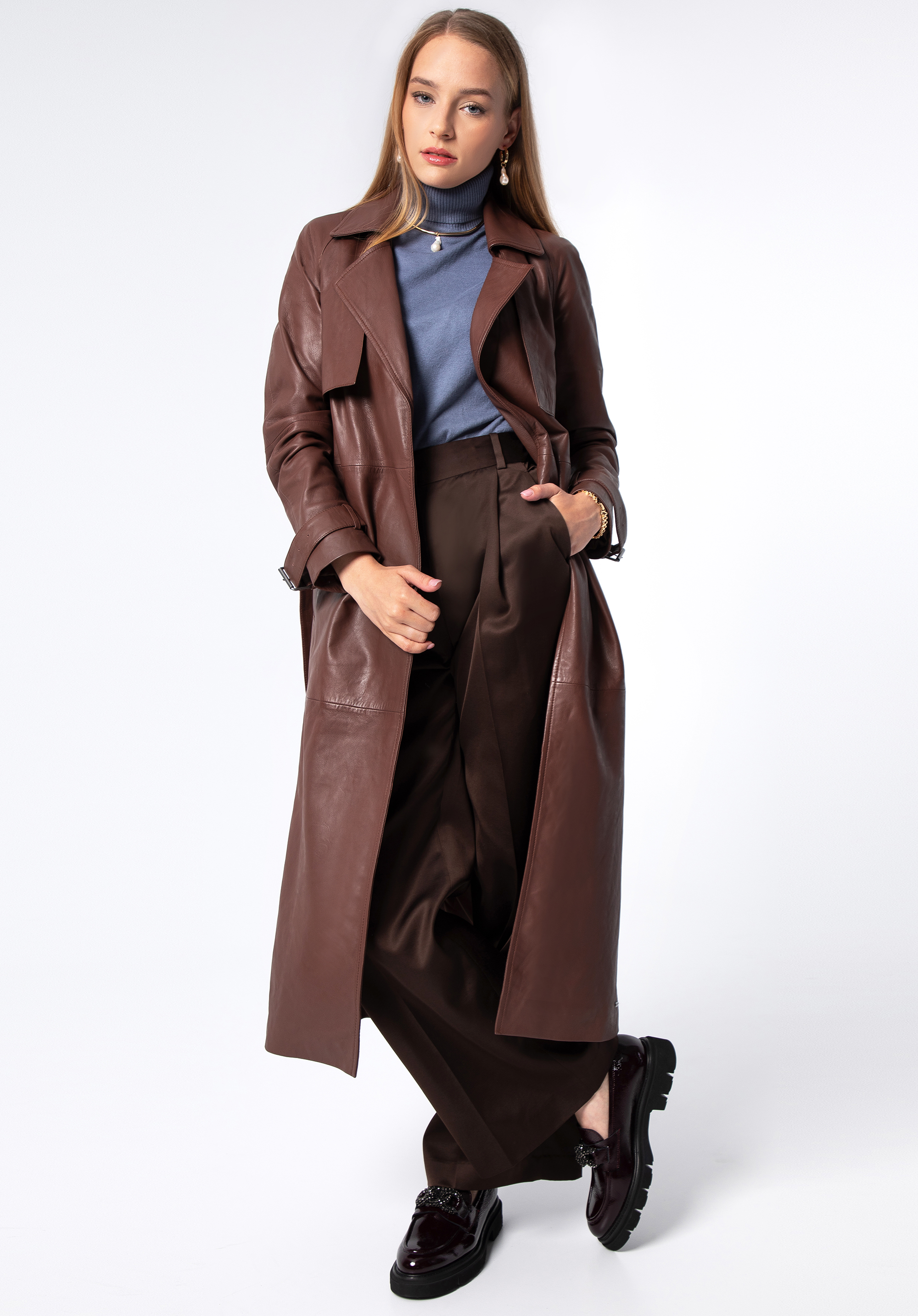 wykładany kołnierz, wewnętrzne pionowe kieszenie oraz pasek w talii, pięknie podkreślający kobiece kształty. Tym, co wyróżnia nasz skórzany płaszcz spośród innych podobnych modeli, jest
