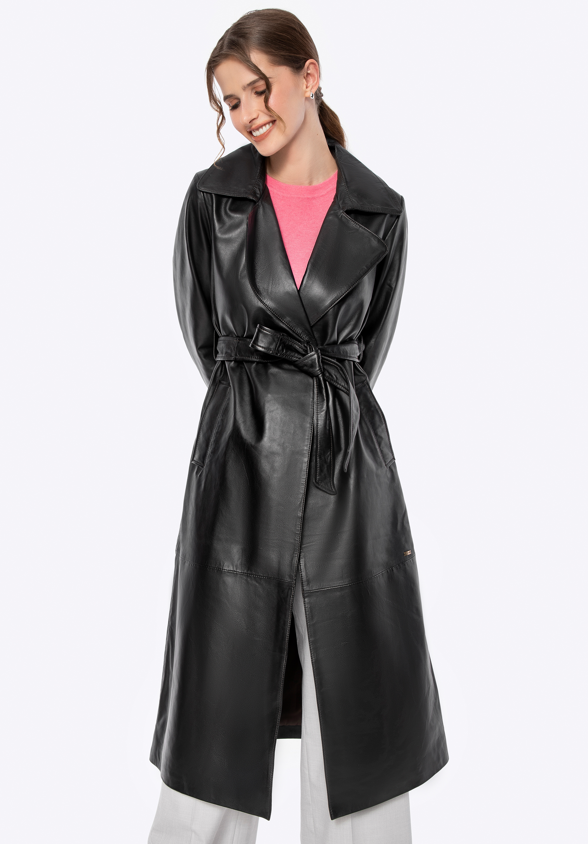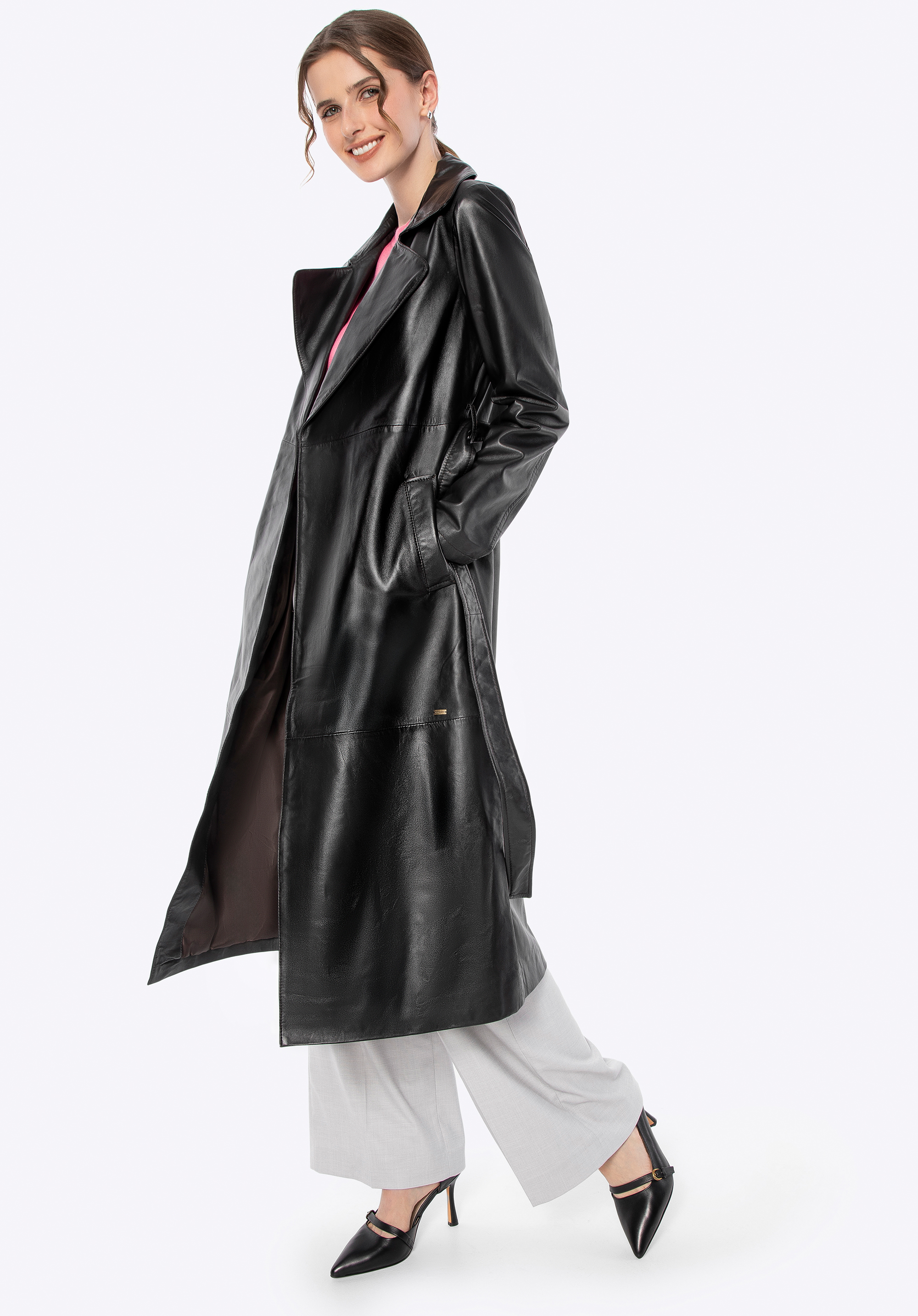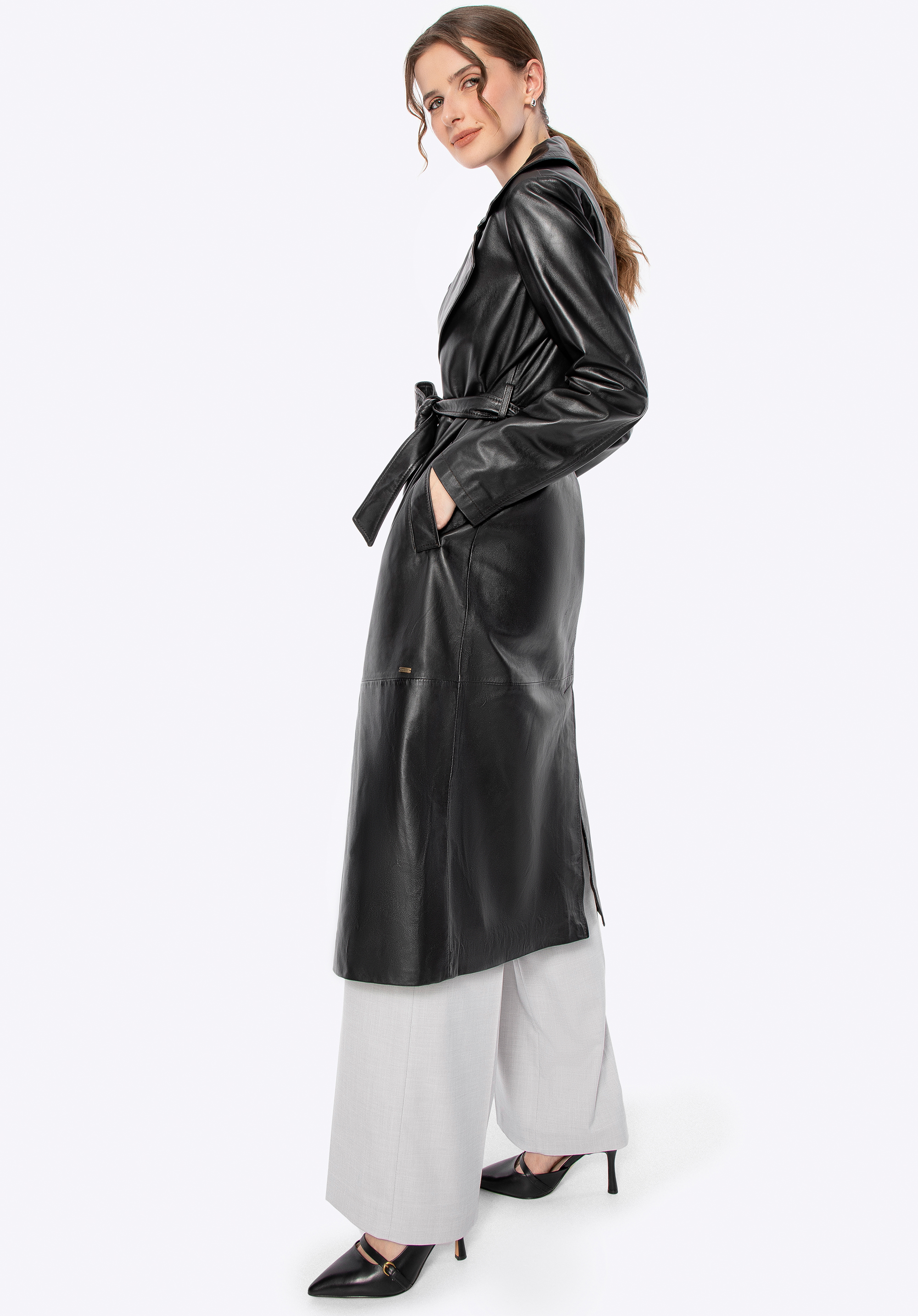 Zaprojektowany z myślą o kobiecie, która ceni subtelną elegancję i ponadczasowy styl, ten płaszcz z naturalnej skóry owczej to kwintesencja klasyki, wzbogacona o nowoczesne akcenty. Jego klasyczny krój subtelnie podkreśla sylwetkę, a pasek w talii daje Ci pełną kontrolę nad dopasowaniem, zapewniając maksymalny komfort. Delikatne metalowe logo na boku i praktyczne, pionowe kieszenie nadają mu niepowtarzalnego charakteru, a kołnierz rewers sprawia, że ten płaszcz jest zawsze na czasie.