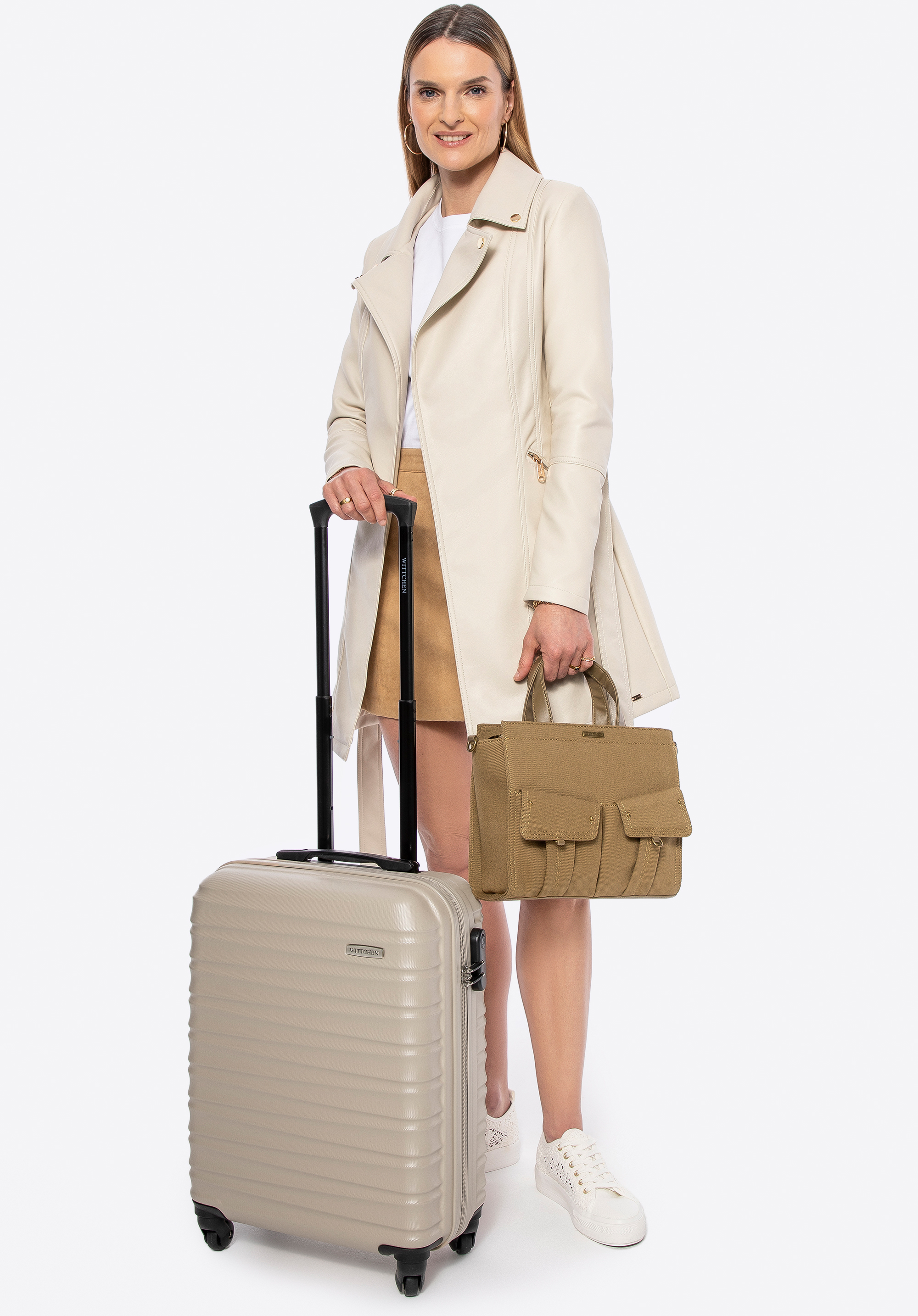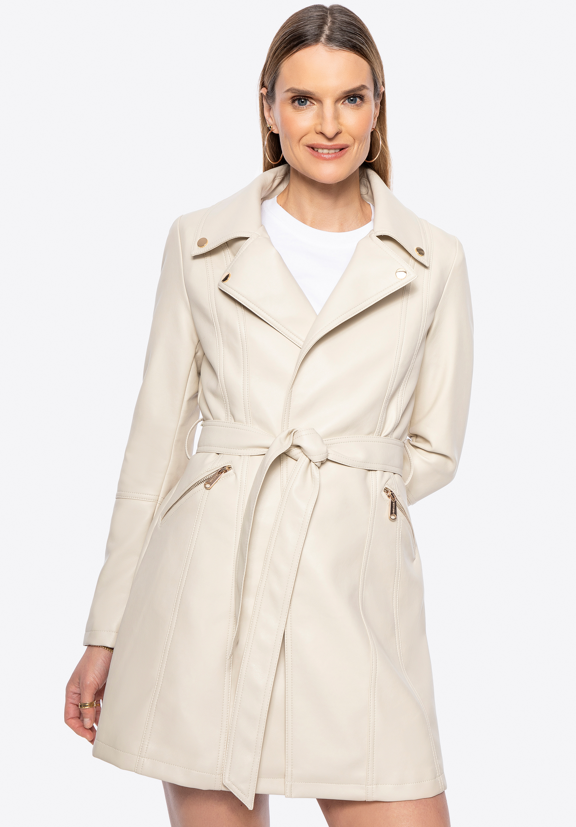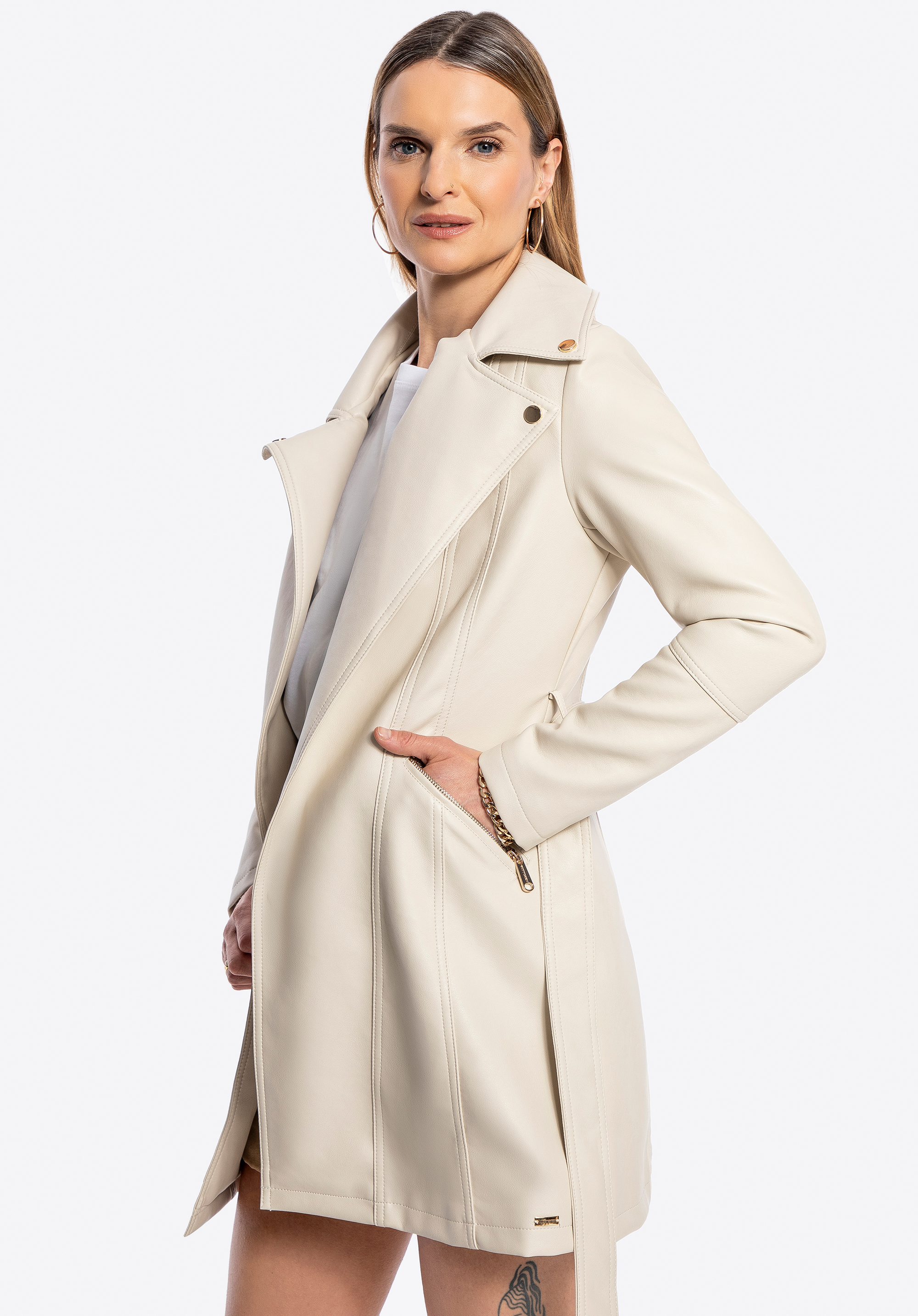 Metaliczne akcenty, perfekcyjny krój i ponadczasowy charakter – ten płaszcz z ekoskóry to absolutny must-have w Twojej garderobie! Model wiązany w talii paskiem doskonale podkreśla sylwetkę, a dwie praktyczne kieszenie na zamek to nie tylko funkcjonalny detal, ale także element, który nadaje płaszczowi nowoczesny design. Subtelne metalowe logo producenta na boku wprowadzają stylowy akcent, dopełniając całość. To płaszcz, który wyraża pewność siebie i siłę charakteru – idealny wybór dla kobiet, które wiedzą, czego chcą!