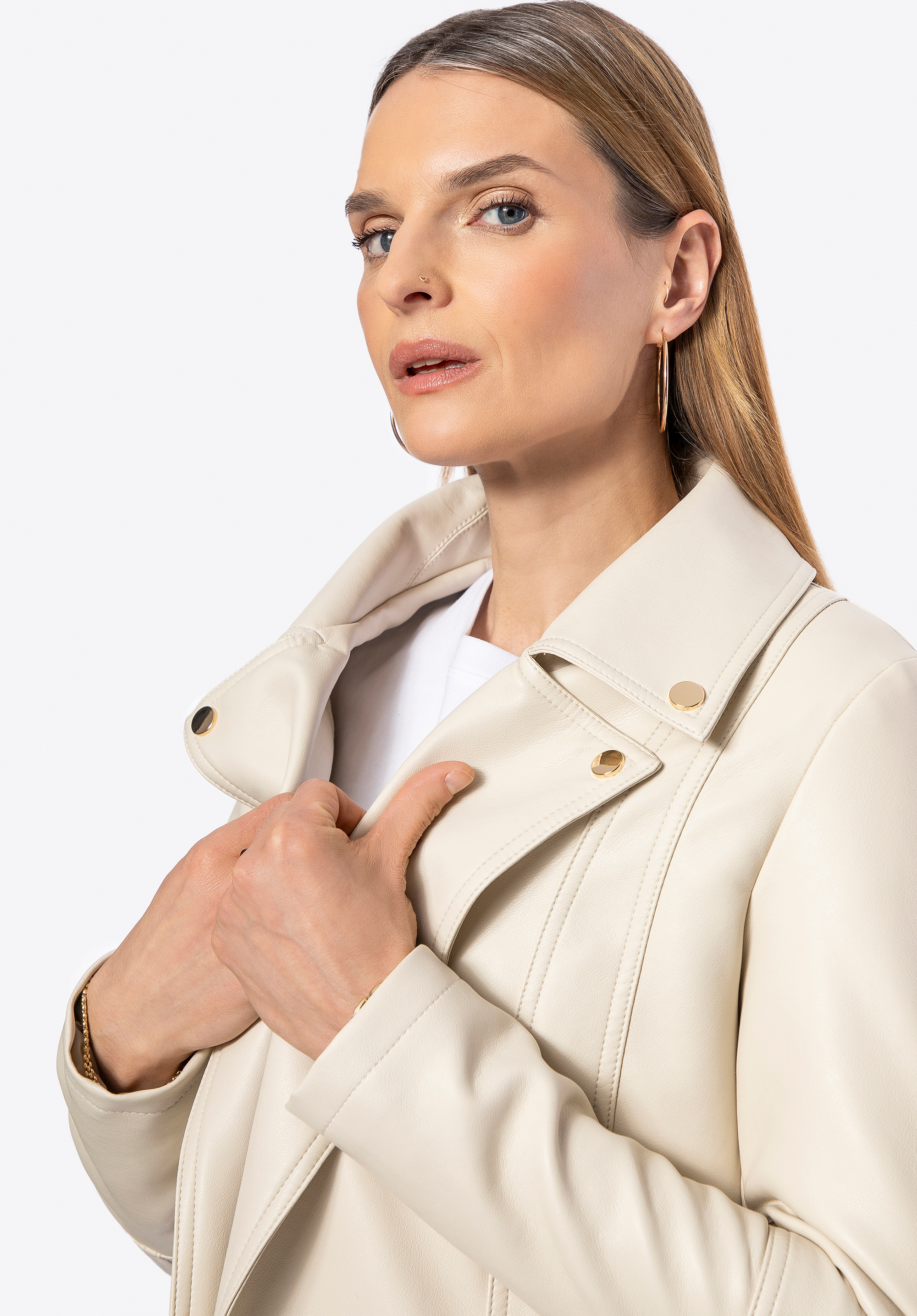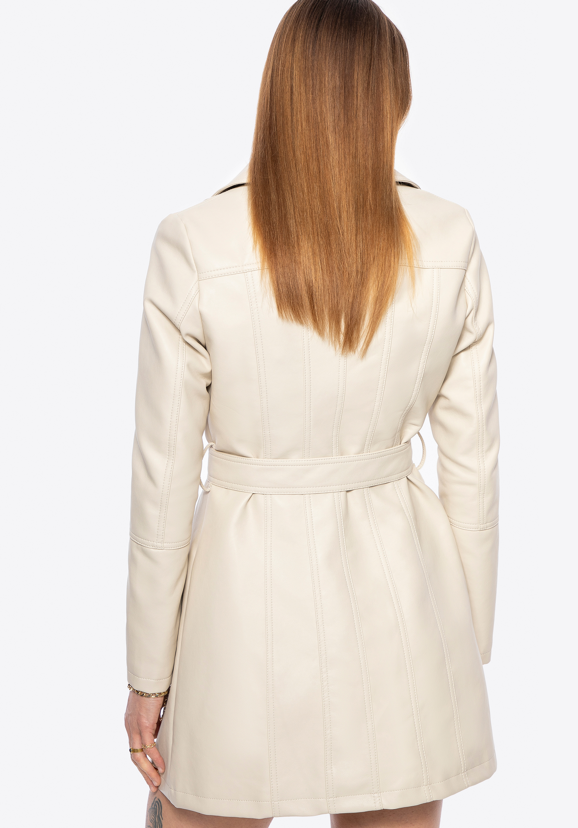- Materiał: Ekoskóra, z której wykonano płaszcz, jest elegancka i odporna na zabrudzenia, co zapewnia długotrwałość produktu.