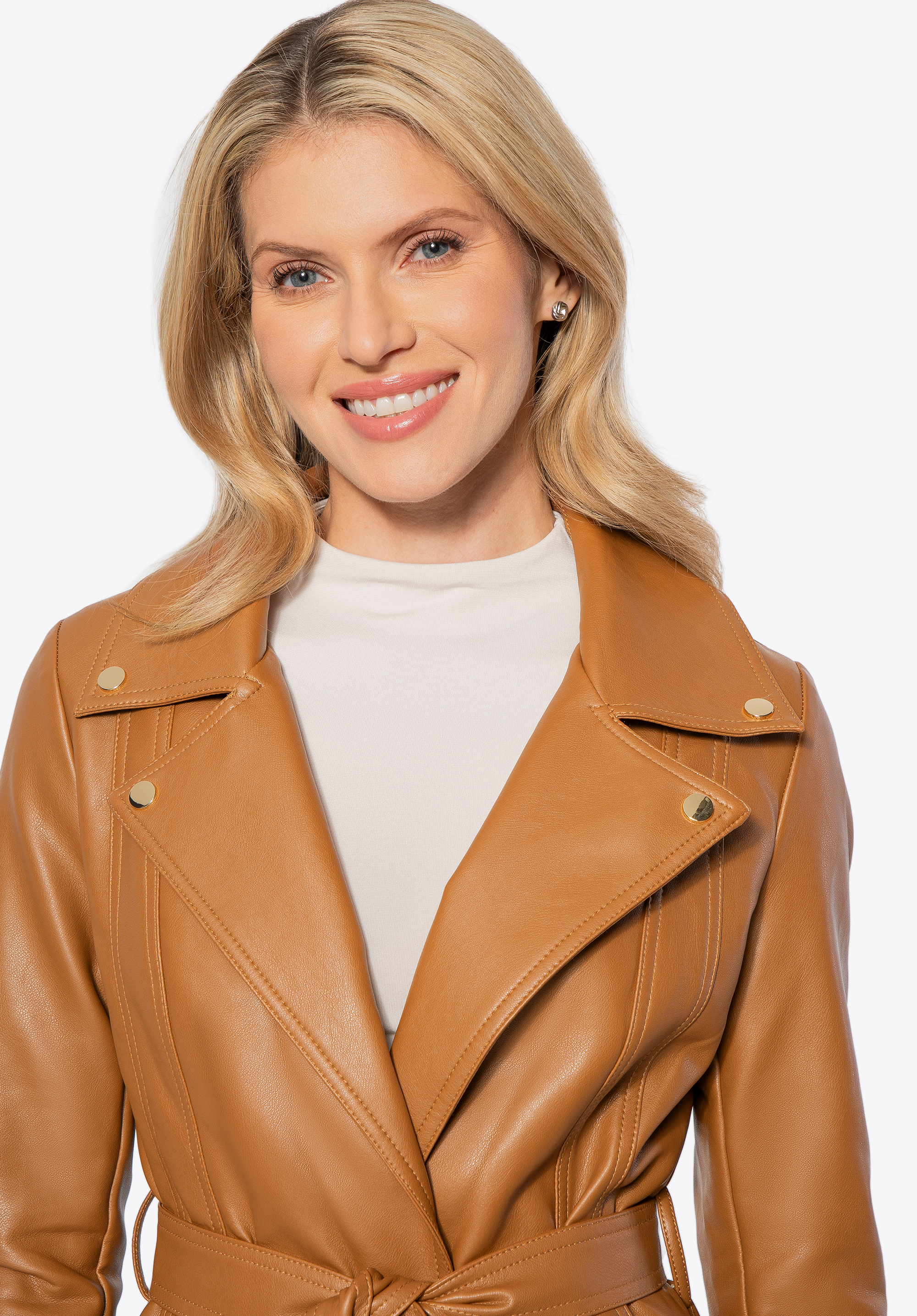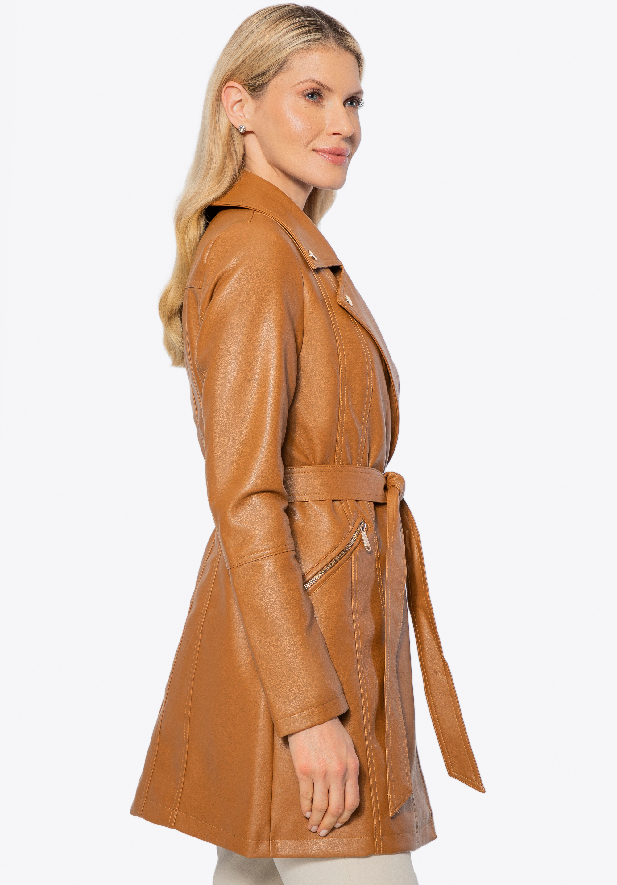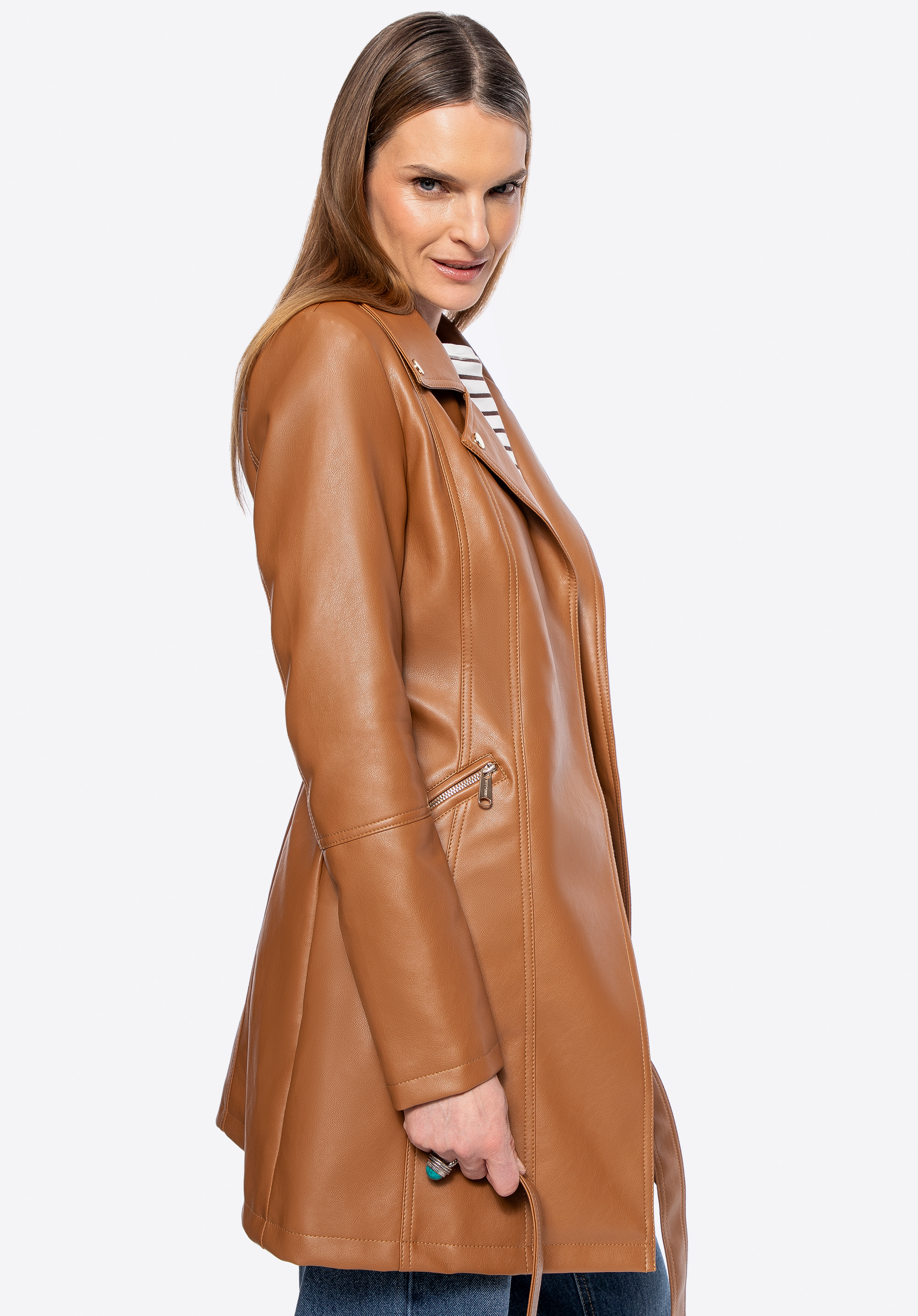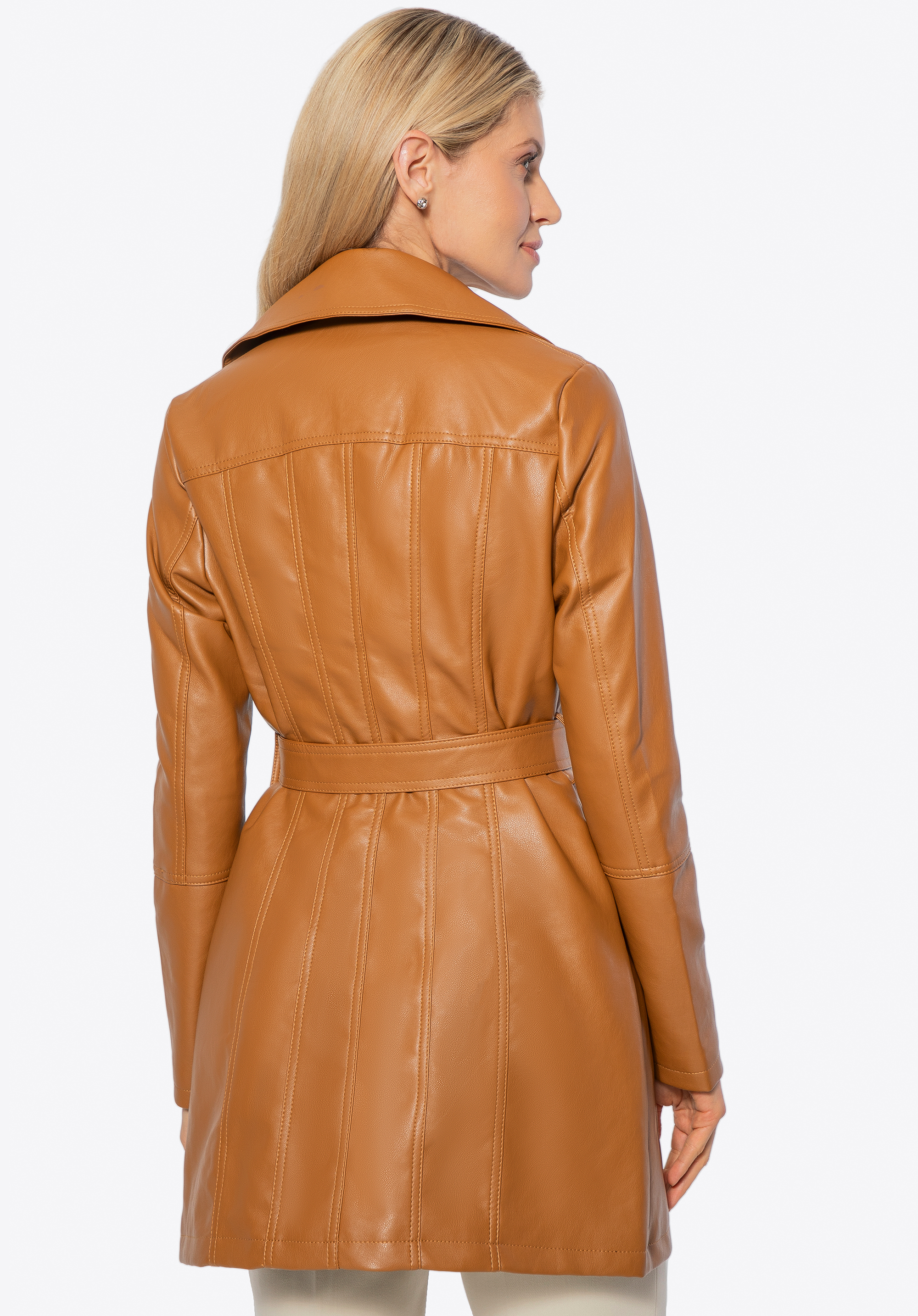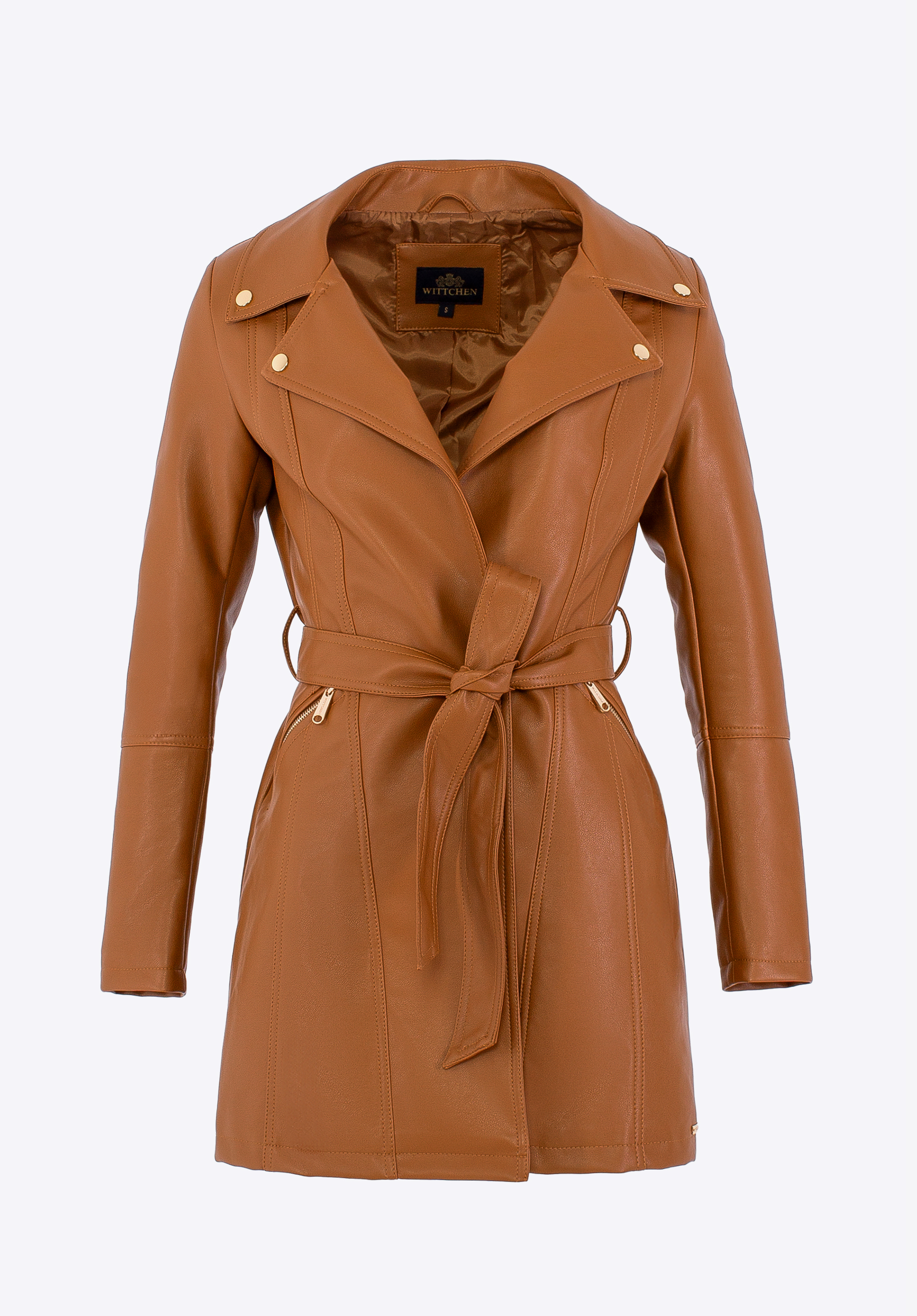 - Materiał: Ekoskóra, z której wykonano płaszcz, jest elegancka i odporna na zabrudzenia, co zapewnia długotrwałość produktu.