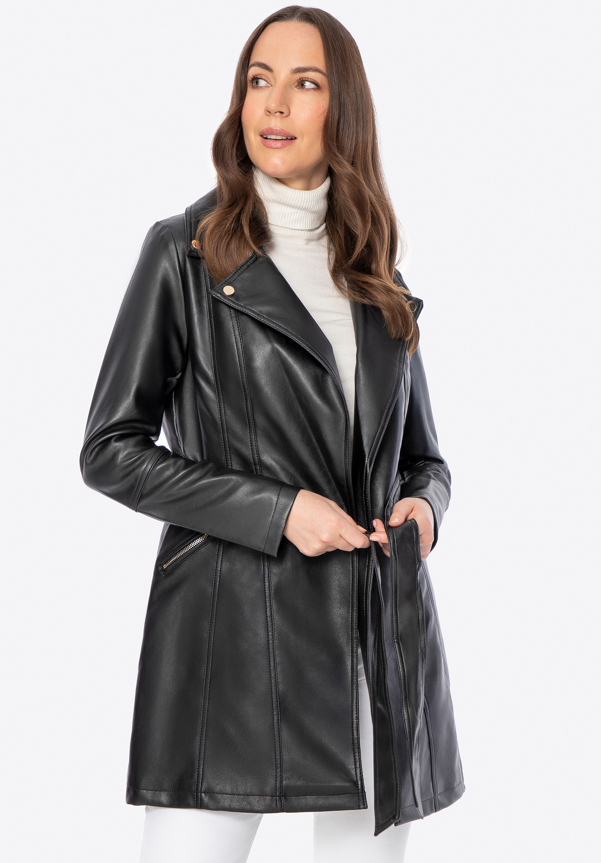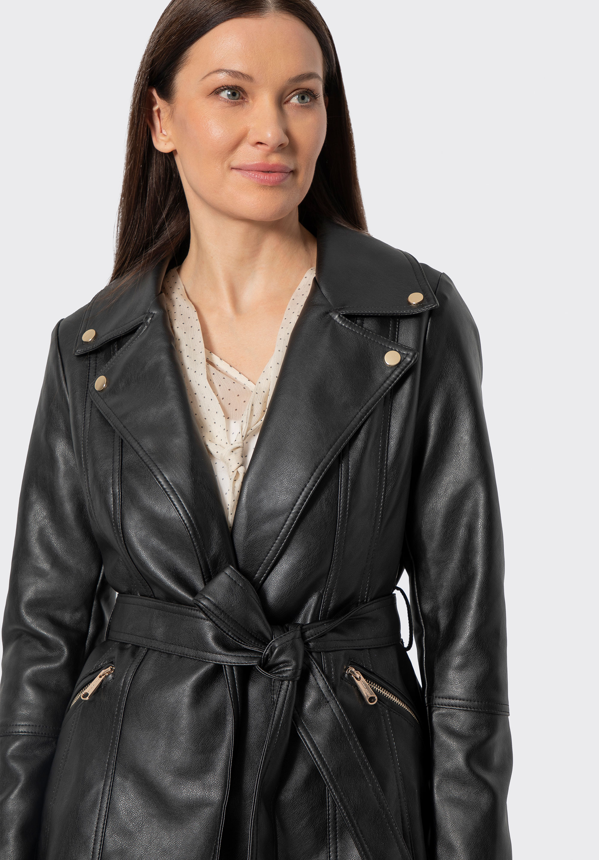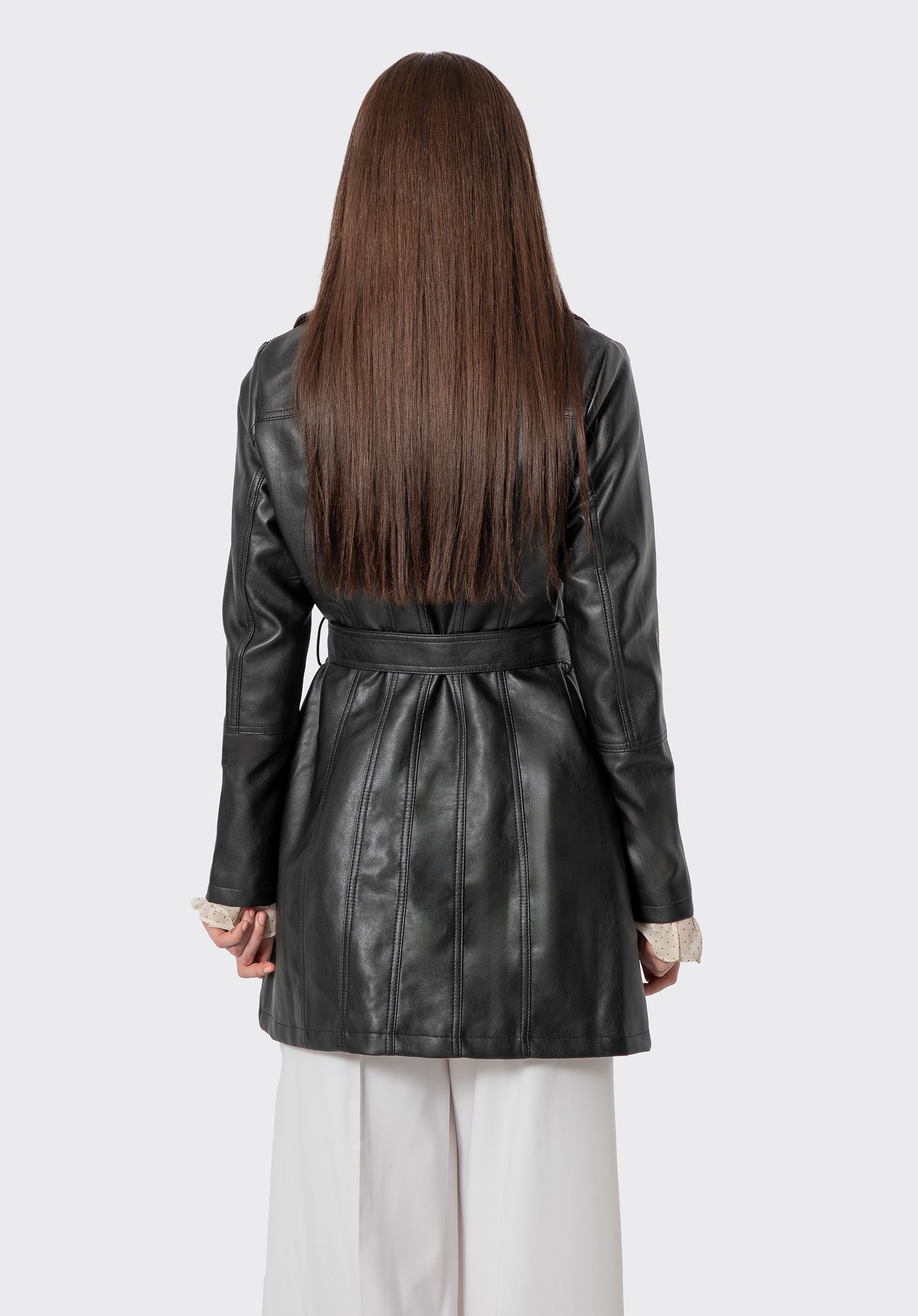 - Materiał: Ekoskóra, z której wykonano płaszcz, jest elegancka i odporna na zabrudzenia, co zapewnia długotrwałość produktu.