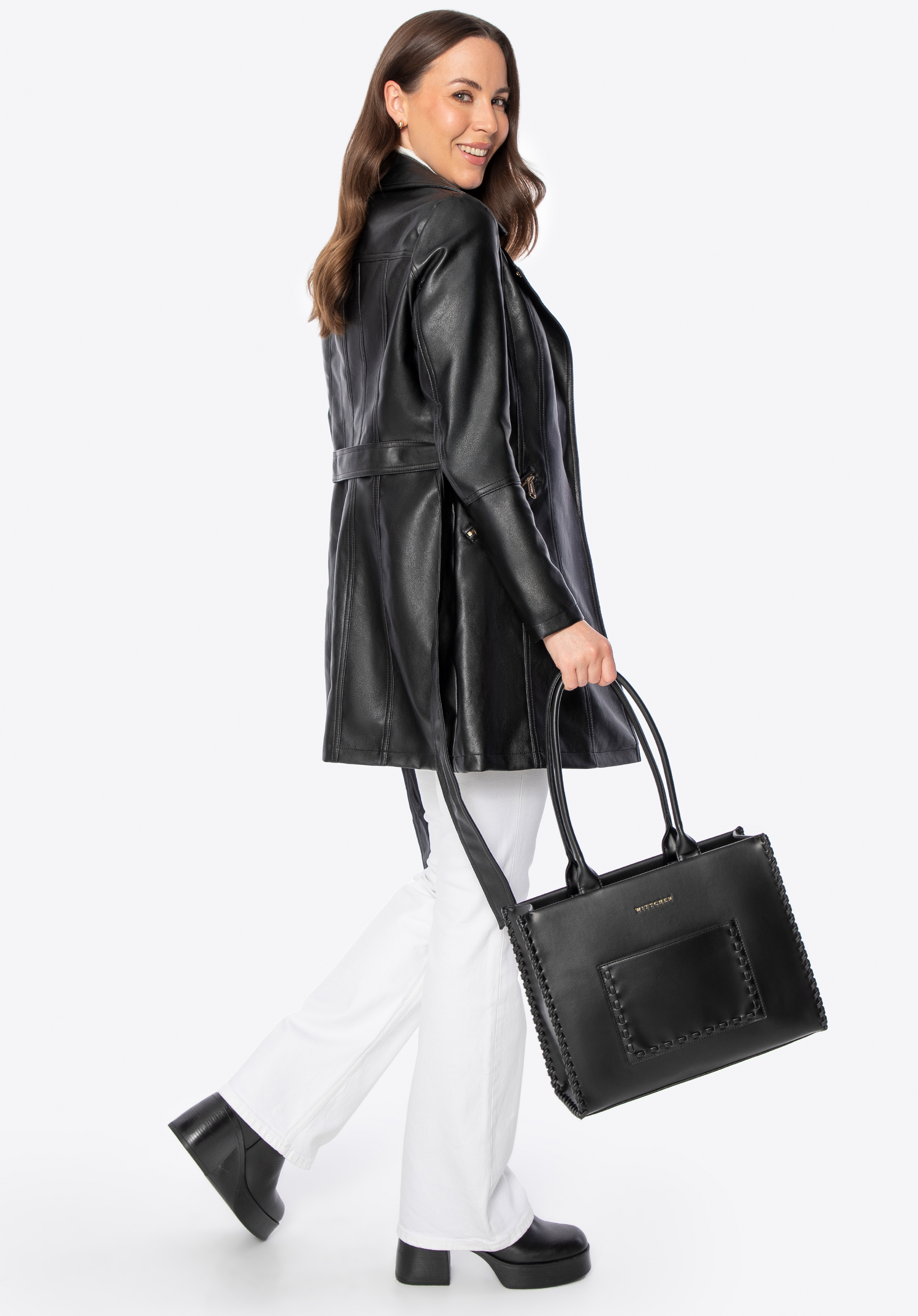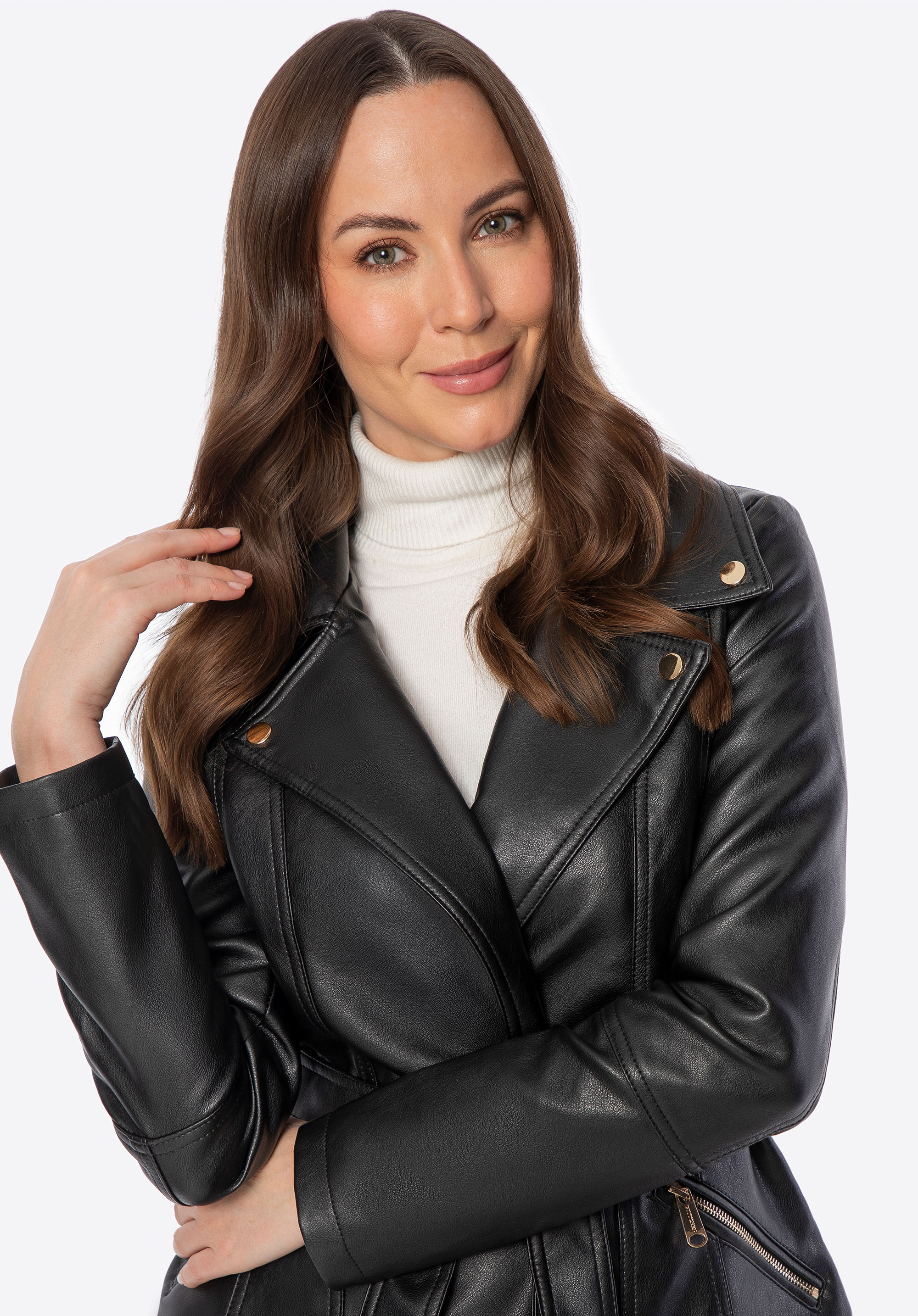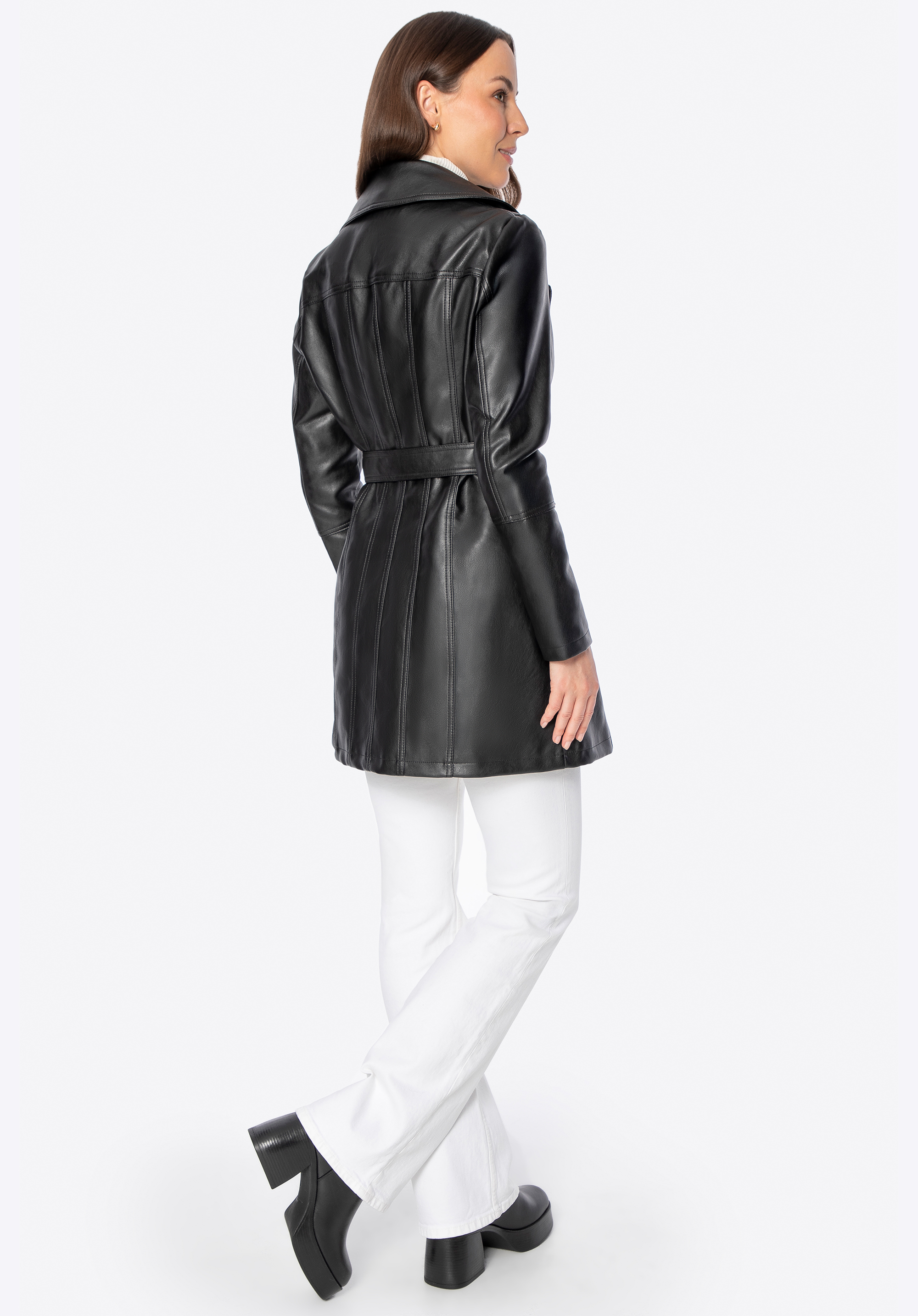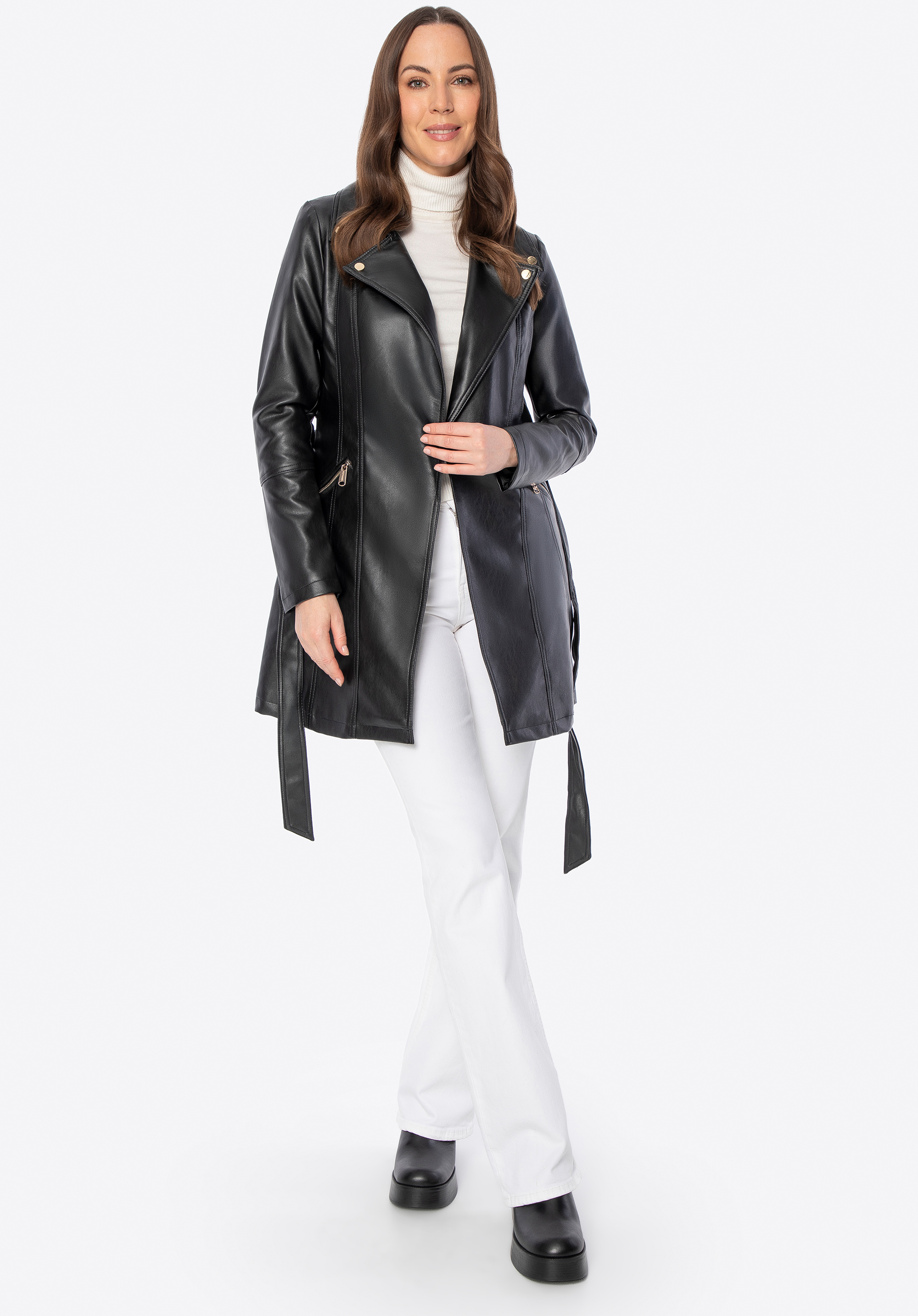 - Materiał: Ekoskóra, z której wykonano płaszcz, jest elegancka i odporna na zabrudzenia, co zapewnia długotrwałość produktu.