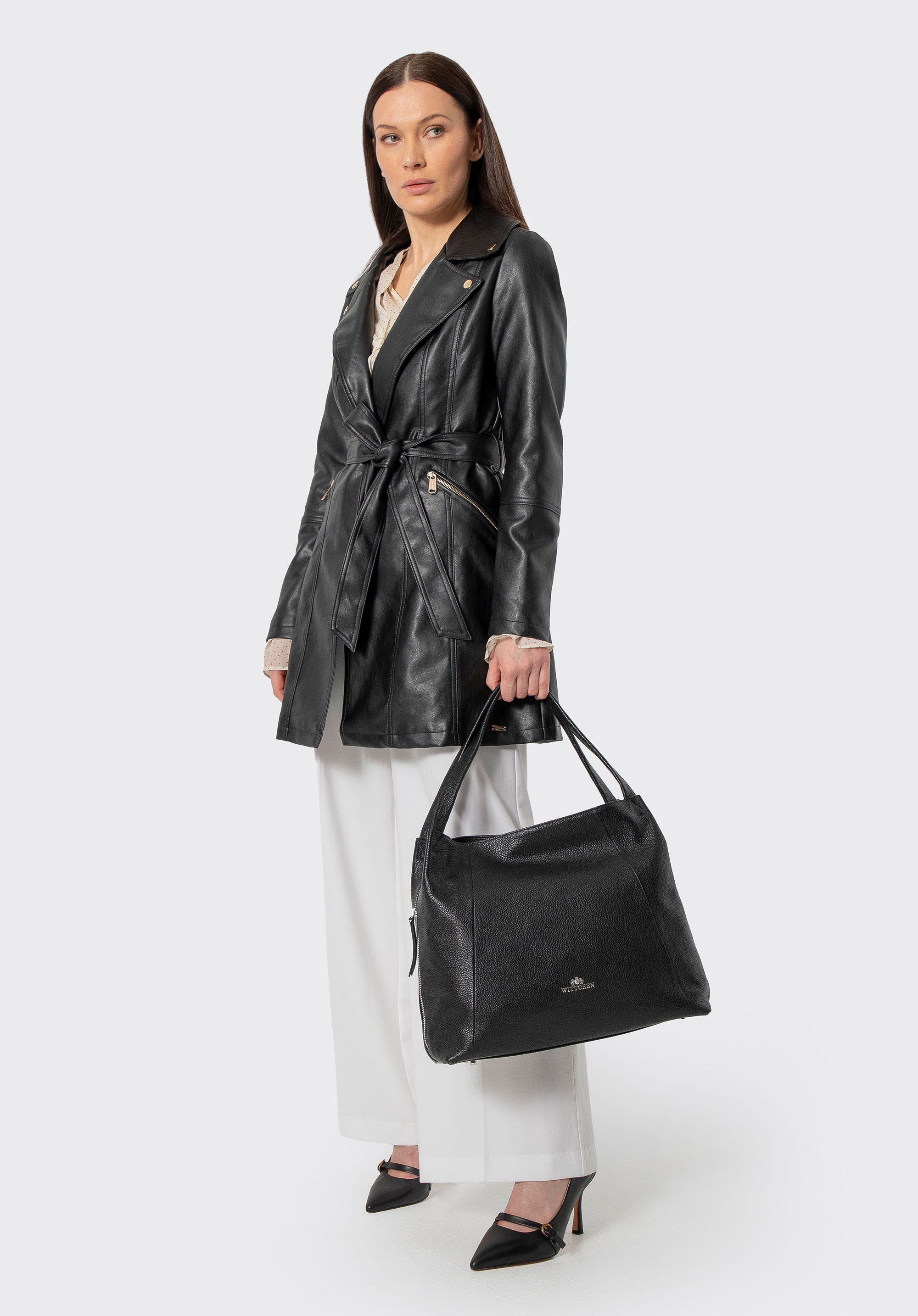 Metaliczne akcenty, perfekcyjny krój i ponadczasowy charakter – ten płaszcz z ekoskóry to absolutny must-have w Twojej garderobie! Model wiązany w talii paskiem doskonale podkreśla sylwetkę, a dwie praktyczne kieszenie na zamek to nie tylko funkcjonalny detal, ale także element, który nadaje płaszczowi nowoczesny design. Subtelne metalowe logo producenta na boku wprowadzają stylowy akcent, dopełniając całość. To płaszcz, który wyraża pewność siebie i siłę charakteru – idealny wybór dla kobiet, które wiedzą, czego chcą!